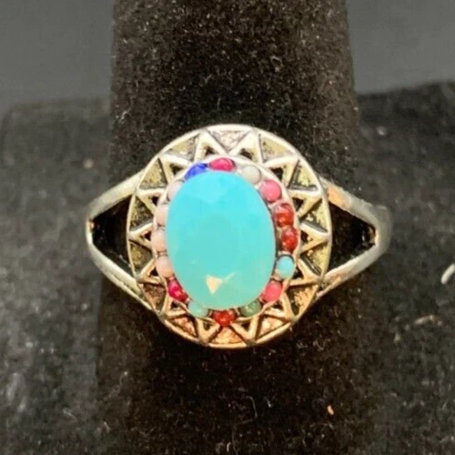 Vintage Antique Silver Tone Blue CZ Rhinestone Cocktail Ring - Size 8