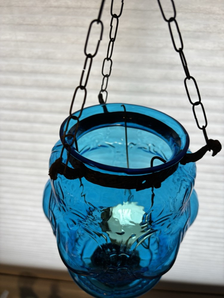 This is an old glass and metal hanging tea light holder in a pretty aqua . Metal tea light holder has some rust. There is a Metal band around top as well as metal bottom with tiny finial. Item is in very nice vintage condition with no chips or cracks detected. The aqua color is unique. Item will be double boxed for shipping. This item measures about 14 inches not including very top chain links.