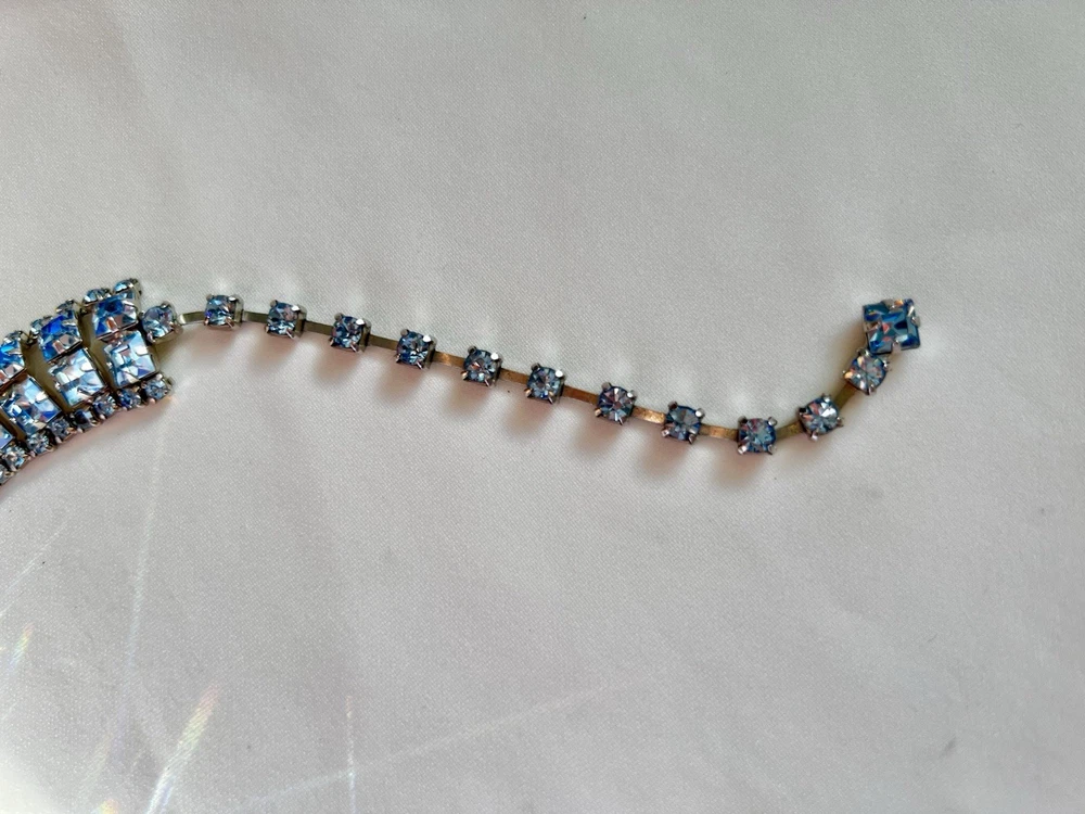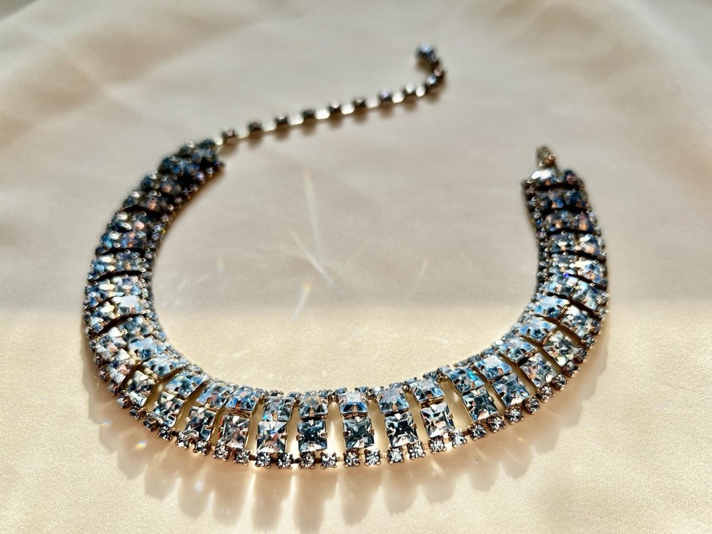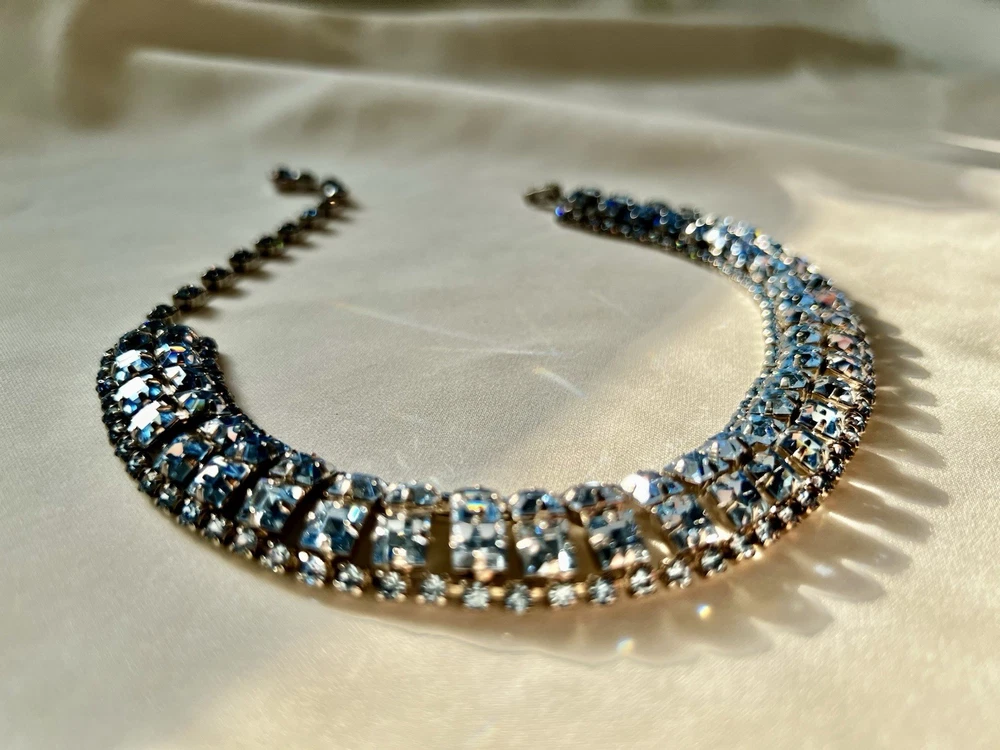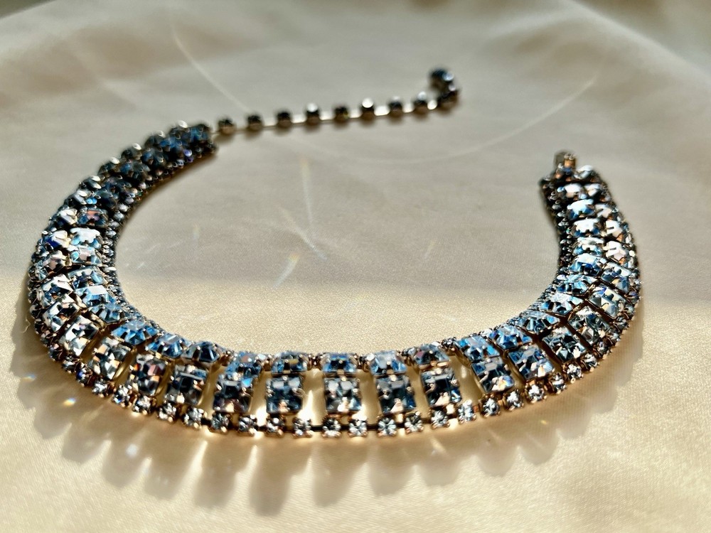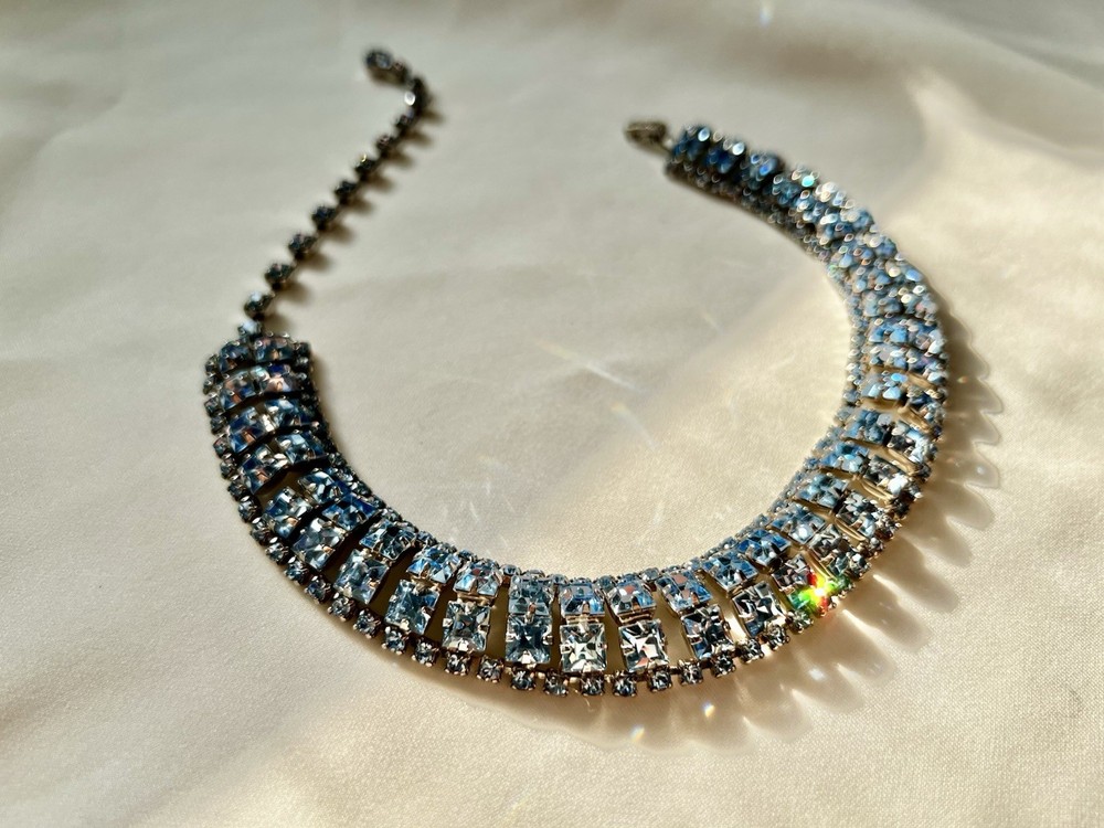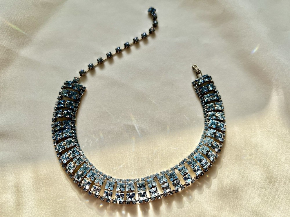 This vintage aquamarine blue rhinestone crystal choker necklace features a prong set design, making it a stunning accessory for women. The necklace is a true statement piece with a vibrant blue color and adjustable length of 15 inches, perfect for adding a touch of glamour to any outfit. Crafted in the United States, this original piece of fashion jewelry is a timeless addition to any jewelry collection, blending classic style with a hint of vintage charm.