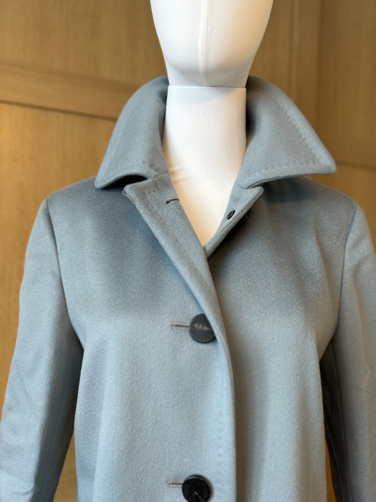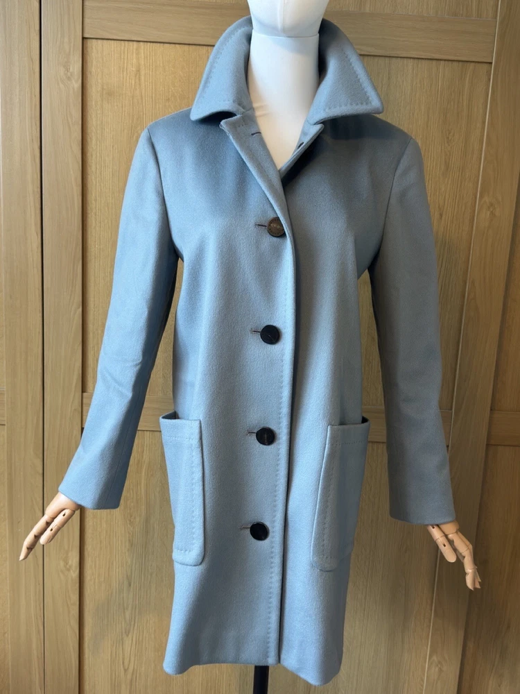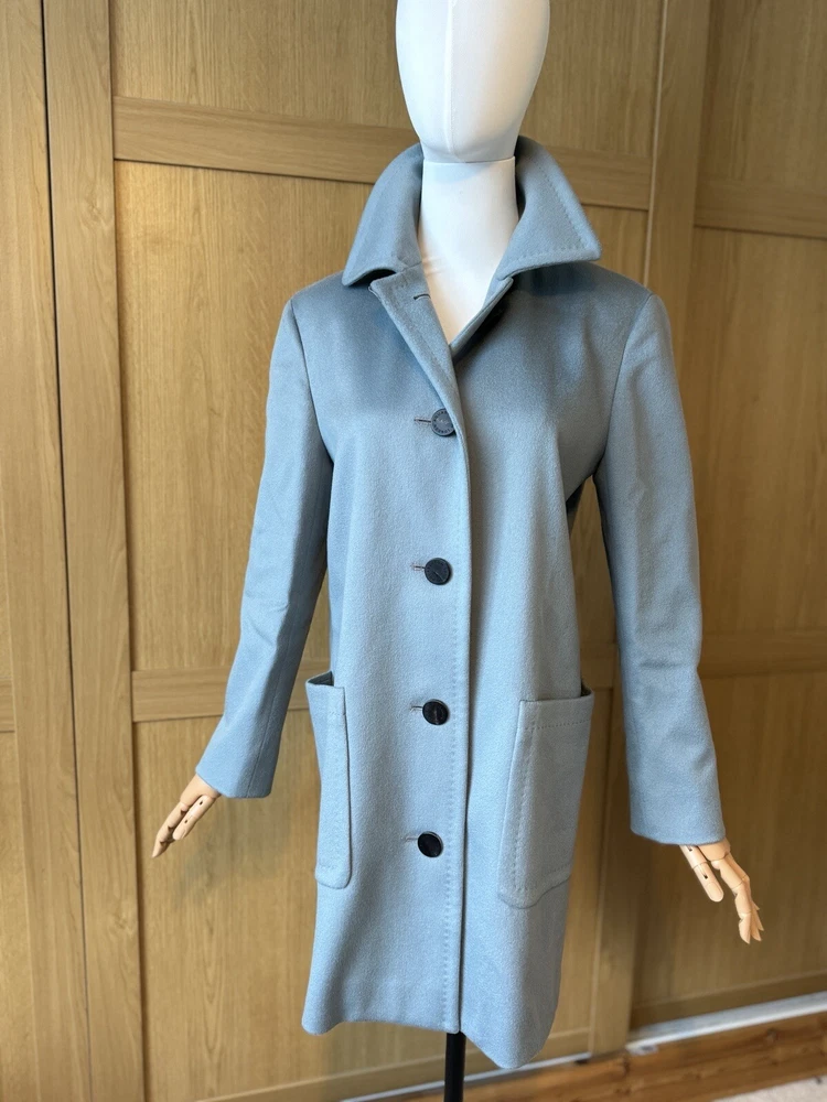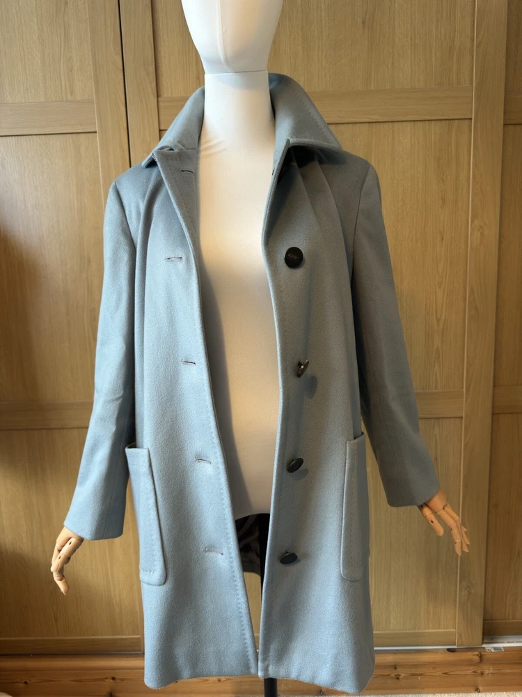 Add a touch of vintage to your wardrobe with this gorgeous Aquascutum pea coat. Made of 100% wool in a stunning duck egg blue colour, this single-breasted coat features a button closure, collared neckline, and long sleeves with shoulder pads. It also has front pockets and a back slit for added comfort and style. The 3/4 length coat is perfect for winter and spring occasions, whether you're travelling or going to work. The coat is fully lined with acetate, ensuring a comfortable and warm fit. It's a classic piece that will never go out of style, perfect for those who love the vintage look. This coat is a UK size 8 Uk. Tiny wear on the right shoulder & mark on the lining (see pictures for reference) overall good vintage condition