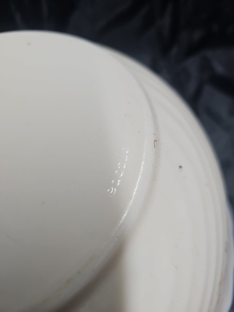 This is a vintage Arcopal France mixing/serving bowl in a large size, featuring a scalloped edge and a floral pattern called Victoria. The bowl is made of glass and is designed for serving purposes. It is an elegant and charming piece of decorative cookware and dinnerware from France.