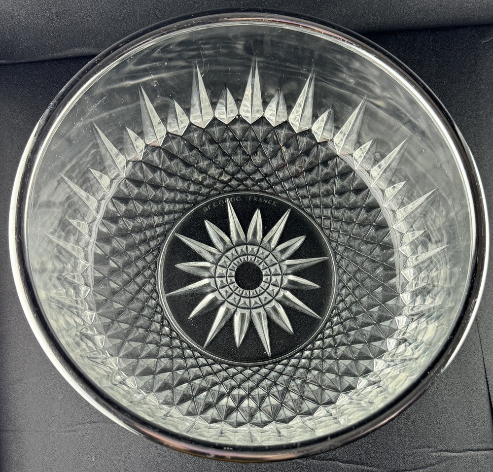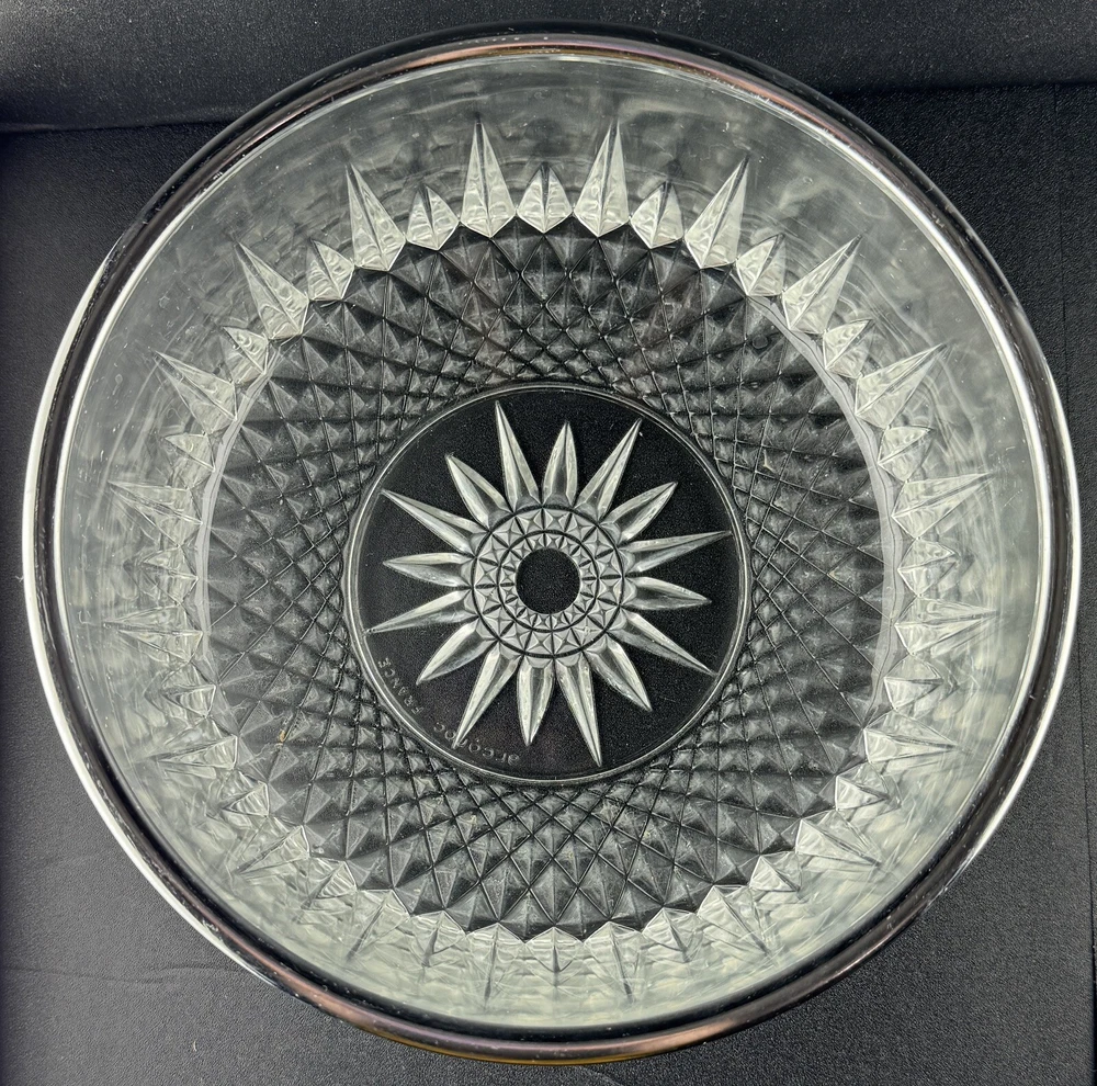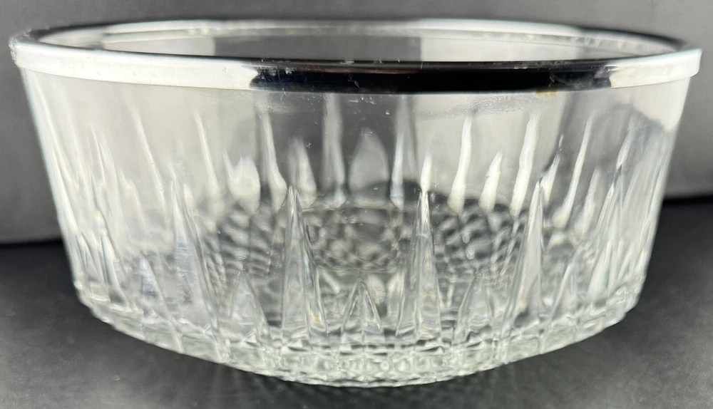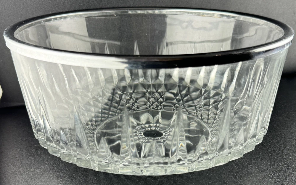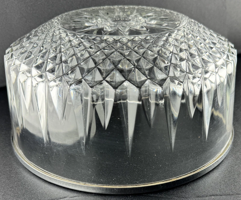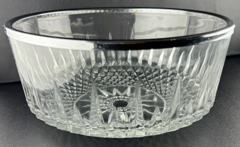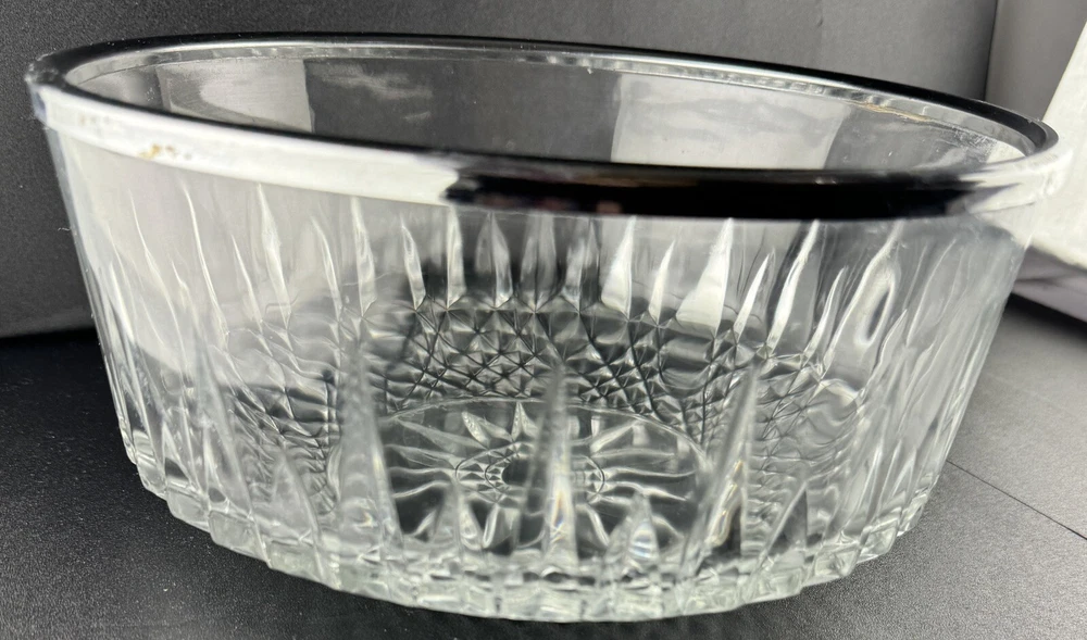 Has several scratches. The underside of the rim is discolored, see all photos. Approximately 9” wide and approximately 4 1/4” tall.