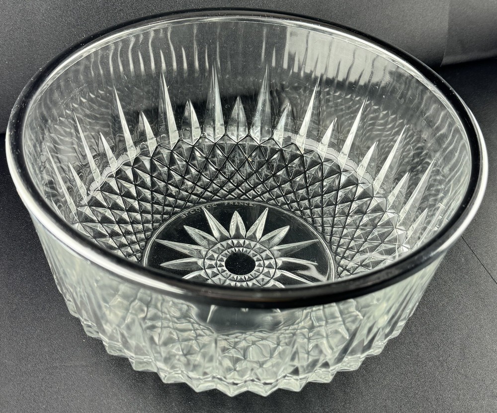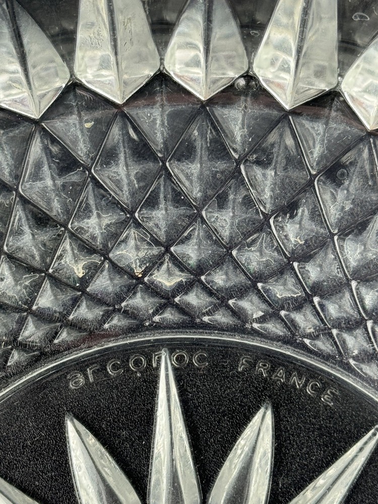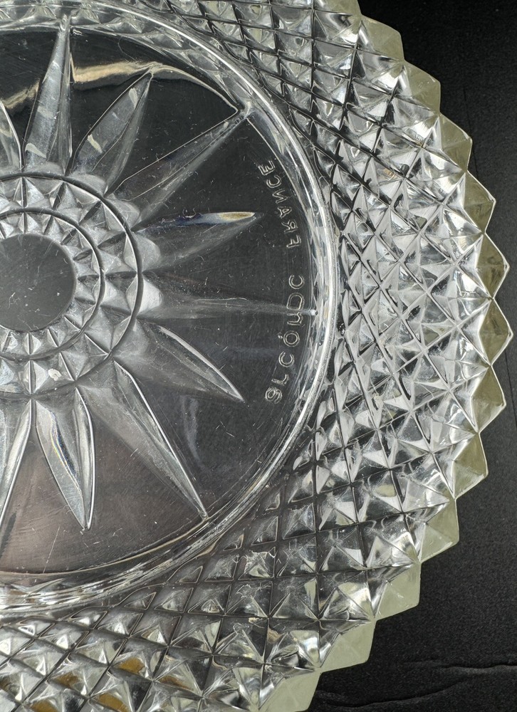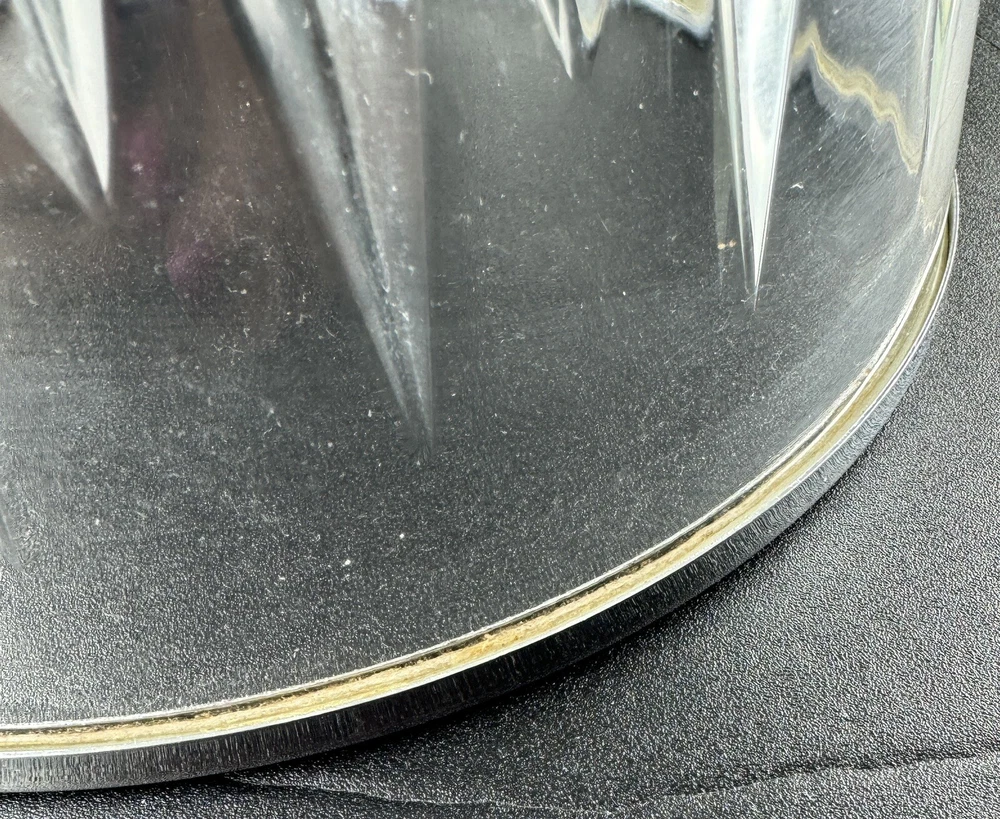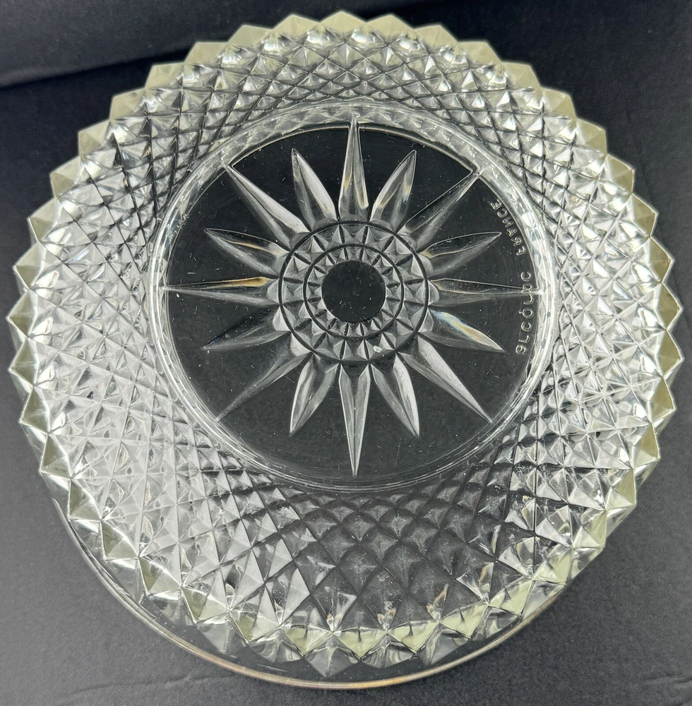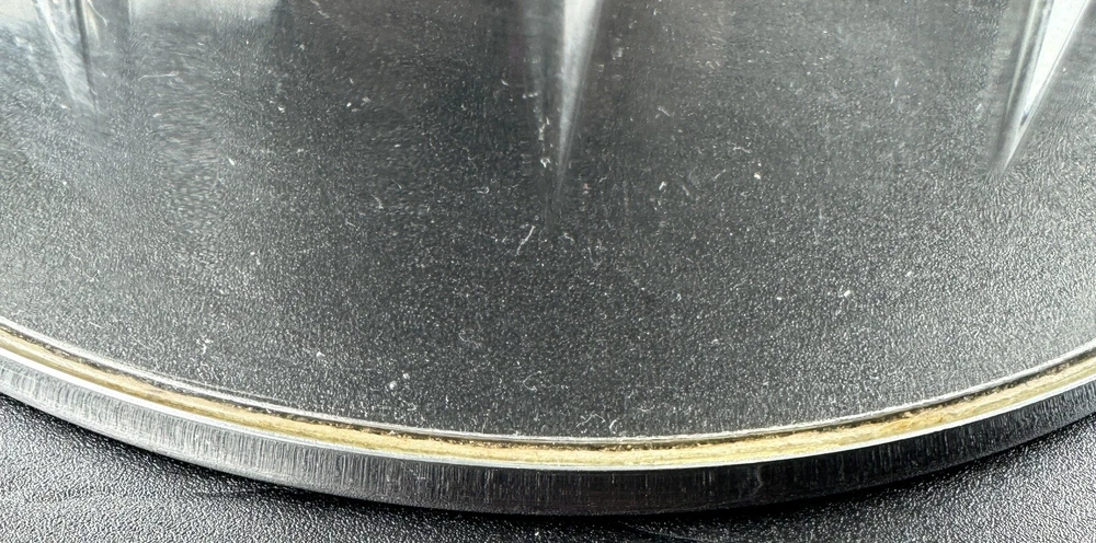 Has several scratches. The underside of the rim is discolored, see all photos. Approximately 9” wide and approximately 4 1/4” tall.