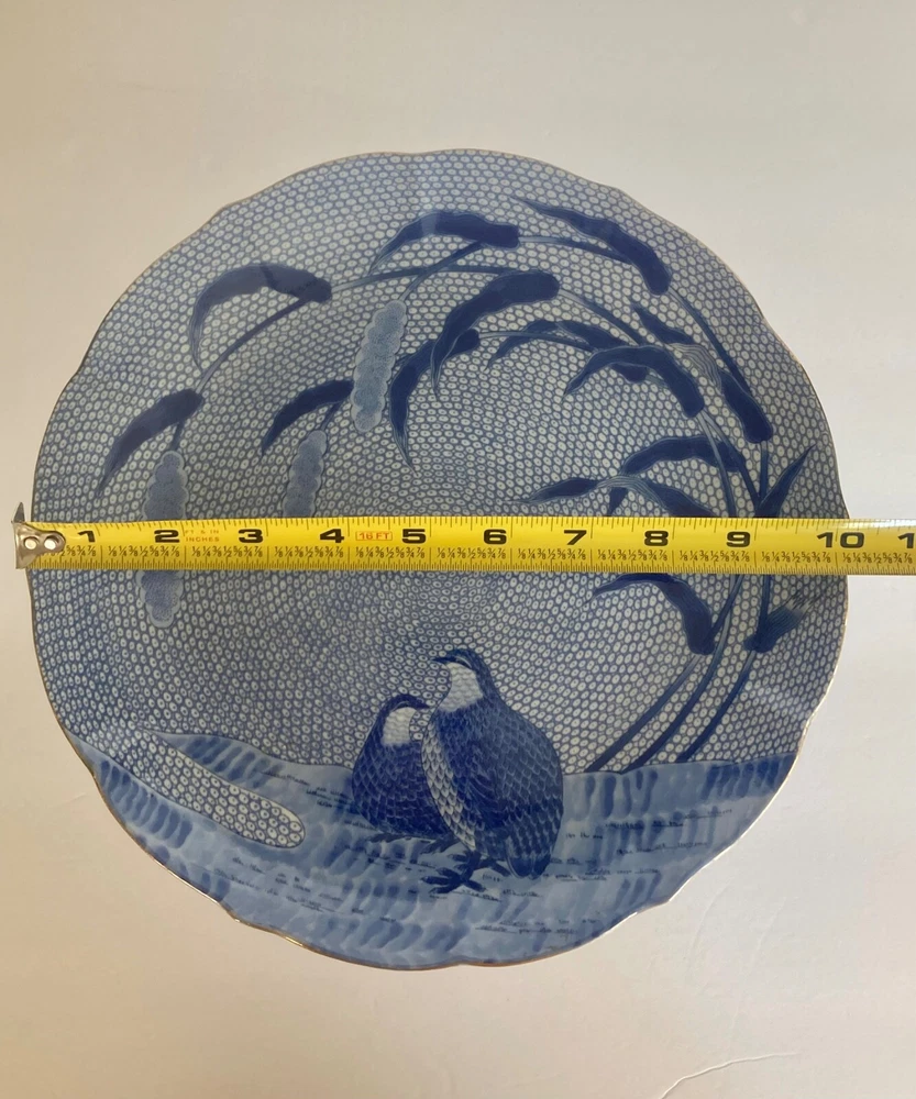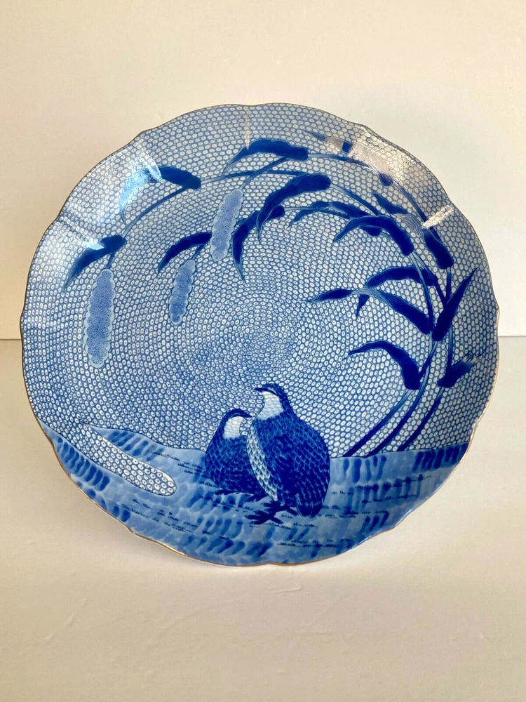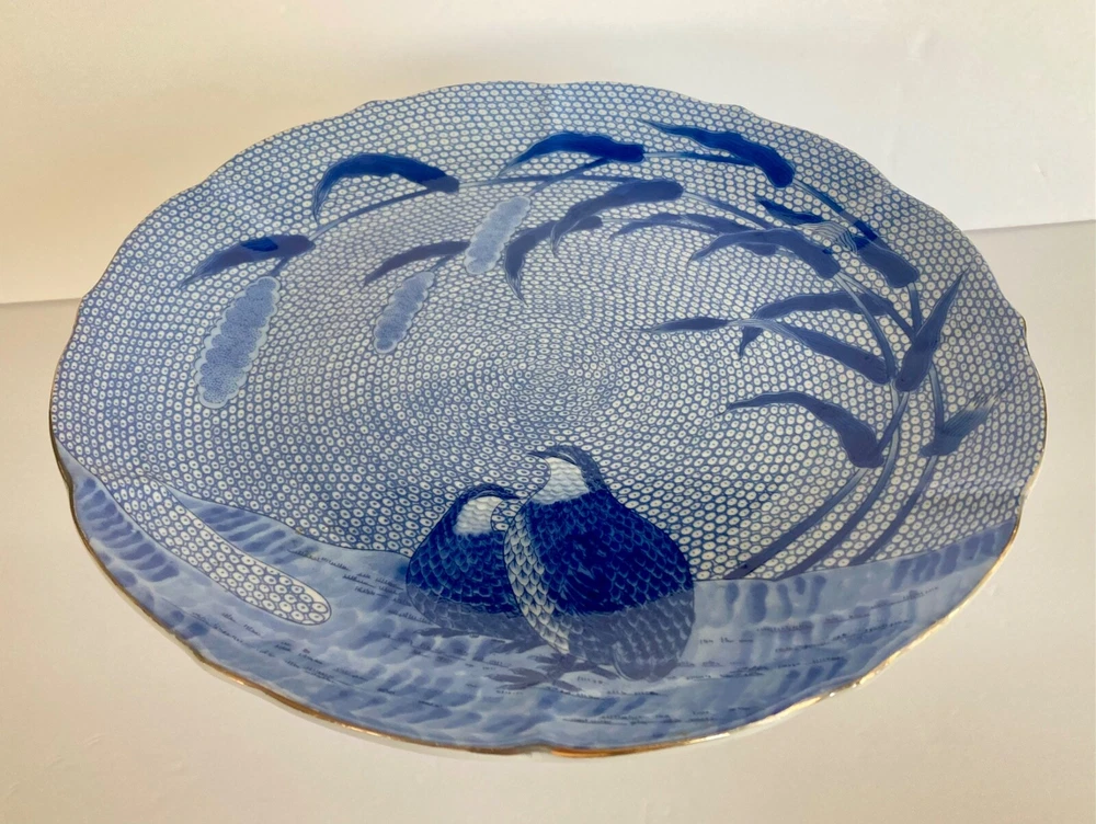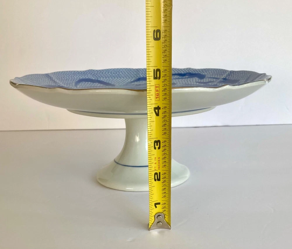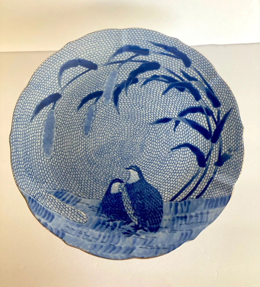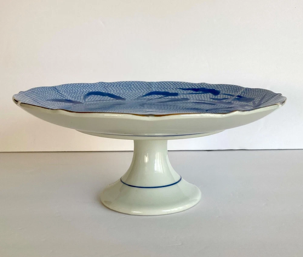 Vintage Arita Blue Chinese Quail Porcelain Cake Pedestal Plate~ Japan