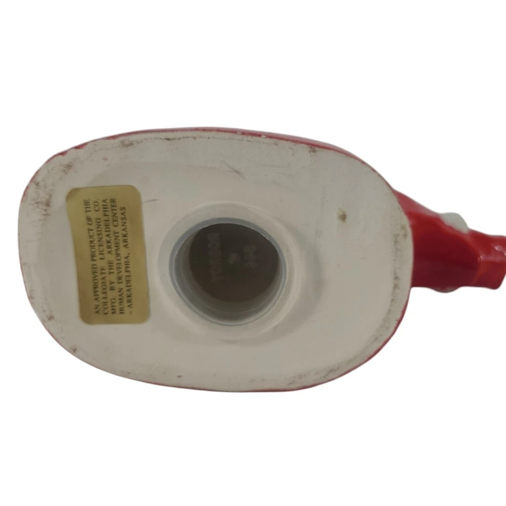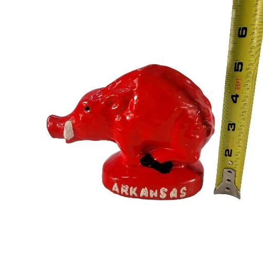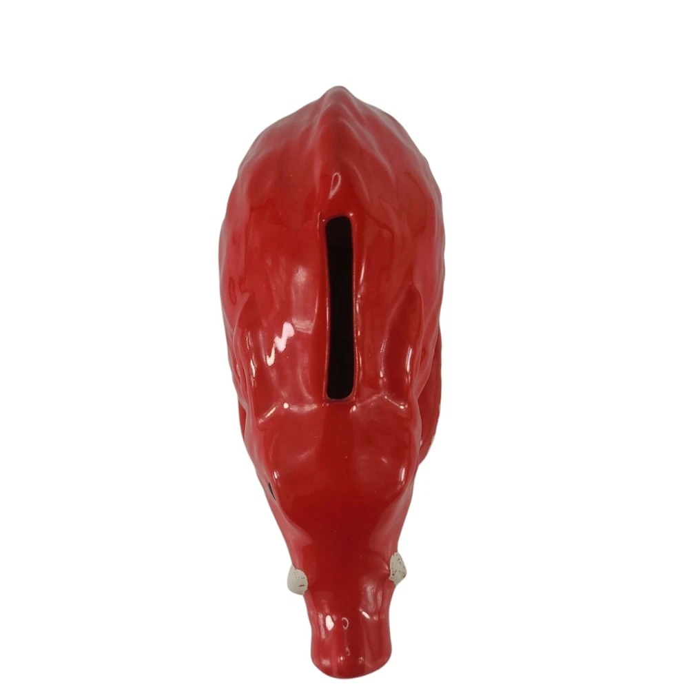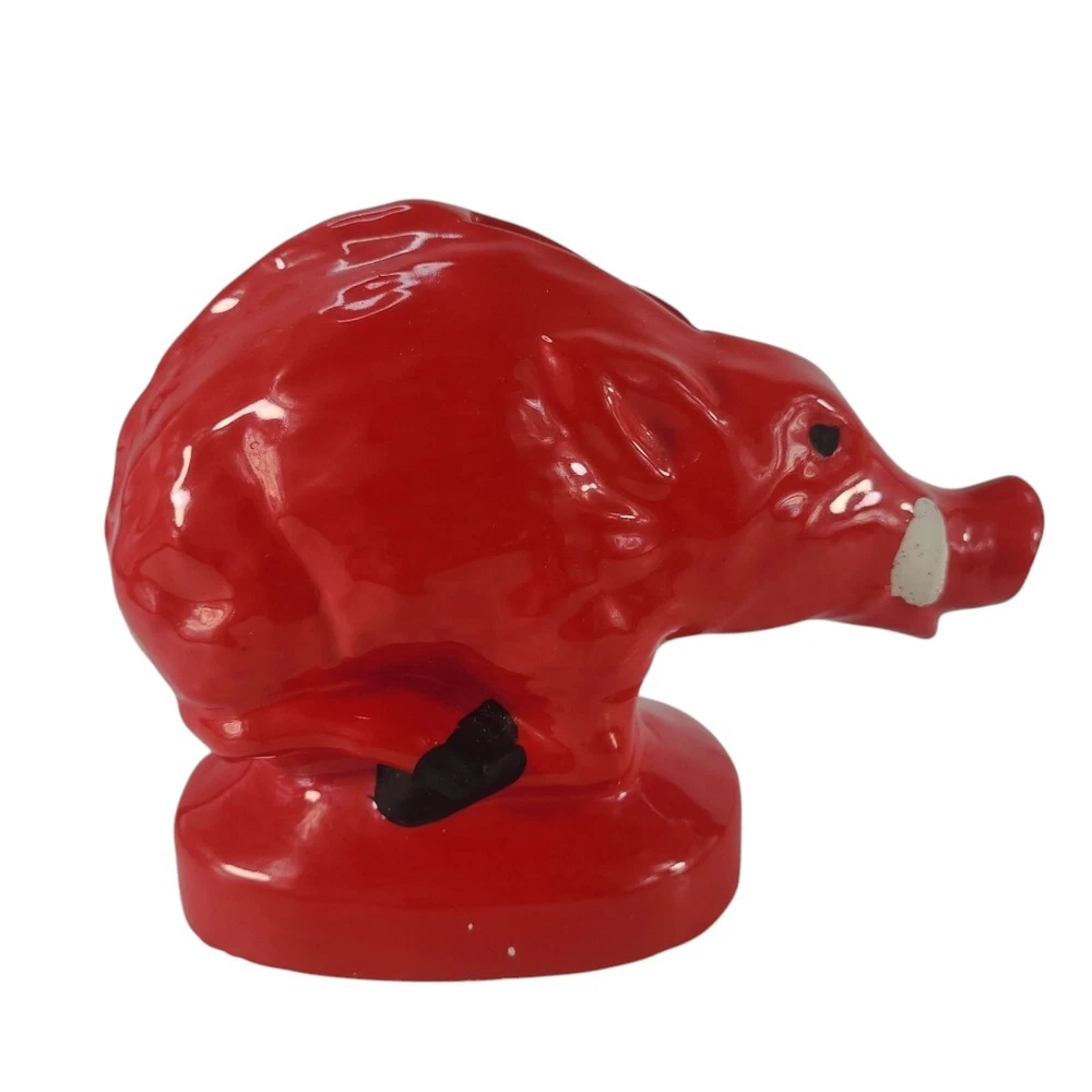 Vintage Arkansas Razorbacks Piggy Bank Ceramic Figurine This vintage ceramic figurine is a must-have for any Arkansas Razorbacks fan. With a bright red color and small size, it's perfect for displaying on a shelf or desk. The piggy bank design adds a unique touch to your collection and is sure to be a conversation starter. Featuring the iconic Razorbacks mascot, this product is a great addition to any fan's collection. Whether you're a die-hard football fan or simply appreciate the team's history, this item is a must-have. Don't miss out on the opportunity to own this one-of-a-kind piece of memorabilia.