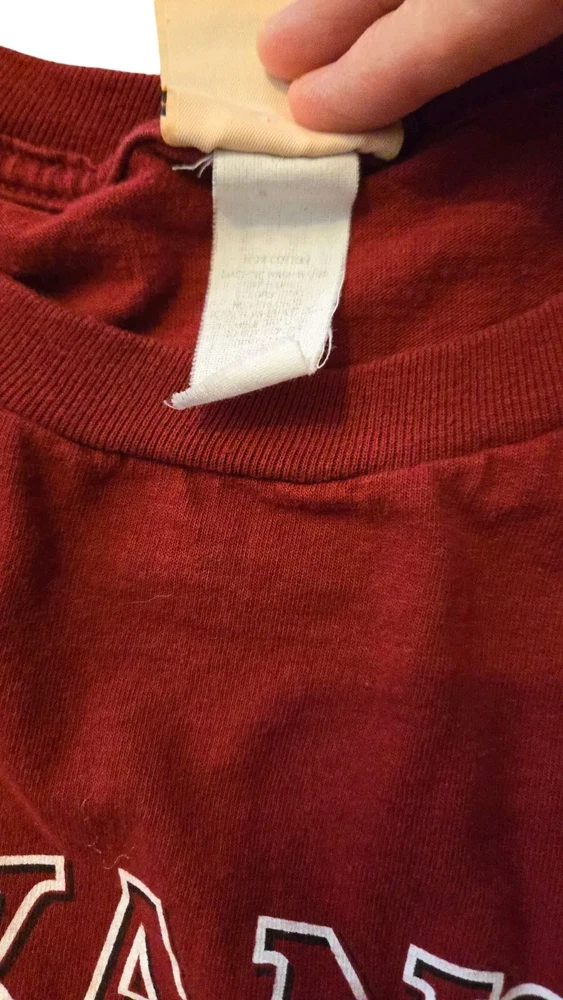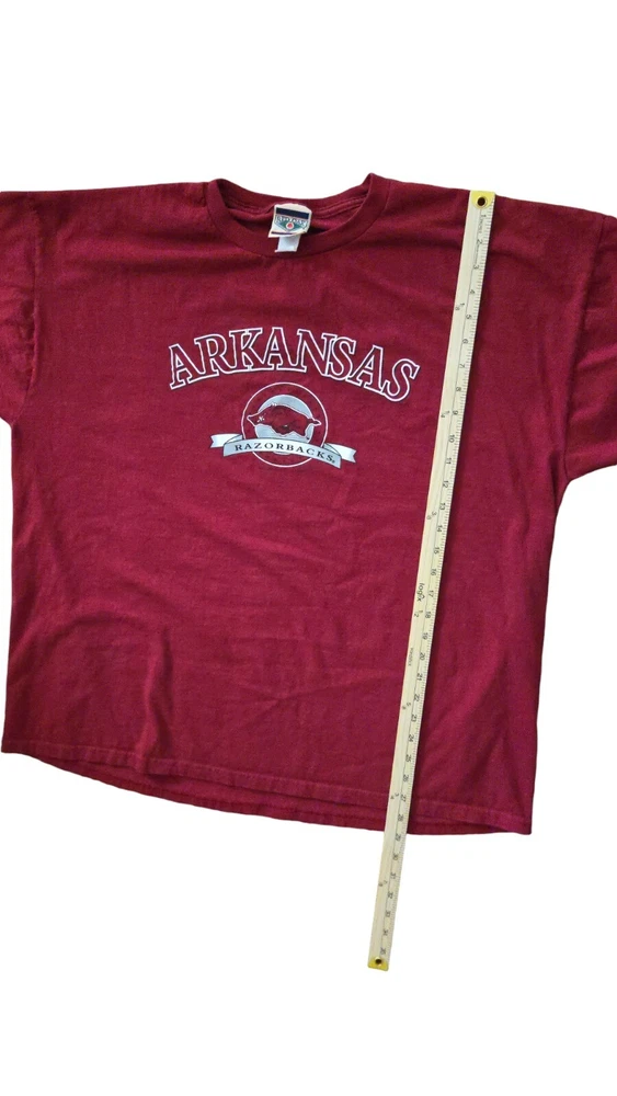 Show your support for the Arkansas Razorbacks with this vintage T-shirt. Made by Gildan, this shirt is perfect for football fans and is available in size 2XL. The shirt is made in Honduras and features a bold maroon color that will make you stand out in any crowd. This shirt is a must-have for any Razorbacks fan and is perfect for wearing to games or just around town. The shirt is made of high-quality materials and is designed to last. Don't miss out on this opportunity to show your support for the Arkansas Razorbacks with this vintage T-shirt.