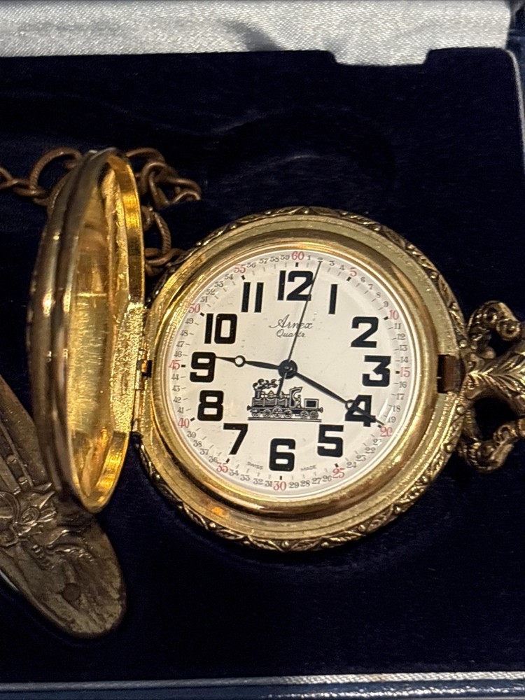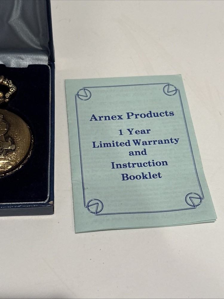 With Original Box/Packaging:YesCustomized:NoPersonalize:NoWith Manual/Booklet:NoWith Service Records:NoType:Pocket WatchSeller Warranty:NoDepartment:Unisex AdultsFeatures:12-Hour DialIndices:Arabic NumeralsDisplay:AnalogWith Papers:NoMovement:QuartzBrand:ArnexCase Color:Yellow GoldWater Resistance:Not Water Resistant