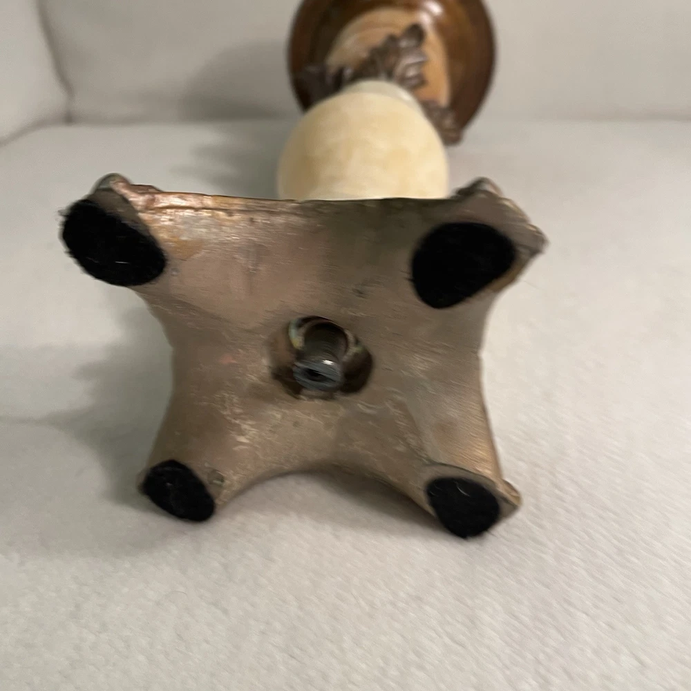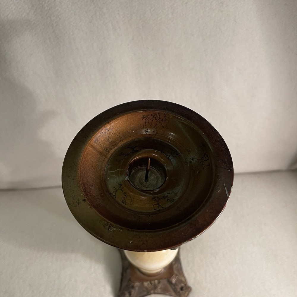 Elevate your space with a touch of vintage elegance. This Art Deco style candle holder marries the warmth of alabaster with a metallic finish, offering a sophisticated accent for any room. The round, beige marble pattern exudes a timeless appeal, while the sturdy metal base and top ensure stability and durability. Crafted in the 1960s, this authentic piece is ideal for pillar candles, enhancing the ambiance of special occasions or everyday decor. Measuring at 9 5/8" in height with a top diameter of 3.75" and a base diameter of 4.5", it weighs in at a substantial 1.2 lbs, making it a substantial addition to your collection. Excellent condition. There are a few tiny paint chips on the top rim. See photos.