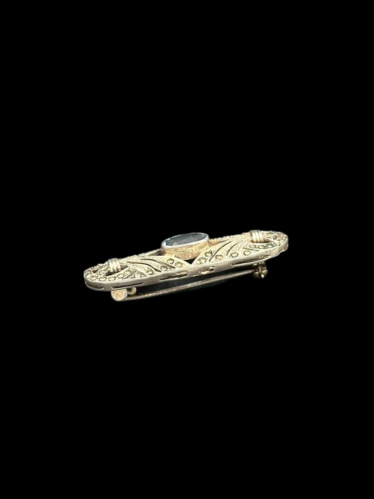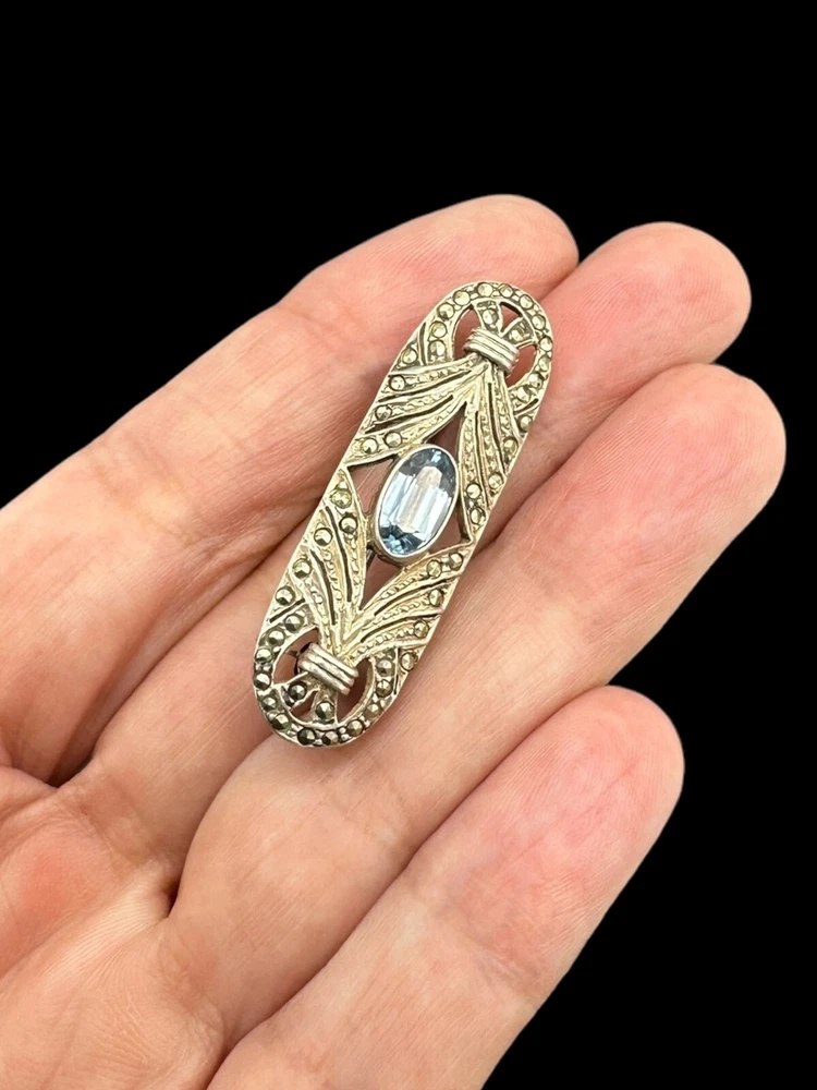 Main Stone Color: Blue Metal: Sterling Silver Color: Silver Signed: No Number of Diamonds: 0 Item Length: appx. 1 3/4" Country/Region of Manufacture: Unknown Main Stone Shape: Oval Number of Gemstones: 0 Jewelry Department: Fine Brand: Unbranded Main Stone: Spinel Setting Style: Bezel Type: Brooch Era: Art Deco (1915-1935) Handmade: Yes Secondary Stone: Marcasite Antique: Yes Country of Origin: Unknown Original/Reproduction: Original Vintage: Yes Department: Women Theme: Beauty, Art Deco Material: Metal, Gemstone
