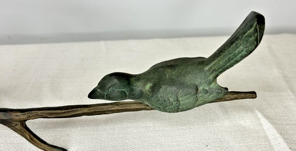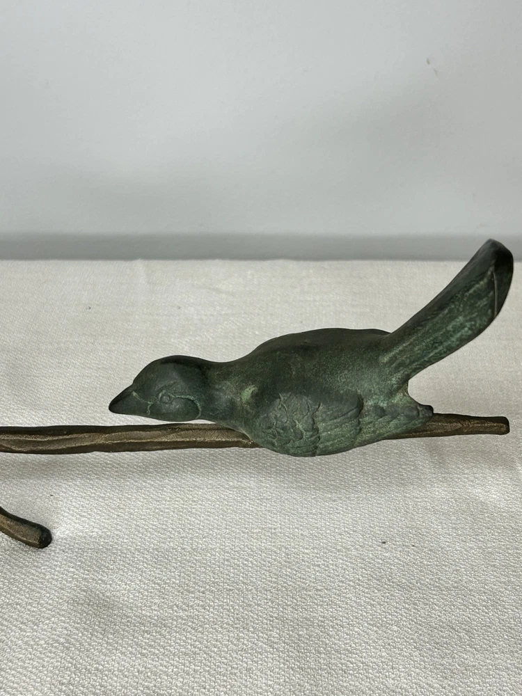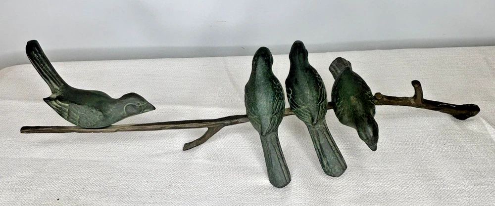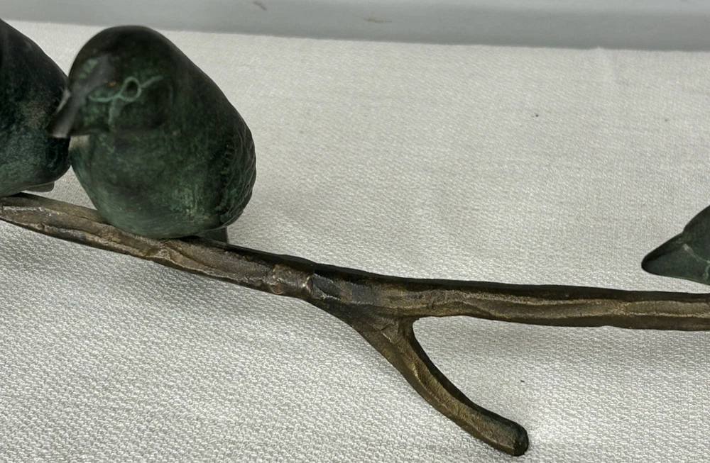 This vintage Art Deco bronze sculpture features four birds perched on a branch, with a length of 18 inches. The medium-sized sculpture is an original piece from the 1925-1949 time period, showcasing intricate details and artistic style typical of the Art Deco movement. Made of bronze, this sculpture is a unique and elegant addition to any art collection, capturing the beauty and grace of nature with a touch of historical charm. Vintage Art Deco Bronze Sculpture Four Birds On A Branch 18" Long is in excellent vintage pre-owned condition. Please review all pictures for proper assessment of its excellent vintage pre-owned condition.