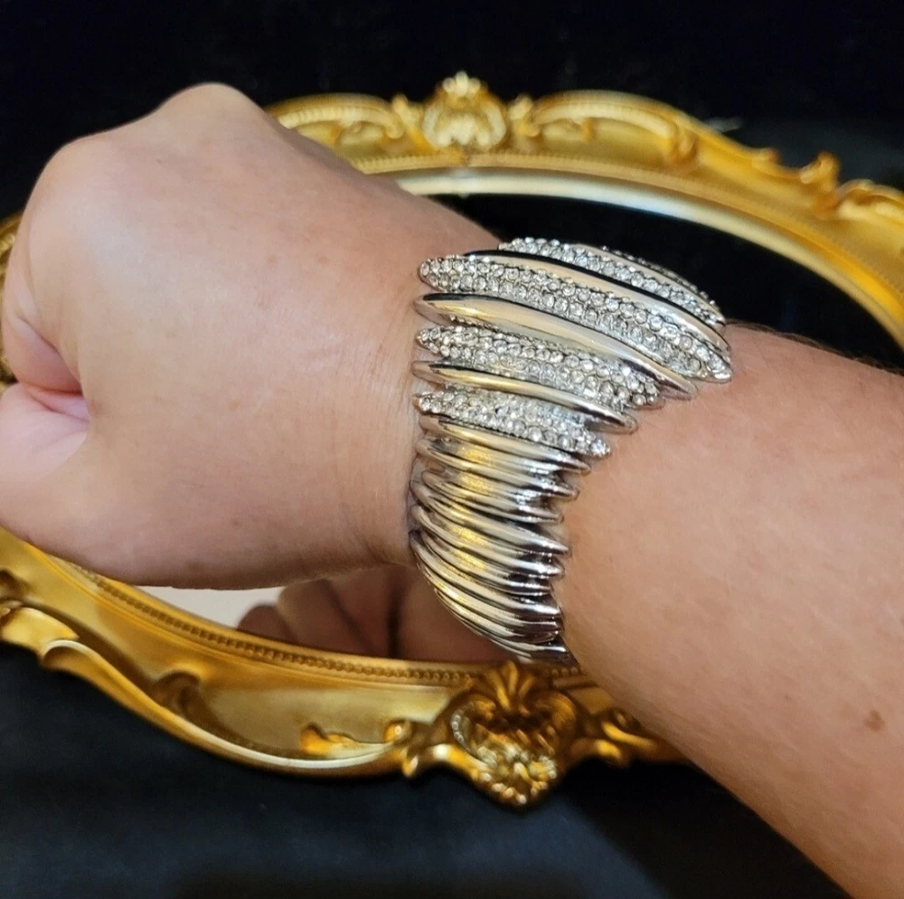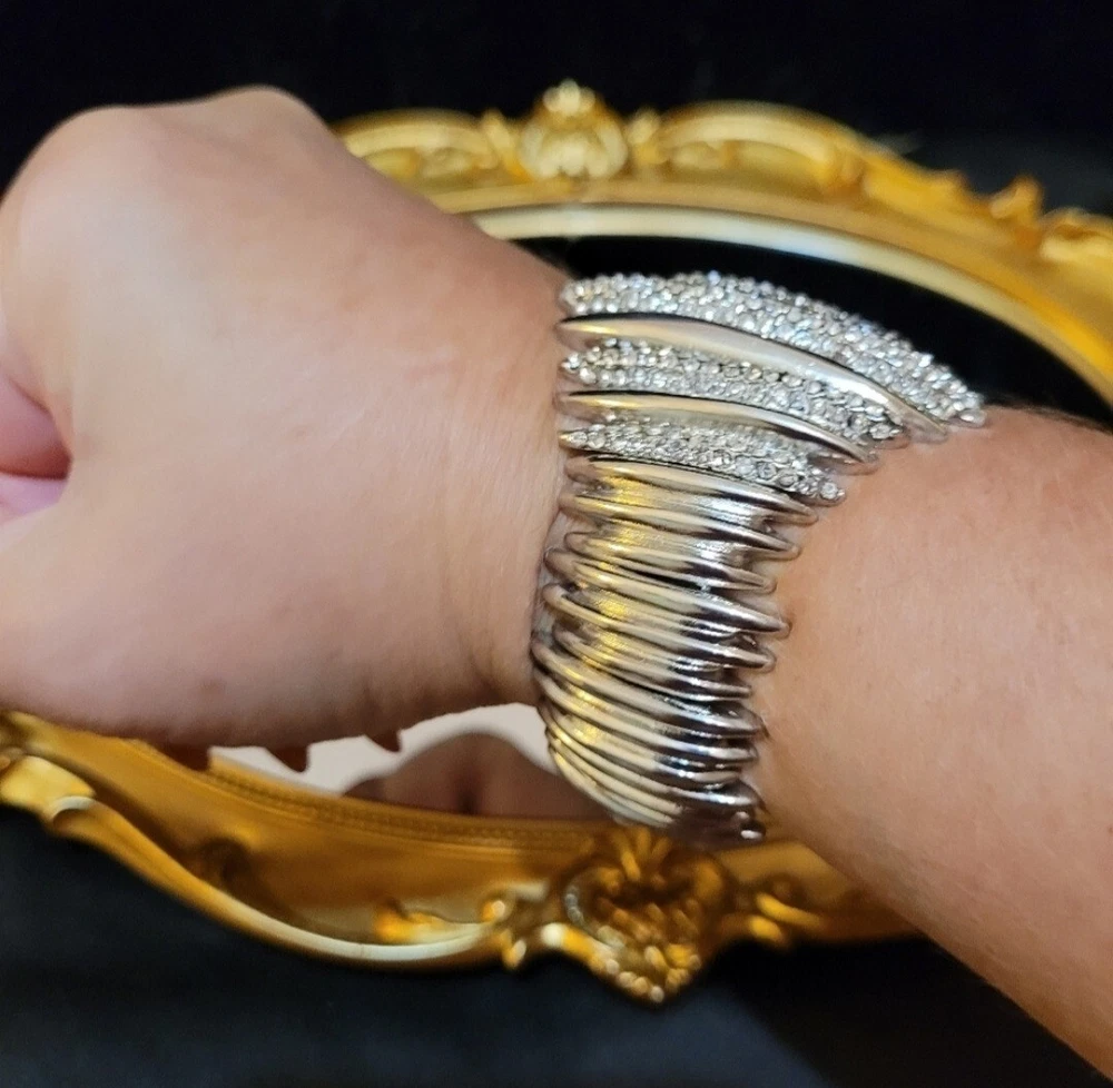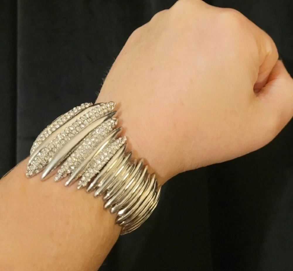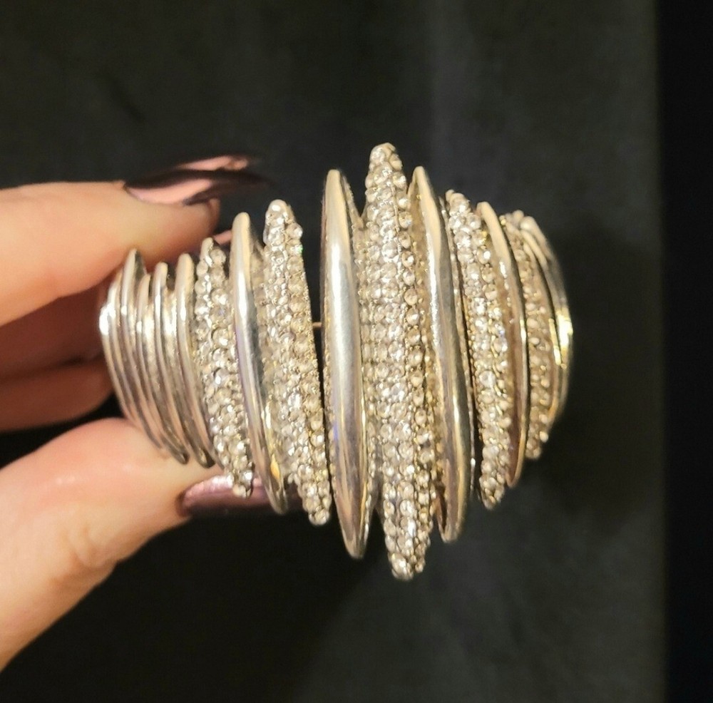 This vintage Art Deco cuff bracelet exudes glamour and sophistication. The fierce white crystal centerpiece adds a touch of elegance to any outfit, making it perfect for special occasions such as birthdays or Christmas. The round, colorless crystal is complemented by the shimmering silver metal, making this bracelet a must-have for any vintage jewelry collector. The cuff style adds a modern twist to this classic piece, making it suitable for any wrist size. This bracelet is perfect for those who appreciate the beauty and craftsmanship of vintage jewelry. 2" Wide Adjustable Silver tone base metal / crystal
