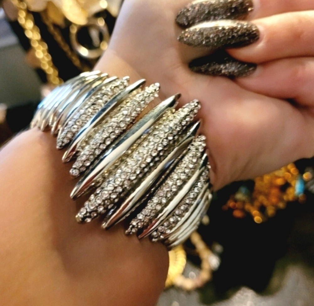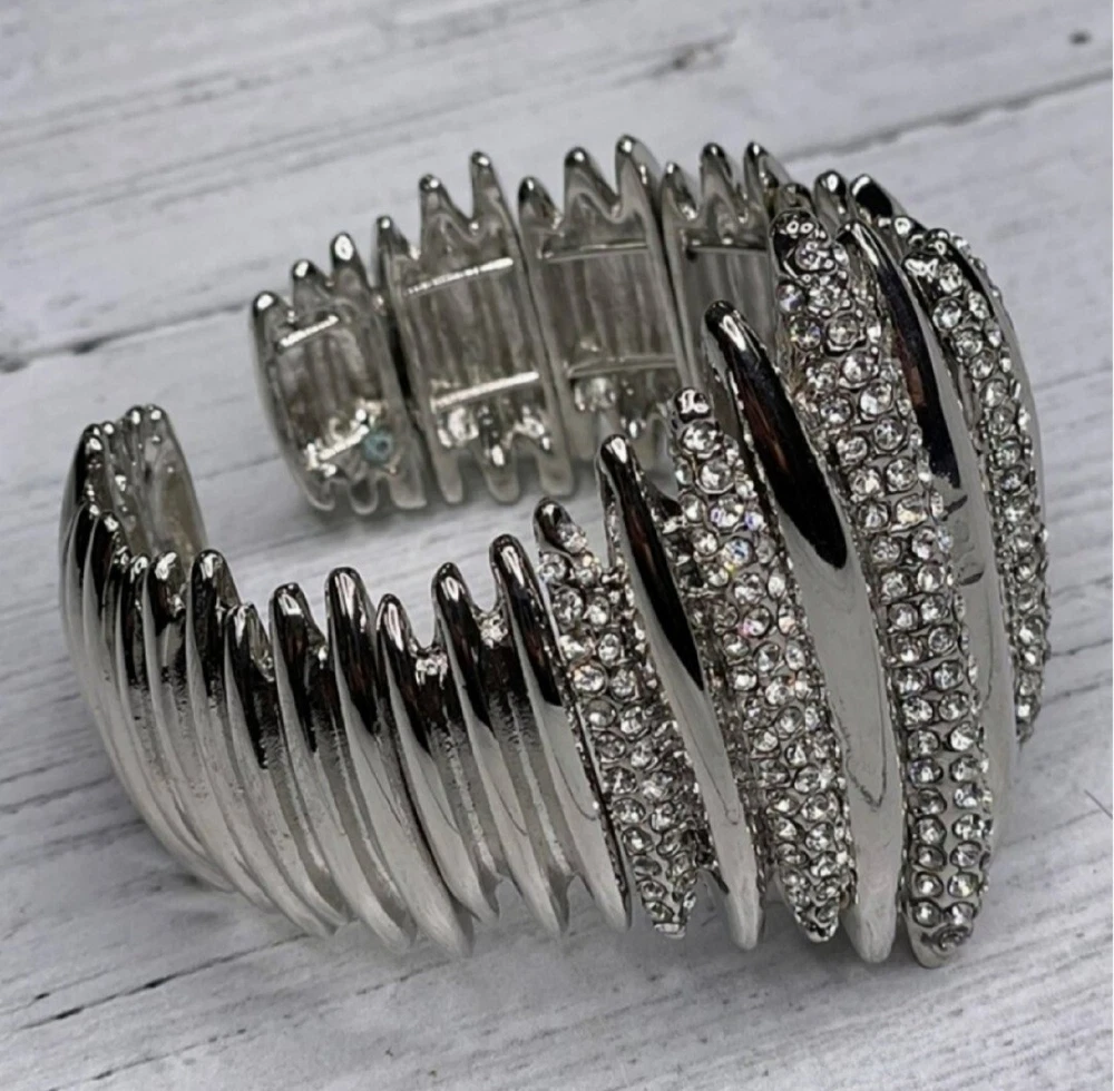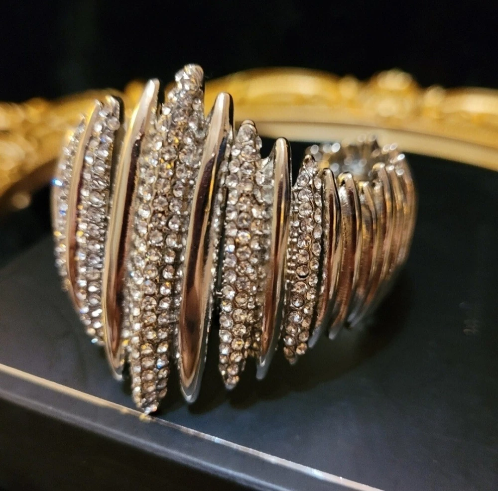 This vintage Art Deco cuff bracelet exudes glamour and sophistication. The fierce white crystal centerpiece adds a touch of elegance to any outfit, making it perfect for special occasions such as birthdays or Christmas. The round, colorless crystal is complemented by the shimmering silver metal, making this bracelet a must-have for any vintage jewelry collector. The cuff style adds a modern twist to this classic piece, making it suitable for any wrist size. This bracelet is perfect for those who appreciate the beauty and craftsmanship of vintage jewelry. 2" Wide Adjustable Silver tone base metal / crystal