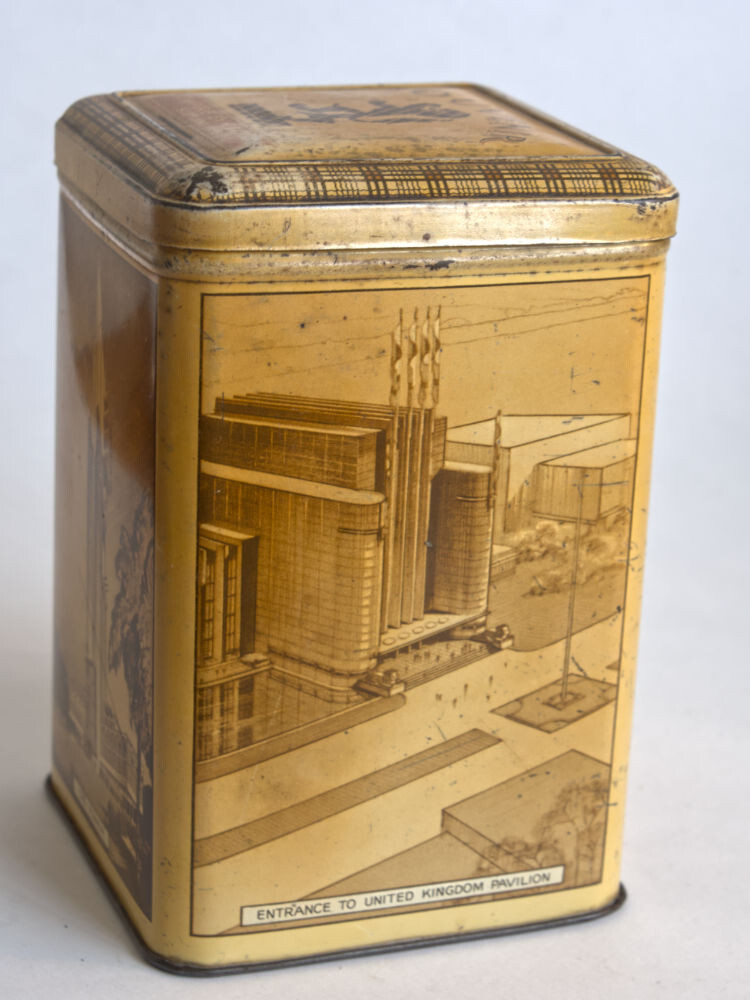 This is an original souvenir tin box from the Empire Exhibition held in Scotland in 1938. There are some scratches in the exterior paint and some paint loss on the lower right portion of the lid. Overall condition is good and the photos are accurate. Each side of the tin depicts a different pavilion in the exhibition and each of these is very Art Deco in design. It is almost 6in or 15cm in height and each side is 3 3/4in or 9.5cm in width.