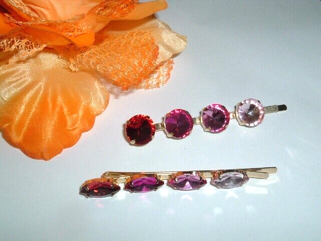 From a Chicago estate sale, 2 vintage, art deco bobby pins with prong set, red and pink rhinestones measuring 2" long. Condition is excellent, colors are awesome and lots of bling. We combine ship.