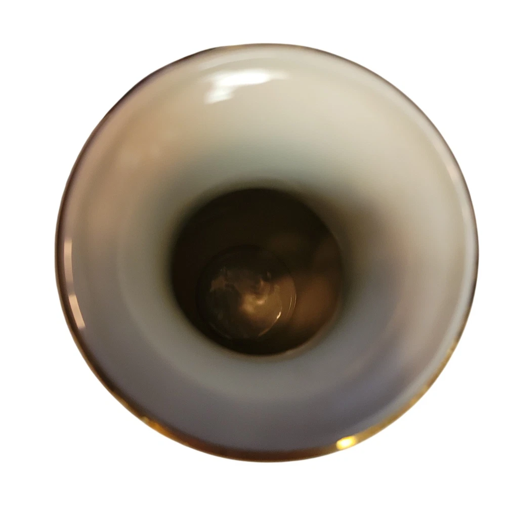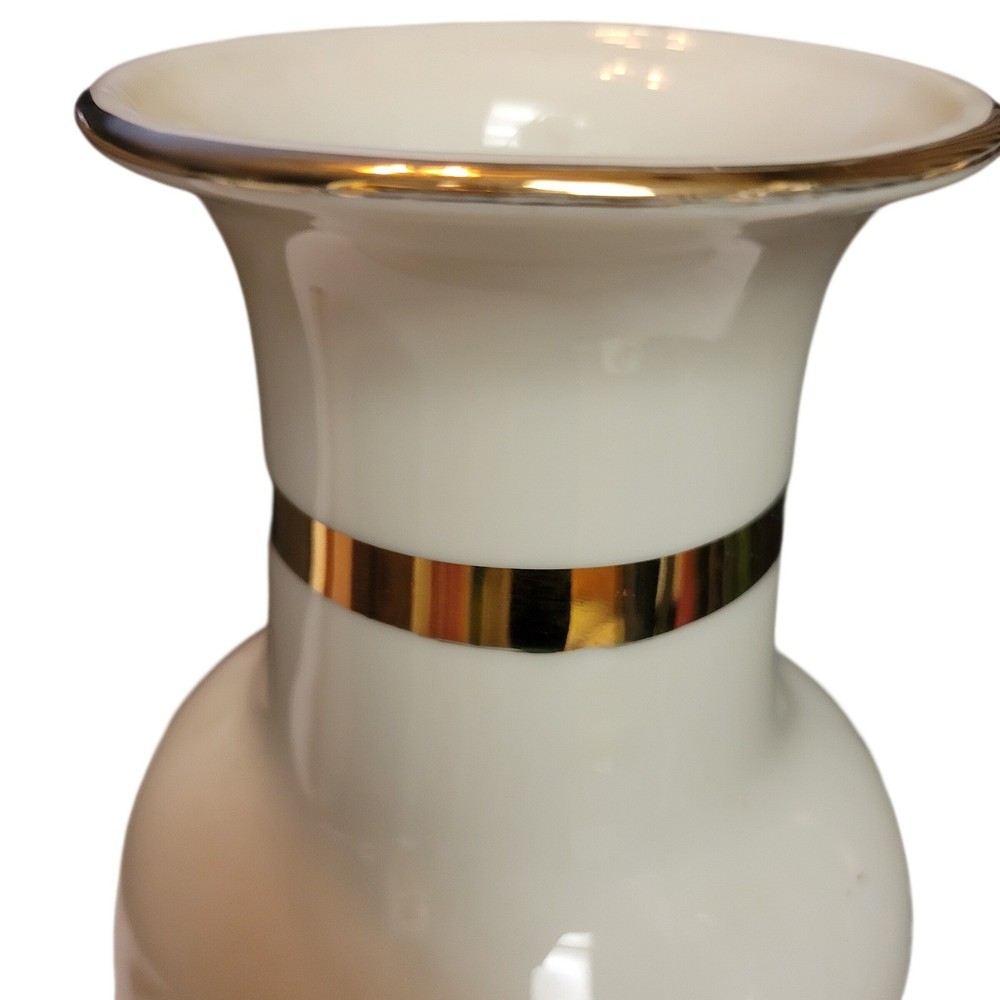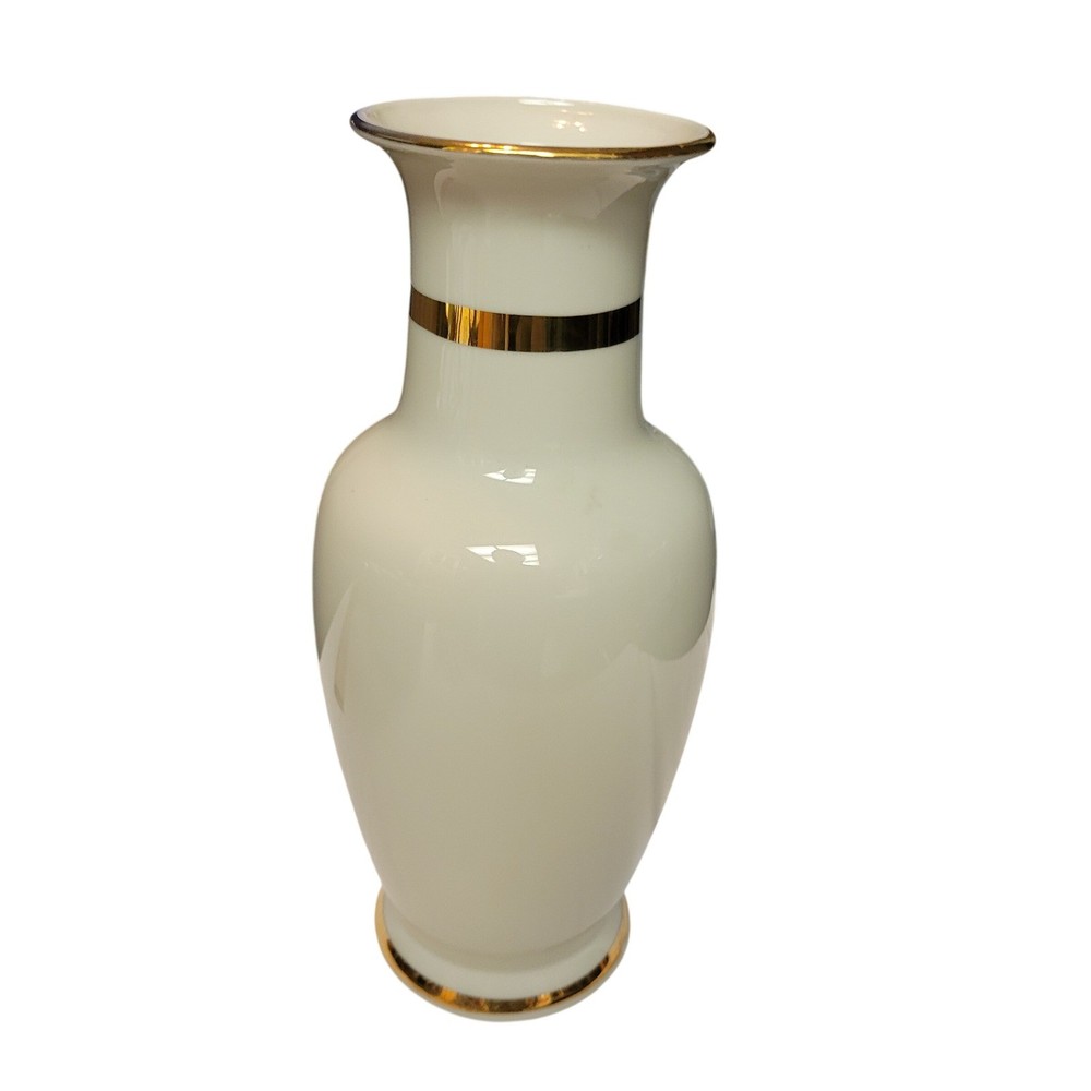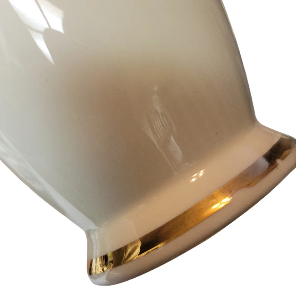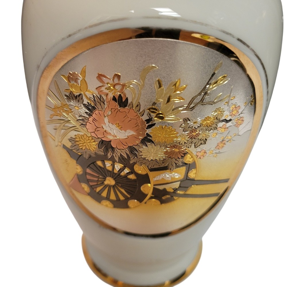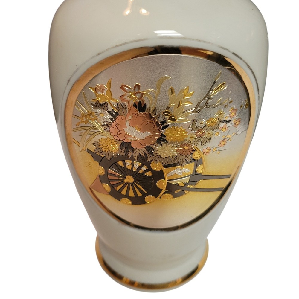 Adorn your space with this exquisite porcelain vase, a testament to timeless artistry. Its pristine white glaze is elegantly accented with shimmering gold trim, drawing the eye to the captivating centerpiece on its body. A circular medallion showcases a vibrant, meticulously detailed floral arrangement, complete with a charming traditional cart, rendered in rich, metallic hues. The flared opening and tapered base create a graceful silhouette, promising to elevate any decor. Perfect for gracing a mantelpiece, as a striking centerpiece for a formal dining table, or as a sophisticated accent in a sunroom. Measurements: • Height: 11.5 in • Opening Diameter: 3.75 in Type: Flower Vase Material: Ceramic Shape: Bottle Theme: Art Style: Asian Department: Adults Features: Decorative Pattern: Floral Room: Living Room, Any Room Mounting: Free Standing Care Instructions: Clean with Warm Water Unit Type: Unit There is some wear of gold framing around art. Keywords: porcelain vase, vintage decor, gold accent, floral design, ornate vase, table centerpiece, mantel decor, decorative vase, asian inspired, elegant home, classic style, gift idea, collectible vase