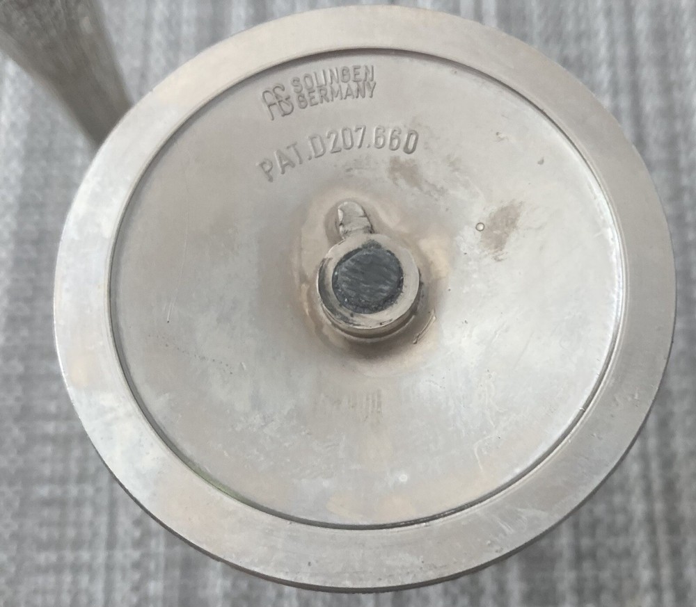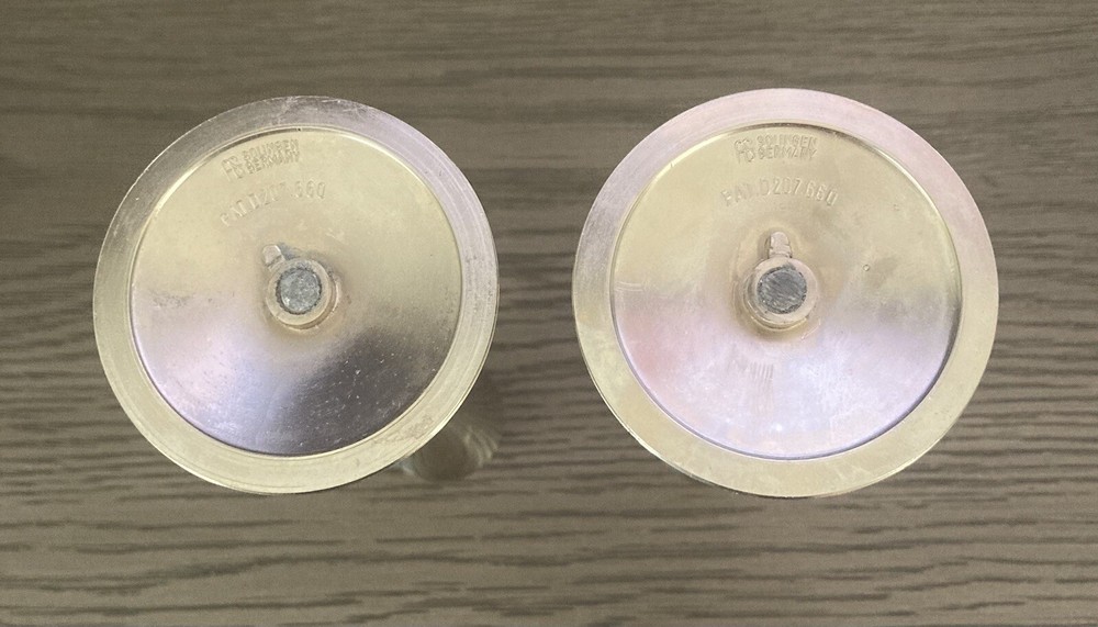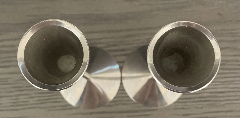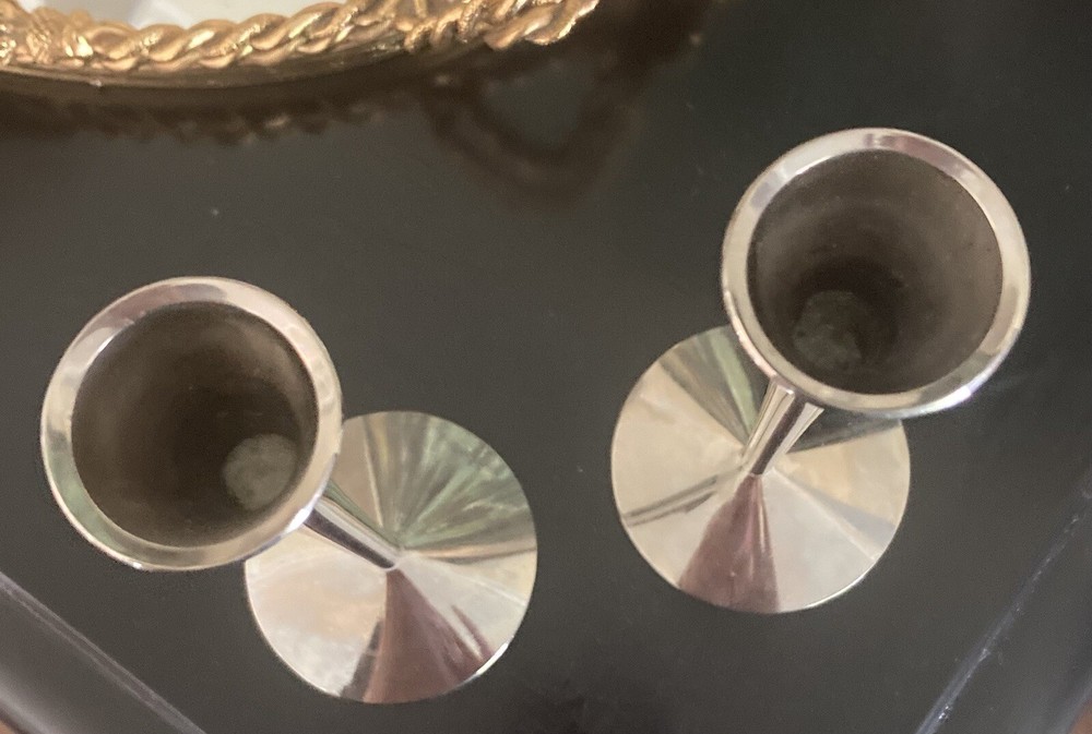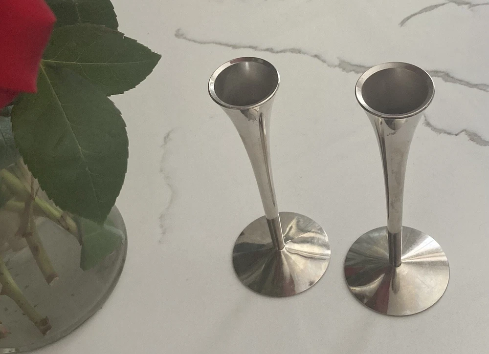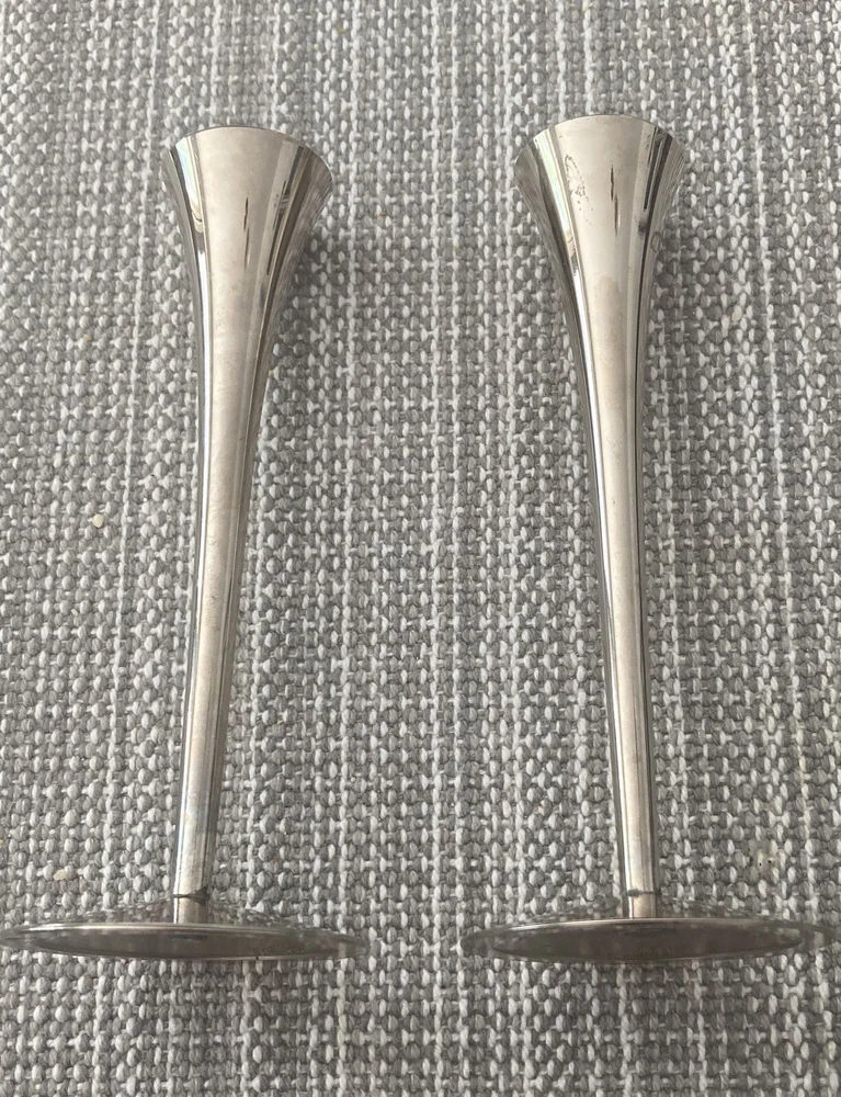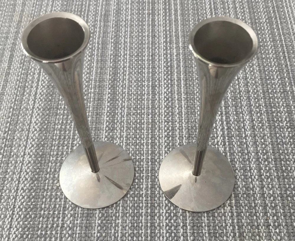 Enhance the ambiance of your living space with this exquisite set of Mid-Century Danish Modern Candle Holders. Crafted by Arthur Salm, a renowned brand in the decorative collectibles industry, these candle holders are perfect for all occasions. The stainless steel material and silver color give them a sleek and stylish look that will complement any interior design. Each candle holder stands at 6 inches tall and has a unique mid-century modernism style that is sure to catch the eye of any visitor. Made in Germany, these candle holders are a great addition to any collection and are sure to add a touch of elegance to your home decor. Get your hands on this fantastic set of candle holders today! 6” tall, 2 1/2” base, 1 1/4” across top. Preowned/lively condition. Shipping in Continental US only. Shipping USPS Ground Advantage.