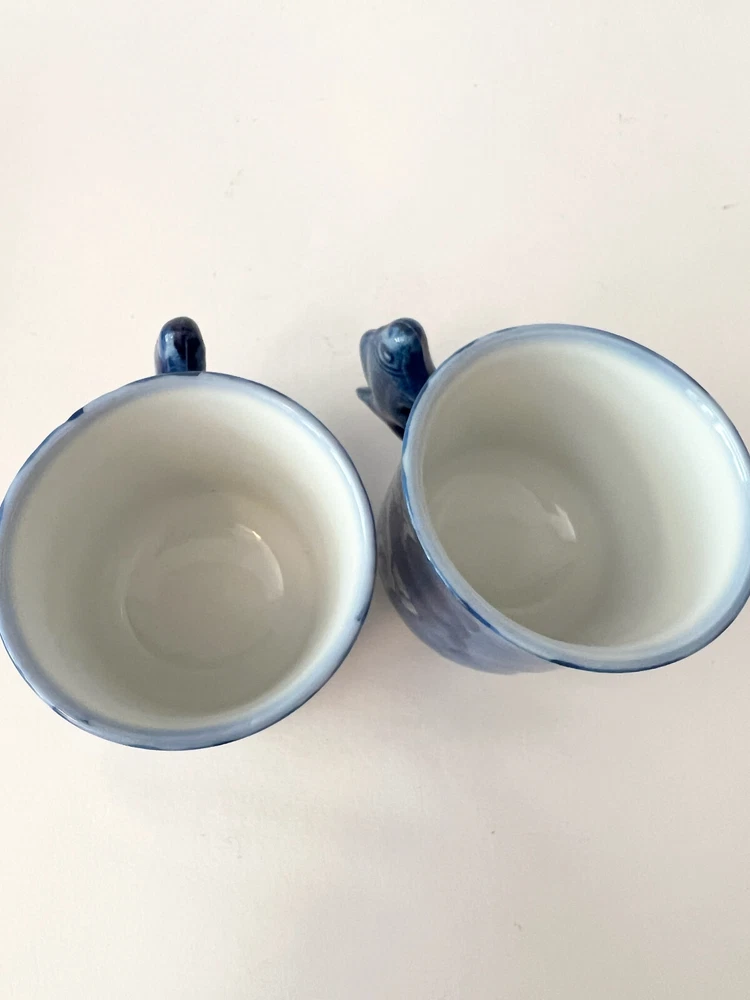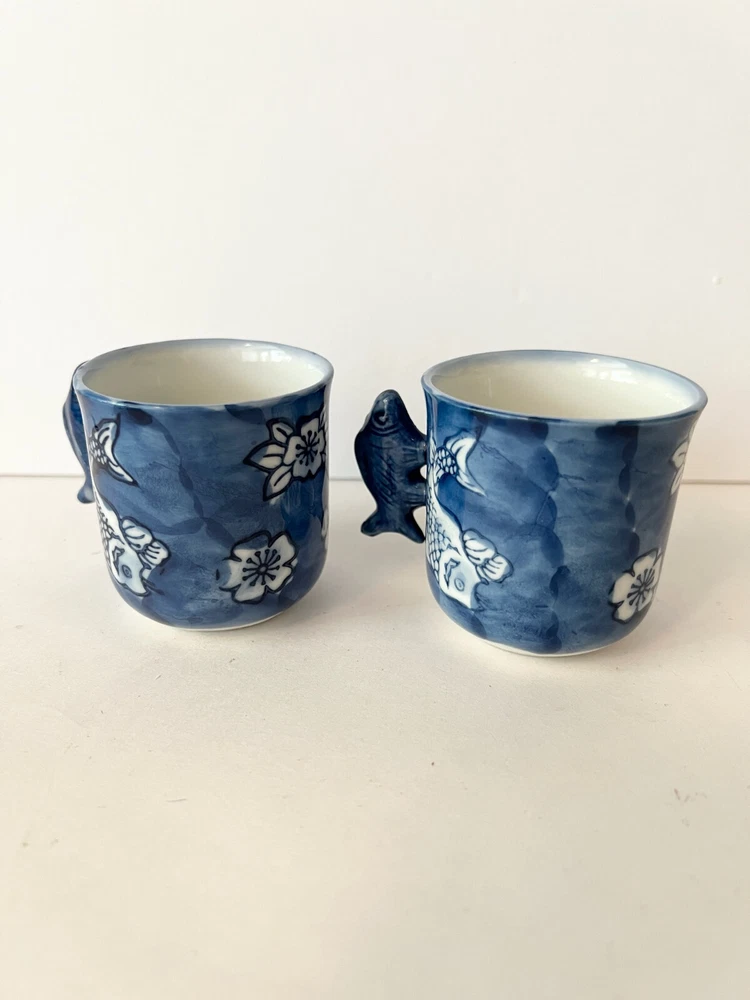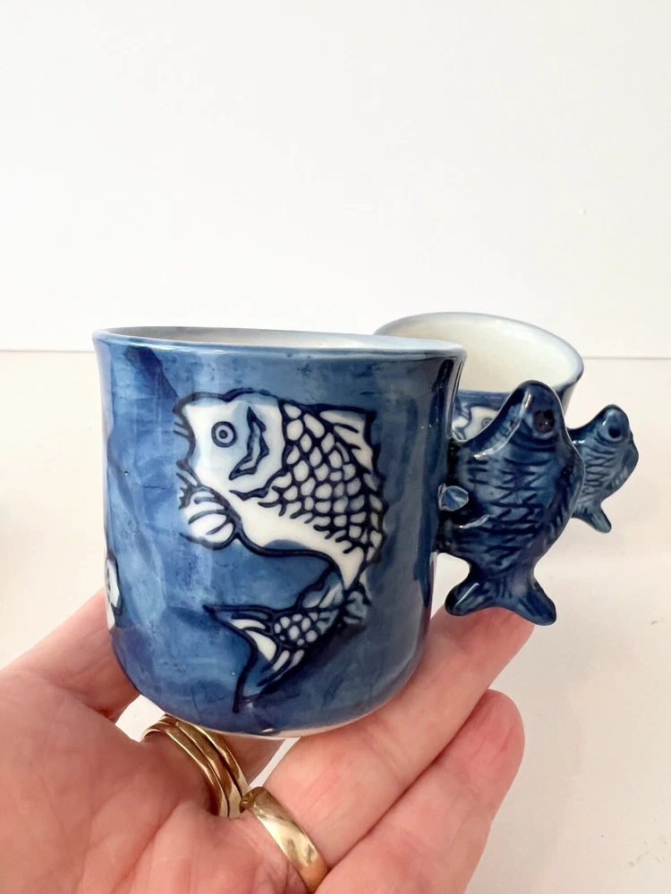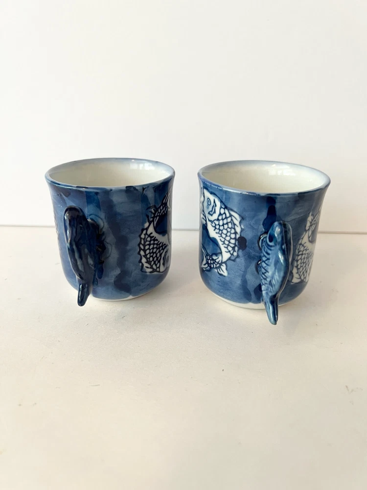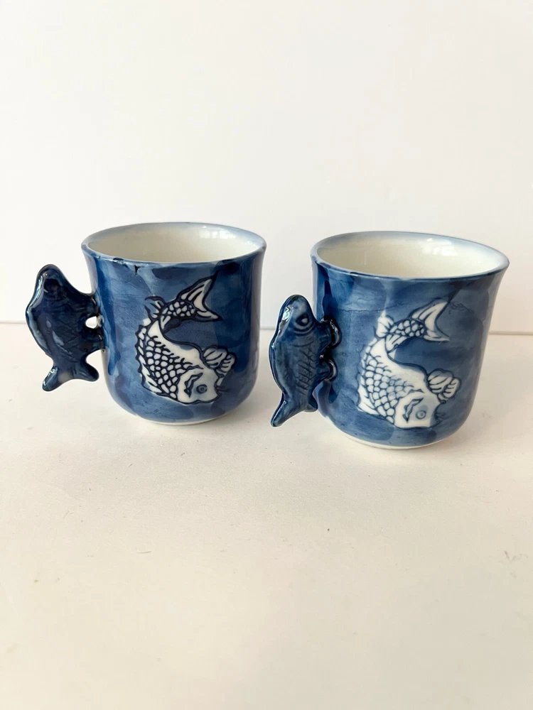 Fun Vintage Asian 2 Blue Tea Cups Hand Painted With Fish Handles Blue Signed. They look like they have not been used , found at an Estate Sale . Will pack with care and send to you ASAP Thank you for looking !