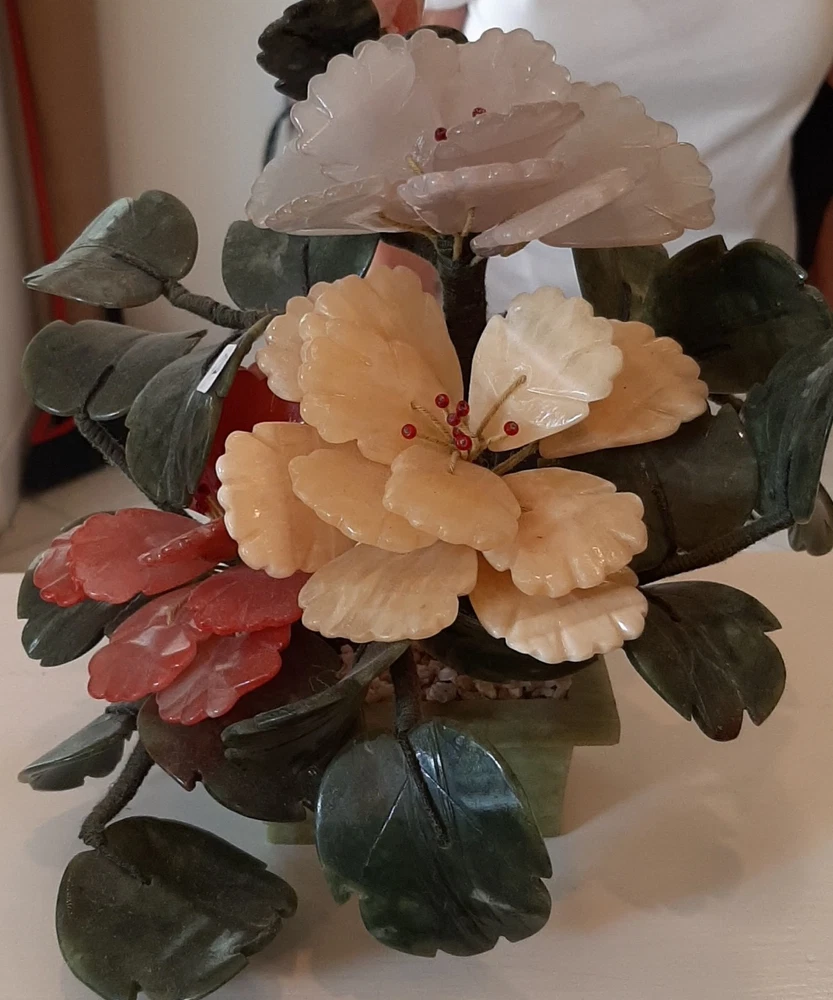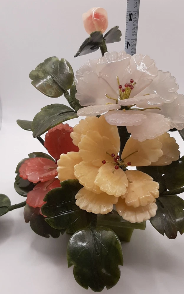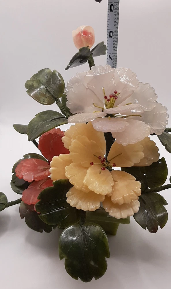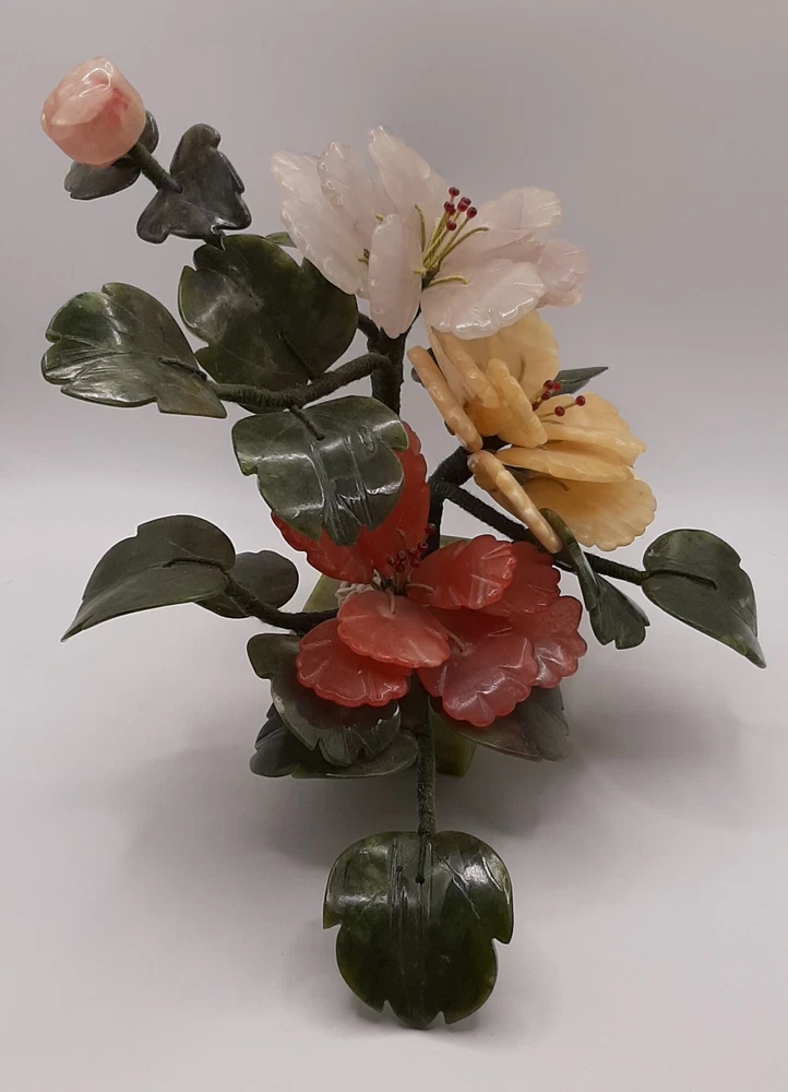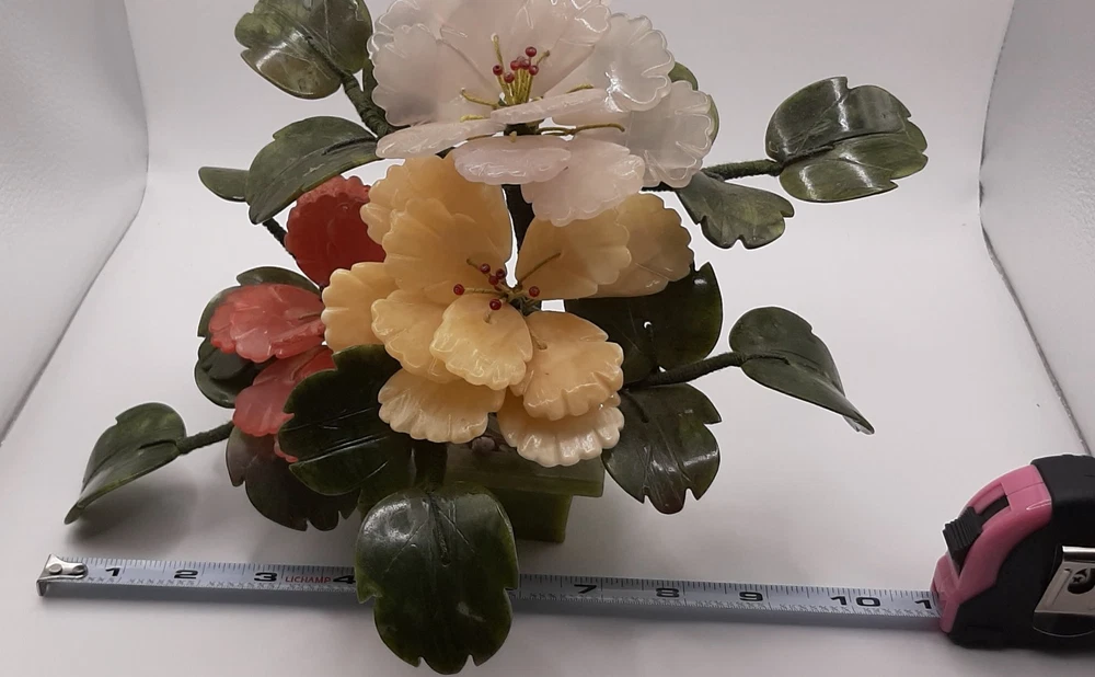 Estate Find! It is gorgeous! This vintage Asian bonsai tree is a beautifully crafted piece with carved jade leaves and semi-precious stone flowers. Handmade in China, this collectible item embodies Chinese culture and craftsmanship. Standing at 11 inches wide and 8 inches tall, this unique piece of art adds a touch of authenticity and charm to any collection. Please view all photos as they are an important part of the description and your best indicator of condition. Thank you for your interest.