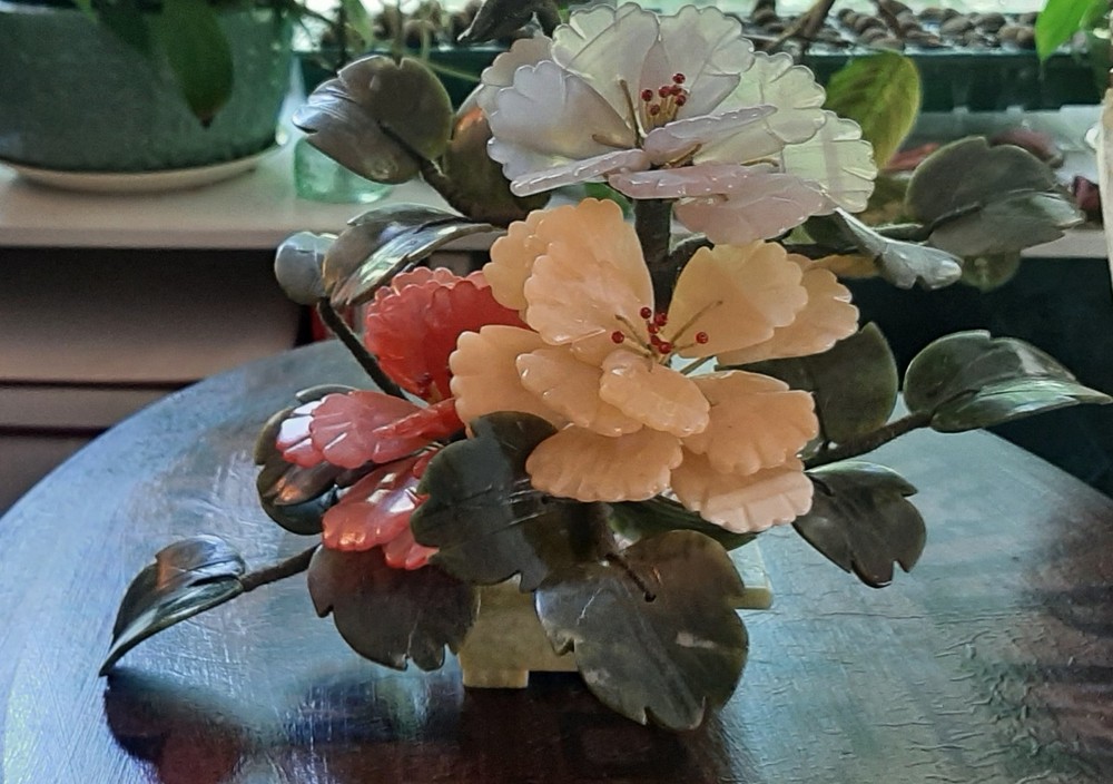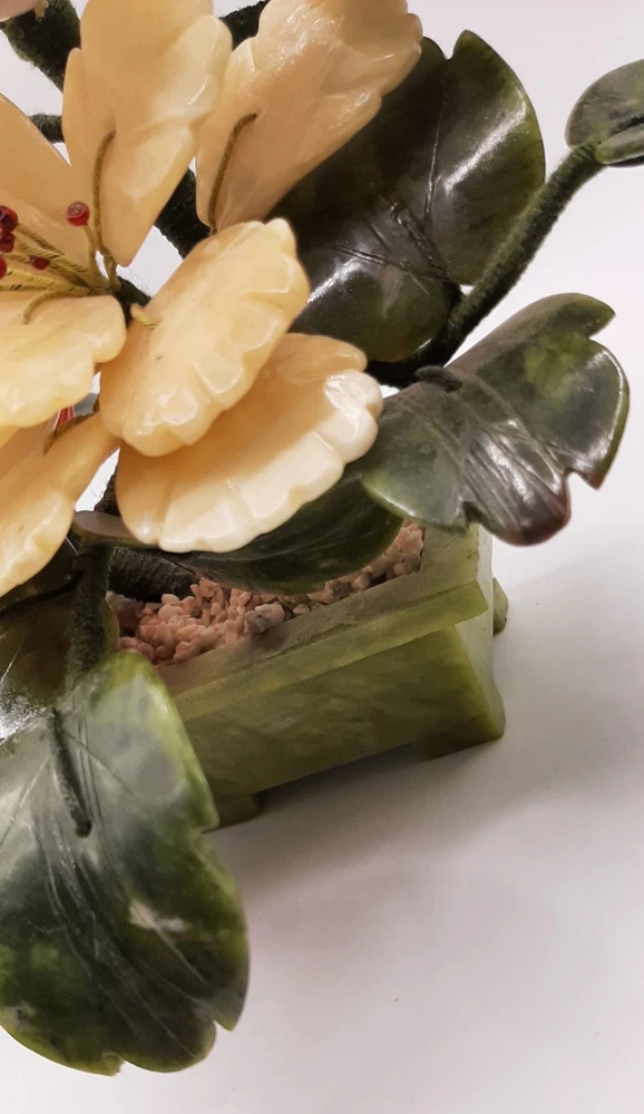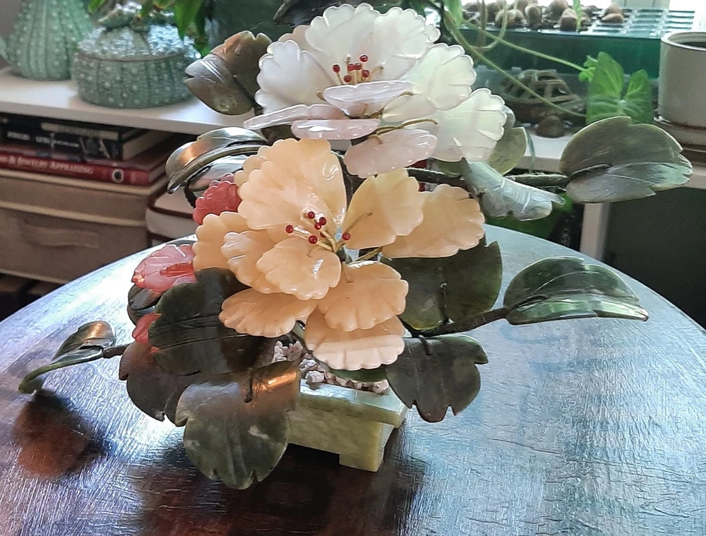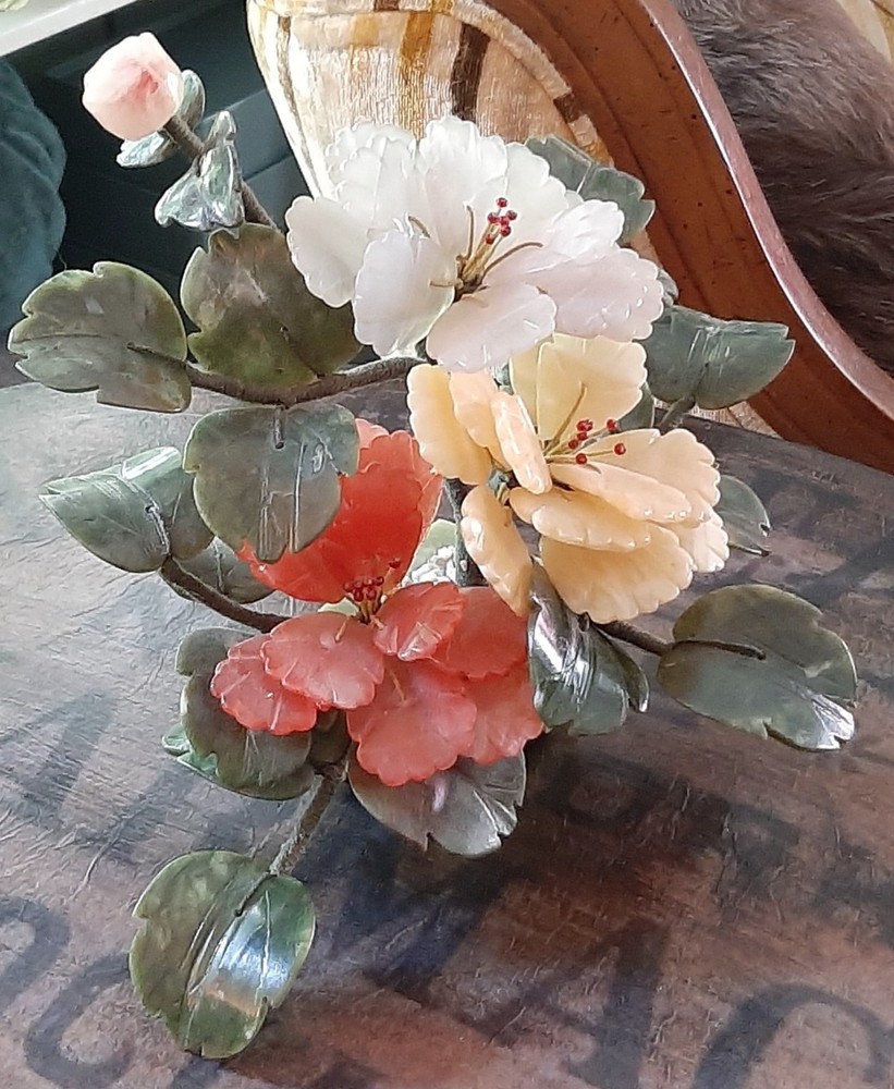 Estate Find! It is gorgeous! This vintage Asian bonsai tree is a beautifully crafted piece with carved jade leaves and semi-precious stone flowers. Handmade in China, this collectible item embodies Chinese culture and craftsmanship. Standing at 11 inches wide and 8 inches tall, this unique piece of art adds a touch of authenticity and charm to any collection. Please view all photos as they are an important part of the description and your best indicator of condition. Thank you for your interest.