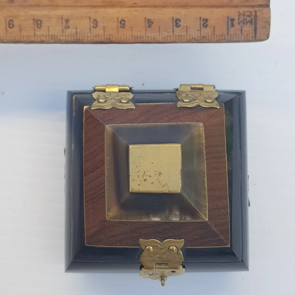 Crafted with an eye for detail, this Vintage Ring Jewelry Box is a charming addition to any collection. The brass accents paired with a wooden base create a classic look that's both elegant and sturdy. Its unique design features an Asian elephant motif, adding a touch of Asian cultural flair to your keepsakes. The trinket box is perfect for safeguarding your precious rings and other jewelry items. This is a quality item with distinction, making this piece not just a container but a work of art. Whether for personal use or as a thoughtful gift, this jewelry box is sure to be appreciated.