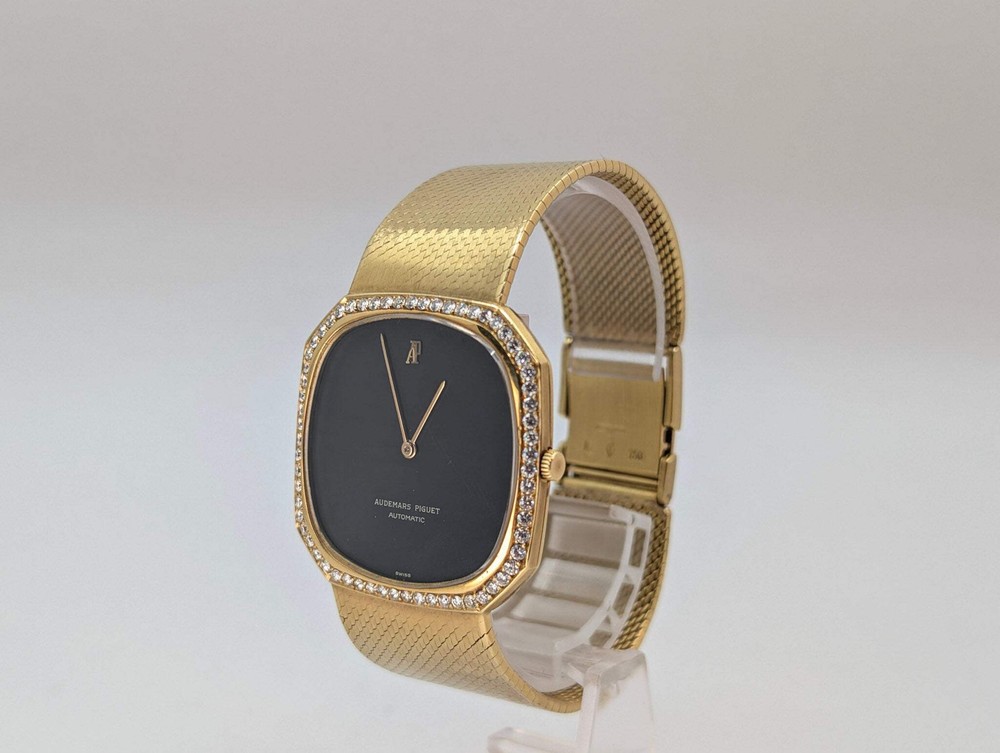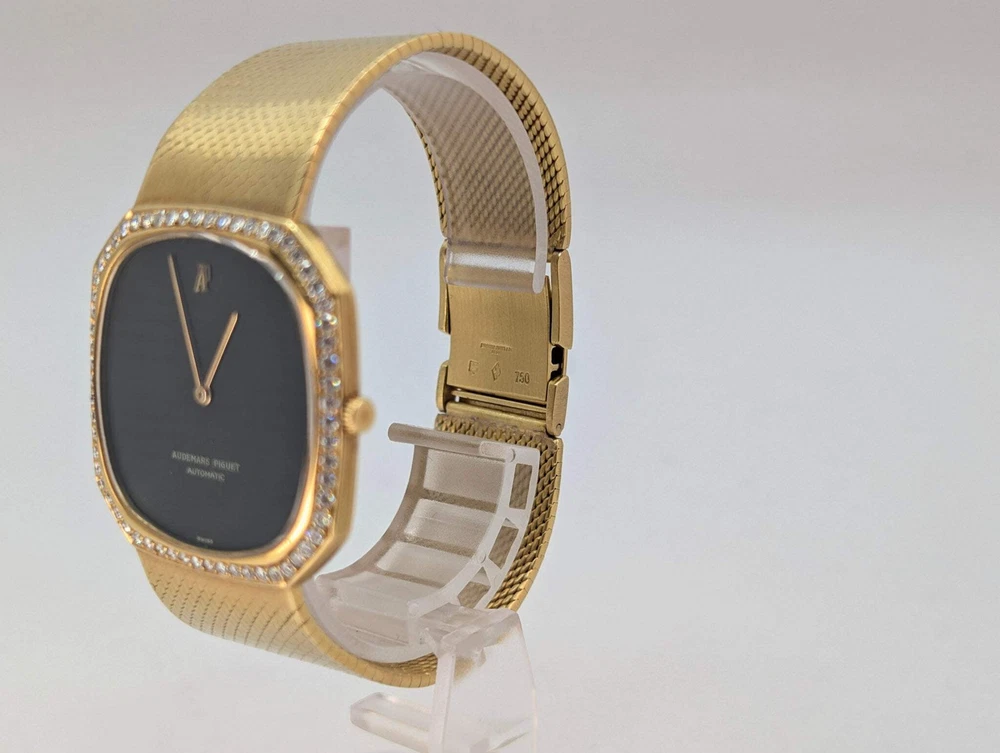 Vintage Audemars Piguet Diamond Set 18k Yellow Gold Octagonal Watch 5471 Rare This Audemars Piguet Ref. 5471 is a striking and seldom-seen dress watch, crafted in solid 18k yellow gold and adorned with a diamond-set bezel and lugs. Measuring 35mm in diameter, the case maintains the elegant, ultra-thin proportions of AP’s classic era while offering a confident presence on the wrist. At its core is the legendary Caliber 2120—an ultra-thin automatic movement known for its precision and refined engineering. The watch features a deep black dial, highly prized for its natural luster and minimalism, accented by applied gold hour markers and dauphine hands. Completing the watch is an integrated 18k yellow gold mesh bracelet that drapes smoothly on the wrist and elevates the overall aesthetic to one of timeless sophistication. A rare combination of mechanical pedigree, precious materials, and vintage elegance, this piece is a standout example of Audemars Piguet’s mid-century craftsmanship. Condition Report: Watch Only, in really nice condition, some minor signs of wear including superficial scratches on the buckle as well as light scratches on the dial. Vintage Audemars Piguet Diamond Set 18k Yellow Gold Octagonal Watch 5471 Rare This Audemars Piguet Ref. 5471 is a striking and seldom-seen dress watch, crafted in solid 18k yellow gold and adorned with a diamond-set bezel and lugs. Measuring 35mm in diameter, the case maintains the elegant, ultra-thin proportions of AP’s classic era while offering a confident presence on the wrist. At its core is the legendary Caliber 2120—an ultra-thin automatic movement known for its precision and refined engineering. The watch features a deep black dial, highly prized for its natural luster and minimalism, accented by applied gold hour markers and dauphine hands. Completing the watch is an integrated 18k yellow gold mesh bracelet that drapes smoothly on the wrist and elevates the overall aesthetic to one of timeless sophistication. A rare combination of mechanical pedigree, precious materials, and vintage elegance, this piece is a standout example of Audemars Piguet’s mid-century craftsmanship. Condition Report: Watch Only, in really nice condition, some minor signs of wear including superficial scratches on the buckle as well as light scratches on the dial. × × × × × × × × × × Buy now and save! Shipping info Click the Shipping & Payments tab above the listing description for more info Click the Shipping & Payments tab above the listing description for more info! Additional delivery notes PICK UP OPTION Sorry, our items are NOT available for pick-up. PAYMENT Immediate payment is required upon selecting "Buy It Now" or upon checking out through the cart. We accept payment via U.S. PayPal accounts and all Major Credit Cards, Debit Cards & Google Pay. We are legally required to collect sales tax in those states and localities where we maintain a physical presence (nexus). The applicable amount of sales tax charged to an order will be calculated based on the shipment destination's state and local sales tax laws. Thank you for shopping with us on eBay! Additional Information No additional information at this time Ask seller a question You might also like Rolex Sky-Dweller Unworn 42mm Box & Papers Rose gold Chocolate Dial Oyster-Flex Rolex OP 31 UAE Armed Forces signed Oyster Perpetual Box&Papers Pink markers Vacheron Constantin 1954 Cioccolatone Toledo Ref 4822 Rare Watch Box and Paper Rolex Datejust 36mm Rare Arabic Motif Dial Two Tone Ref: 16013 Jubilee Bracelet Contact To contact our Customer Service Team, simply click the button here and our Customer Service team will be happy to assist. Ask seller a question © Watch Them Tick Shipping & Payments Click the Shipping & Payments tab above the listing description for more info Payment Accepted Payment Methods Immediate payment is required upon selecting "Buy It Now" or upon checking out through the cart. We accept payment via U.S. PayPal accounts and all Major Credit Cards, Debit Cards & Google Pay. We are legally required to collect sales tax in those states and localities where we maintain a physical presence (nexus). The applicable amount of sales tax charged to an order will be calculated based on the shipment destination's state and local sales tax laws. Thank you for shopping with us on eBay! Returns Returns are accepted Items must be returned within 14 days of the auction ending Buyer will pay for return shipping. eBay integration by