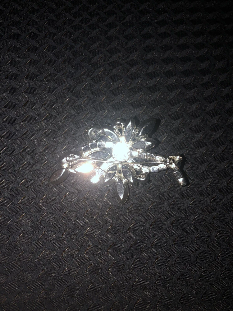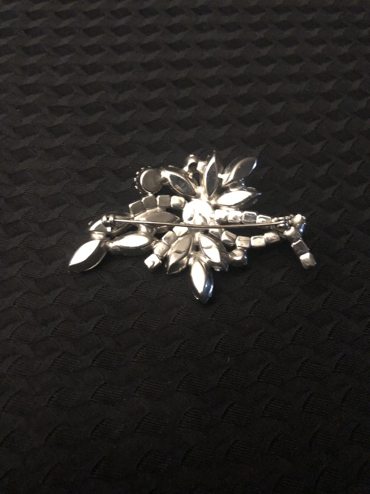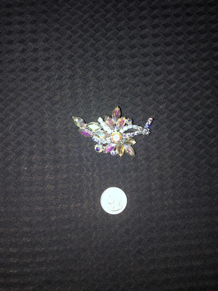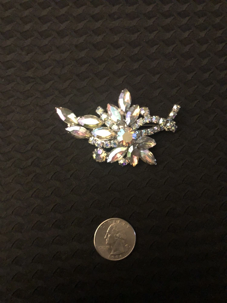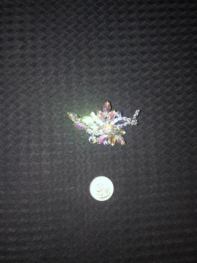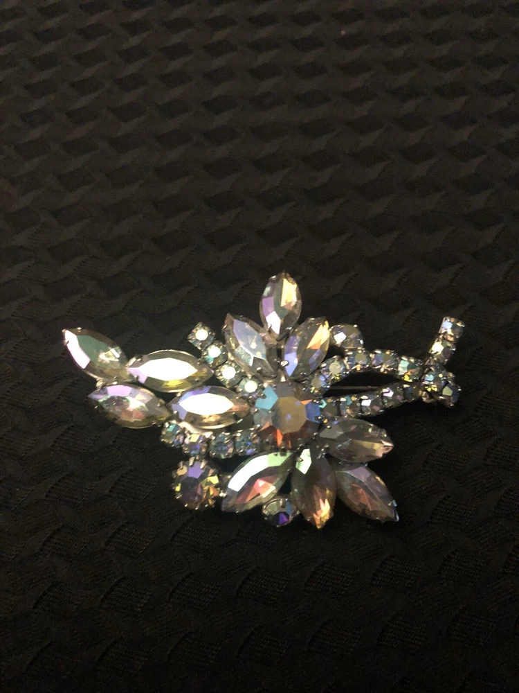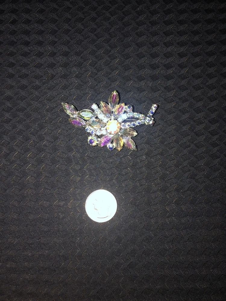 This vintage brooch by Aurora features a striking floral design with Aurora Borealis crystals. The silver-tone setting adds a touch of elegance to this magnificent piece, making it a standout accessory for any outfit.
