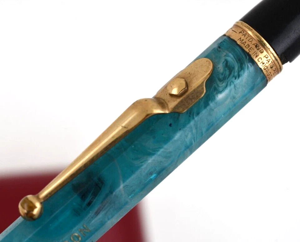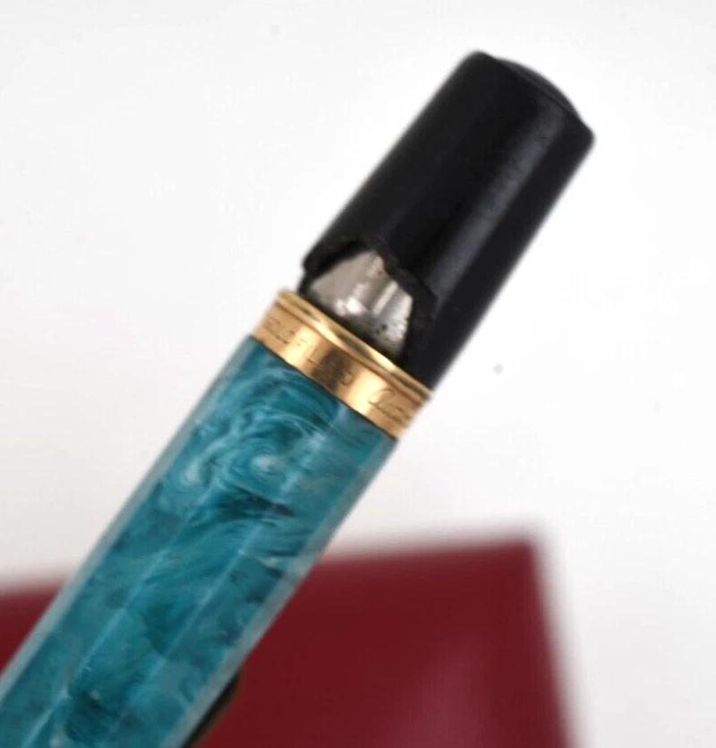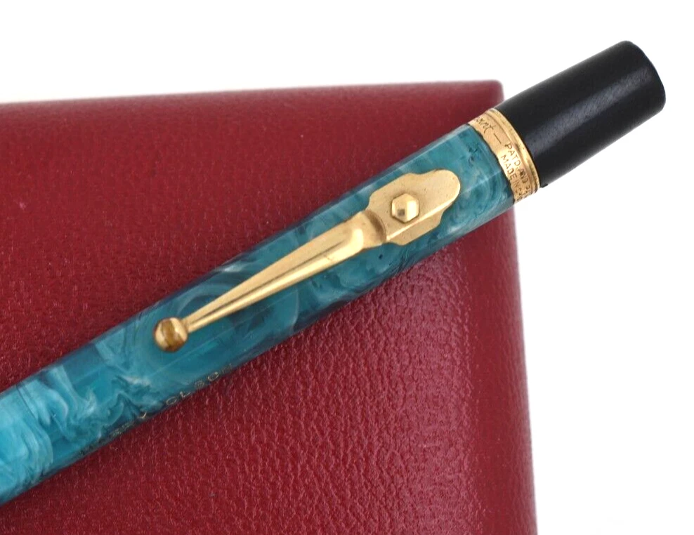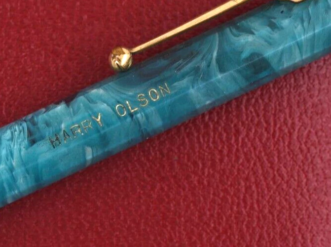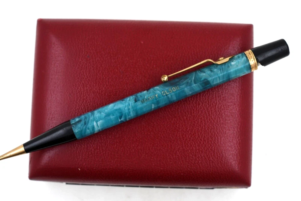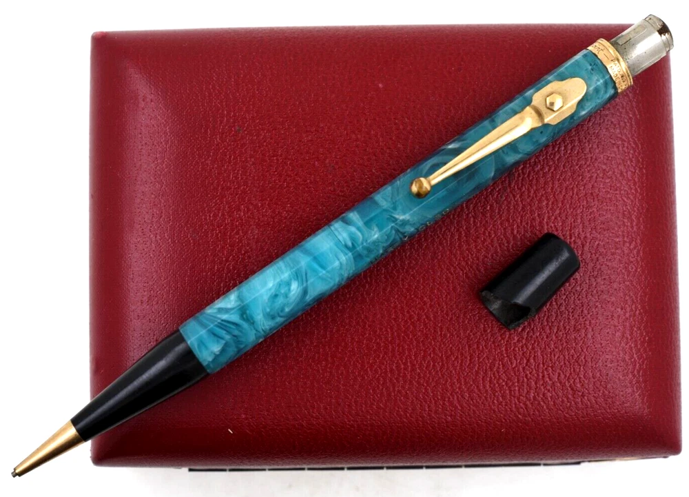 This is a beautiful vintage Autopoint pencil from a local estate. It measures 5 ¾ inches long. the barrel is 10-sided. Blue celluloid with white swirling. You can see through it when held to the light. The end pieces are back, and the trim is yellow gold filled. The pen has a name engraved on the barrel. Also, the black top cap is chipped with a piece missing. But you can replace it with another one from a commoner black pencil. I am not sure if it will work or not, so I will offer it as is. A very rare model, seldom seen in need of basic restoration. Buyer pays shipping, $4 in USA. Thank you.