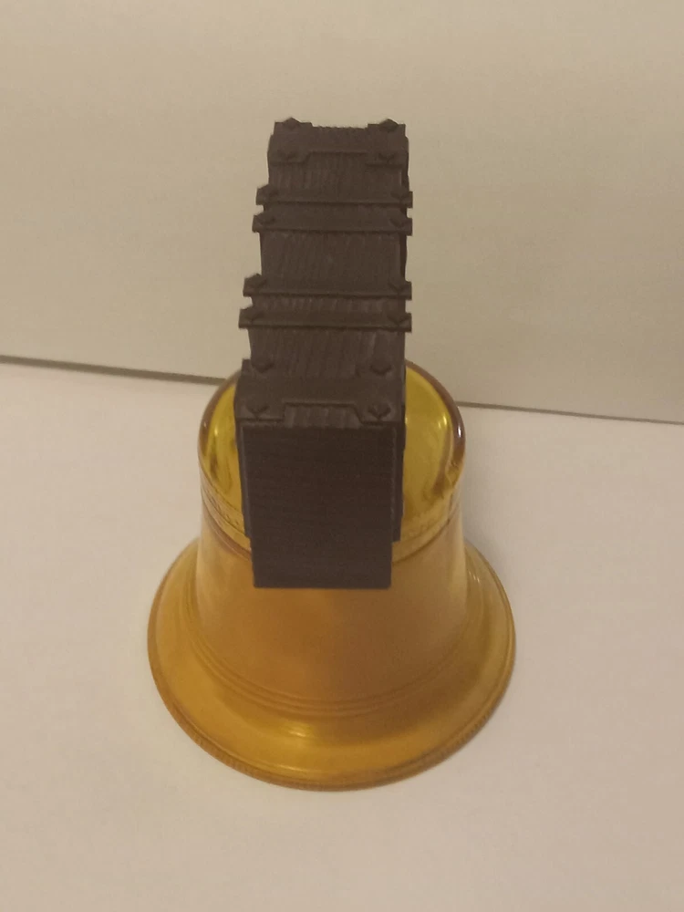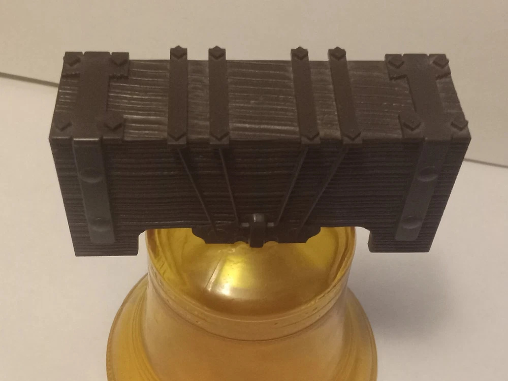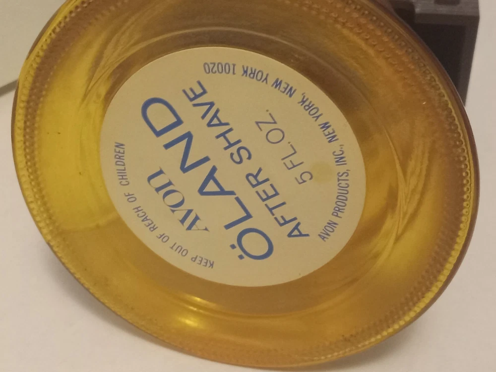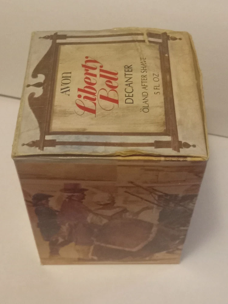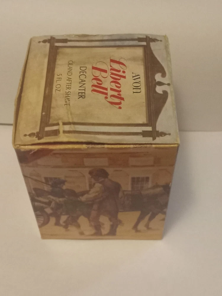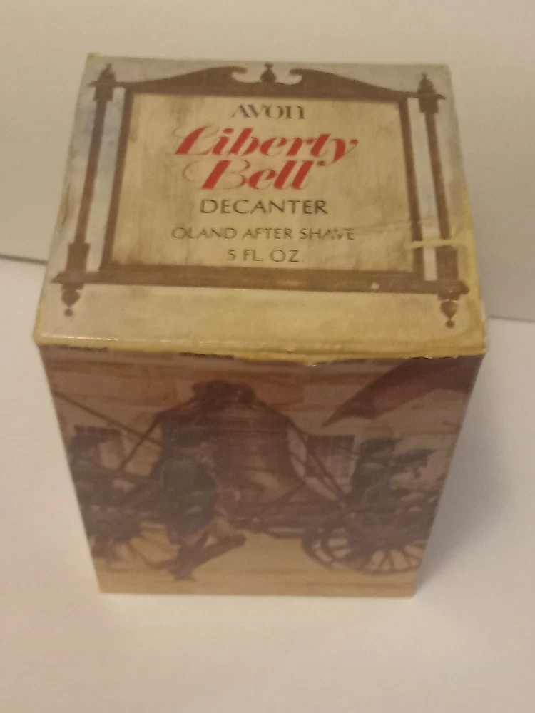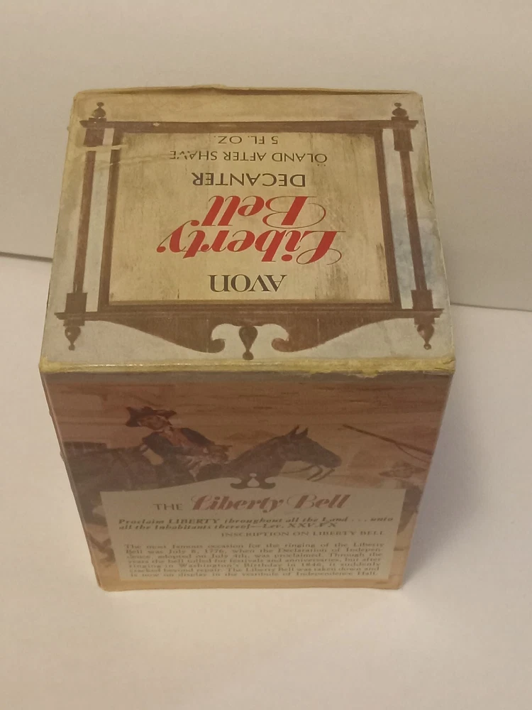 Vintage Avon Liberty Bell Decanter from 1976 featuring a Liberty Bell shape and a patriotic theme. This collectible item is made of glass and plastic, with a glossy gold finish. It comes empty with a lid and original box, representing the late 20th-century American style. The decanter holds 5 fluid ounces of Oland aftershave.