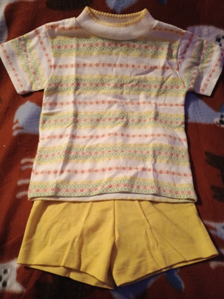 This Vintage Baby Girls Clothing set in size 4t is an adorable 2-piece outfit perfect for the warmer seasons of summer and spring. The set includes a yellow short-sleeve top and matching shorts, made from a comfortable cotton blend fabric. With a vintage style reminiscent of the 60s, this Healthtex brand set is ideal for little girls who love a retro look. Easy to mix and match with other items in their wardrobe, this outfit set is a must-have for any fashion-forward toddler.