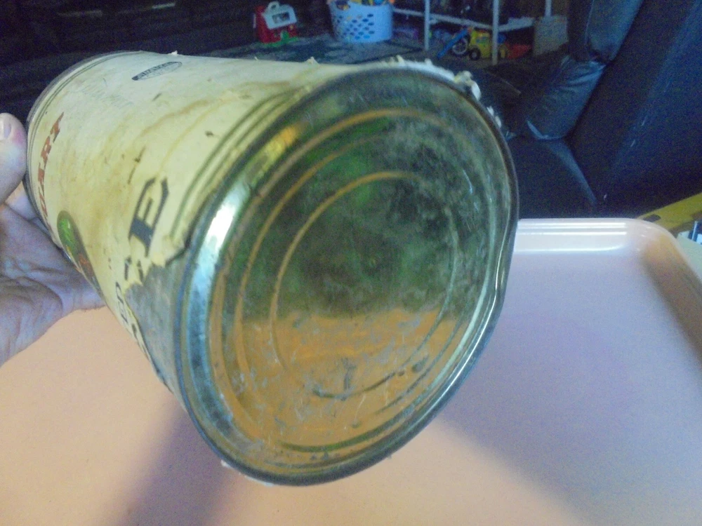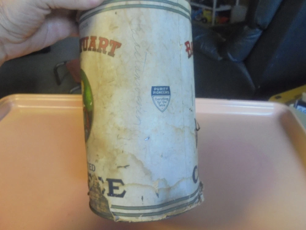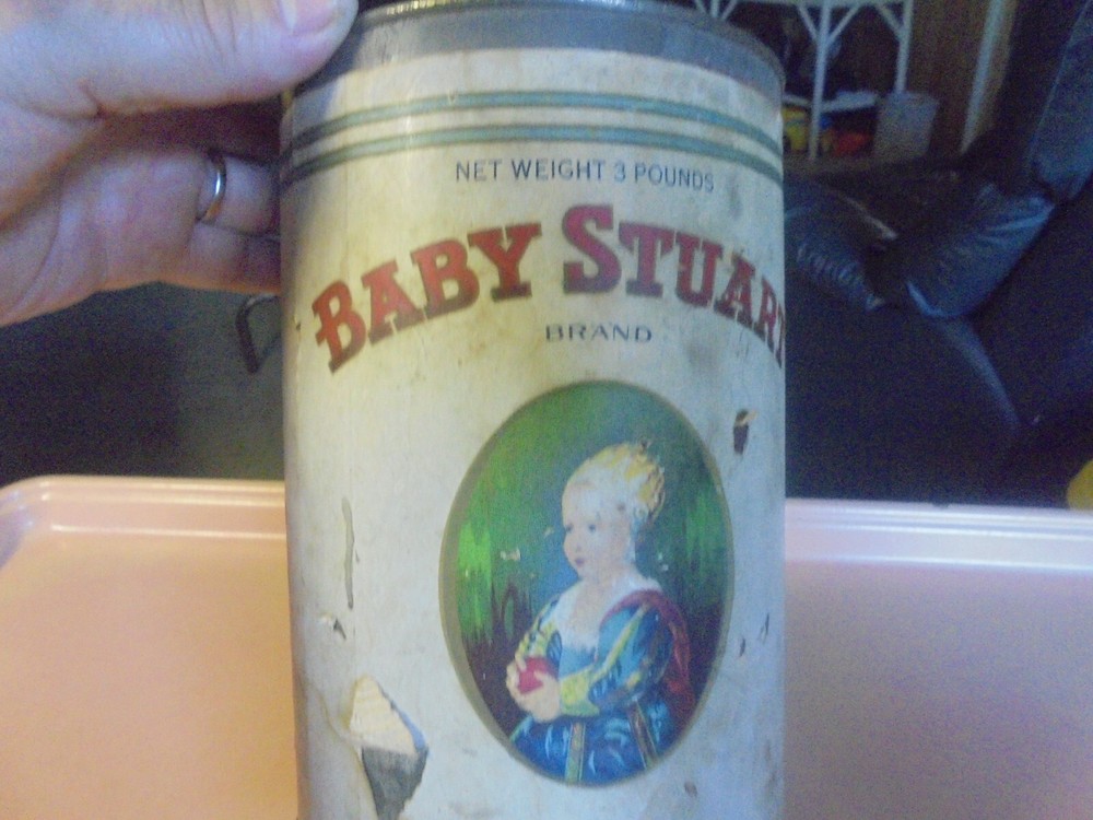 You are bidding on a three lb. Baby Stuart coffee tin. It has a paper label. The label has some tears and some pieces of paper missing. The label has some soiling and wear. Roasted and Packed by Sprague, Warner & Co., Chicago, Ill.. The top lid is missing. It is 5 and 1/2 inches in diameter and 9 and 11/16 inches tall. It is in fair to good condition. I combine shipping on multiple purchases.