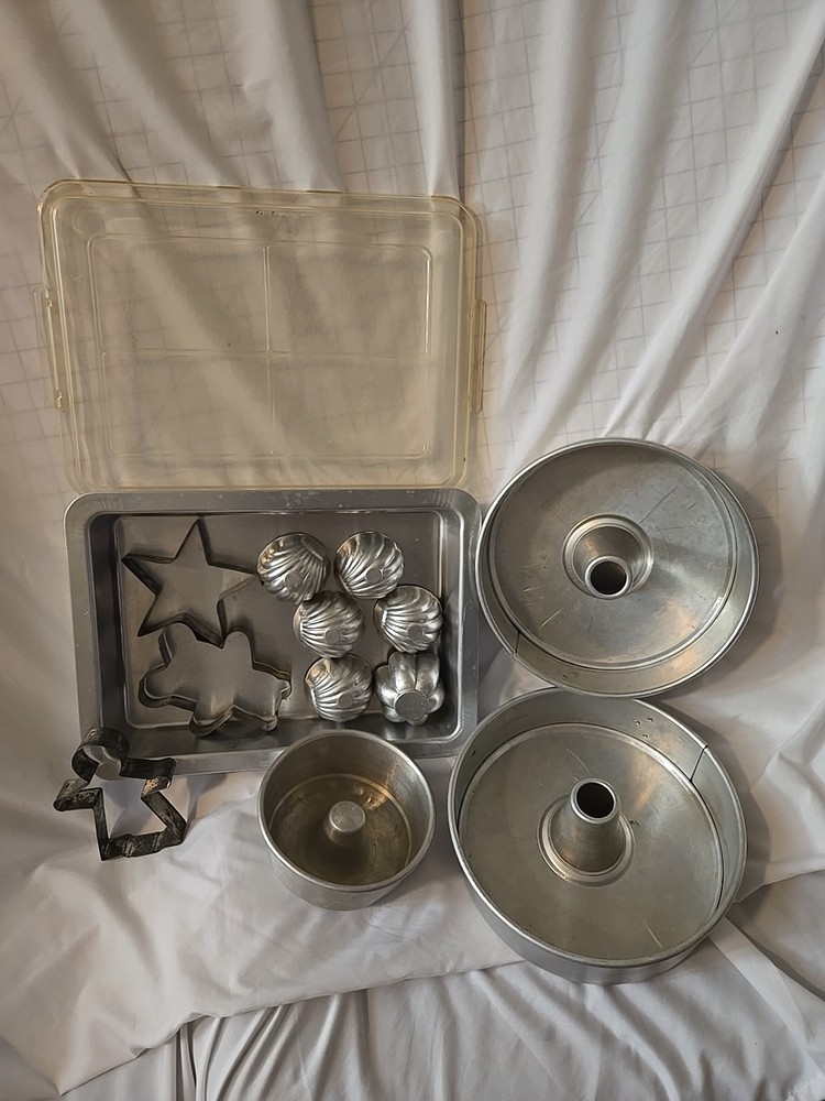 Lot Of Vintage Baking Items Cake Cupcakes Molds Cookie Cutters. This lot includes two spring cake molds, 1 9×13 cake mold and more, see pictures as they are part of the description.