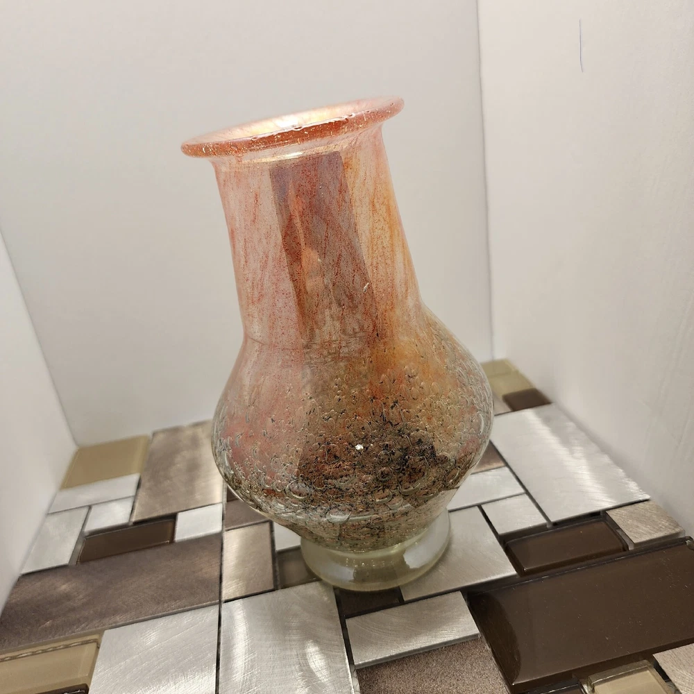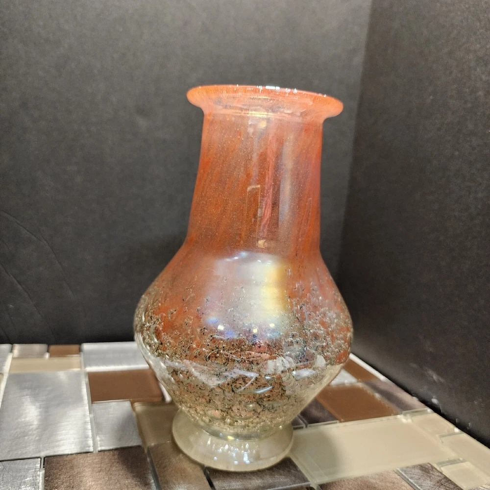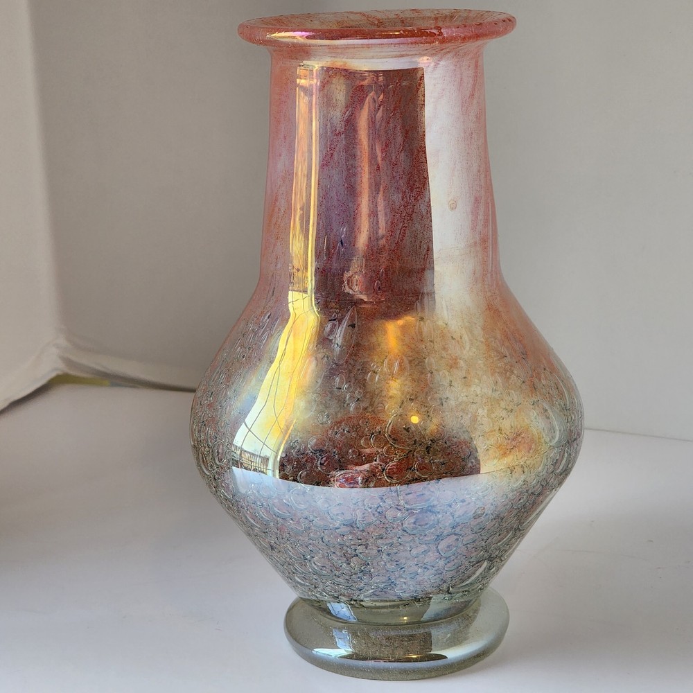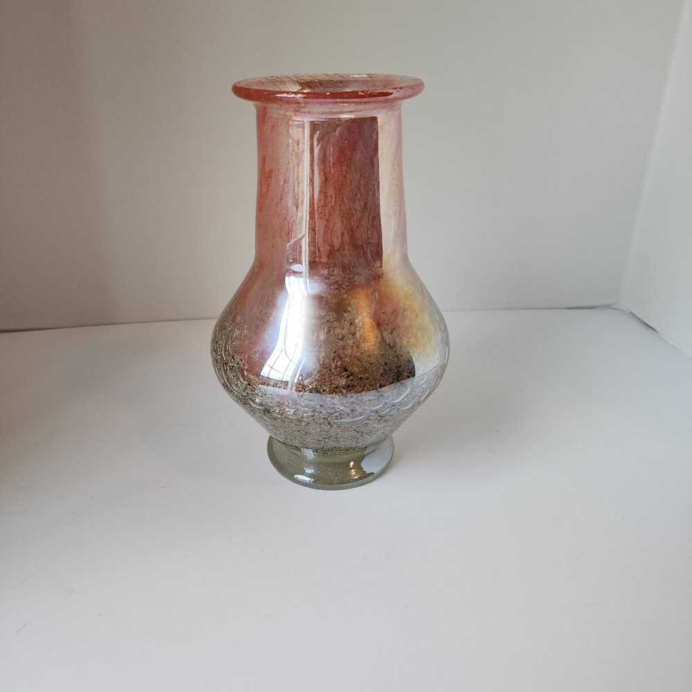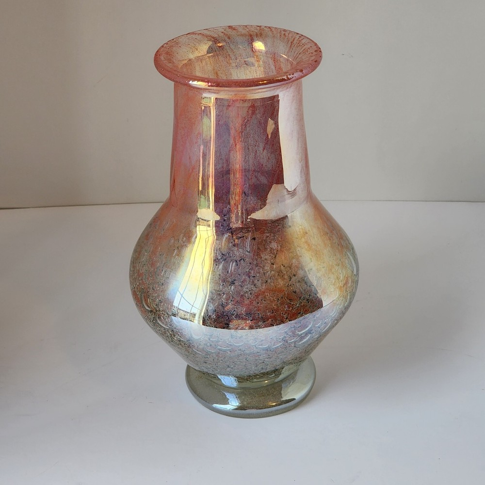This vintage Luminarc vase is a beautiful addition to any collection. The swirl pattern and iridescent pink/peach color make it a unique and eye-catching piece. Measuring at 7 inches in height and 8 inches in length, it's the perfect size for displaying flowers or other decorative items. Made of high-quality crystal, this vase is both delicate and durable. Its antique charm is sure to impress any guest. Whether you're a collector or just looking for a charming vase to add to your home decor, this piece is sure to delight.