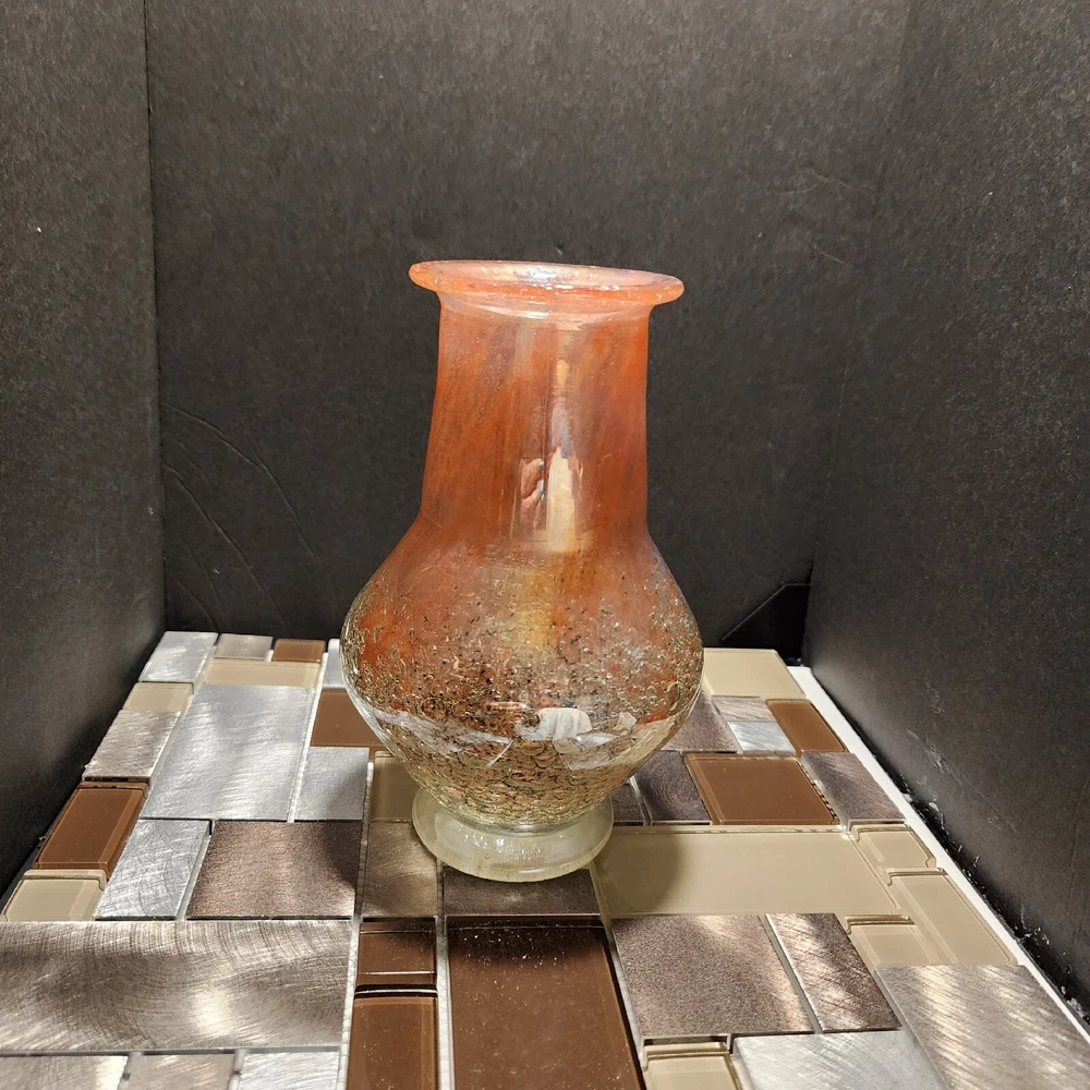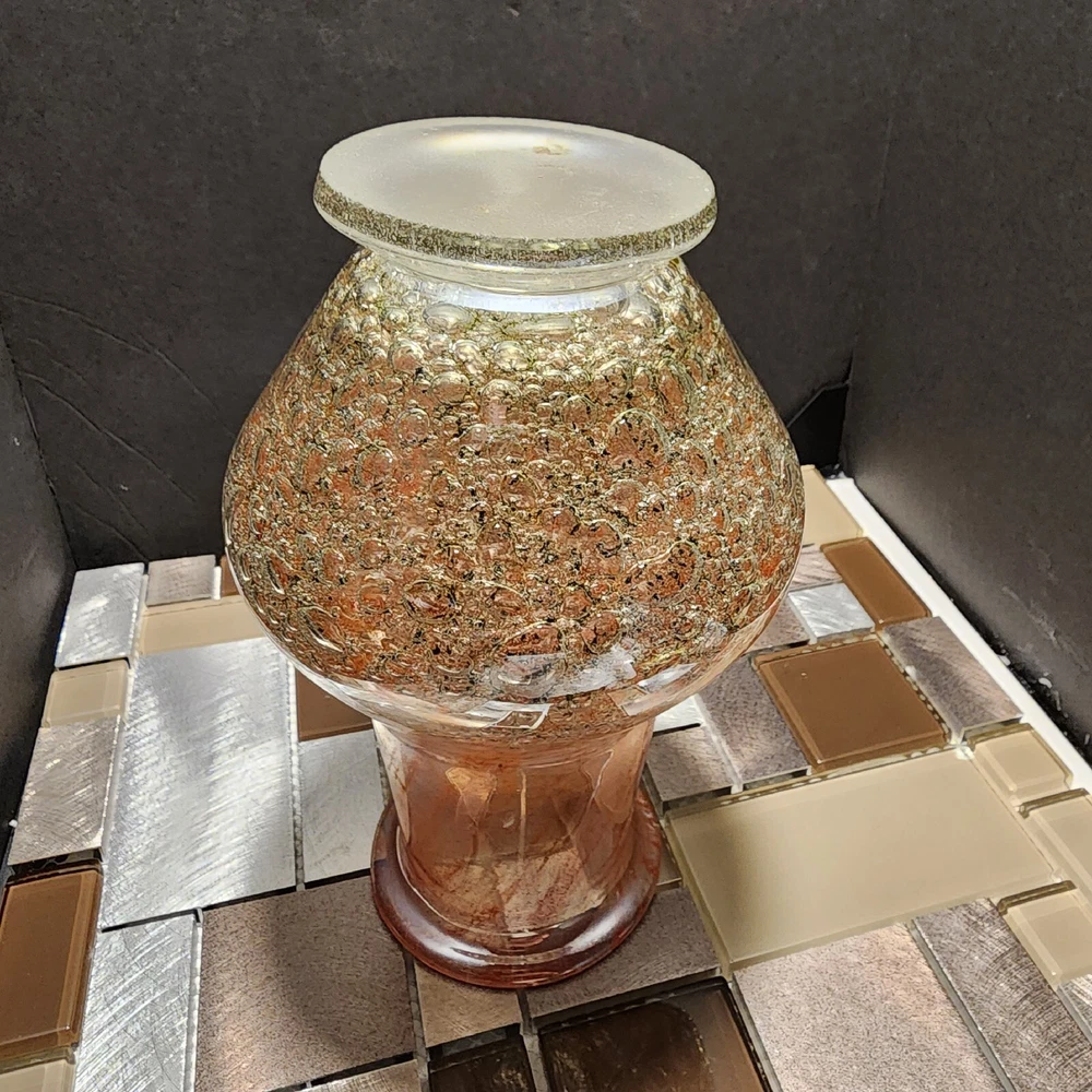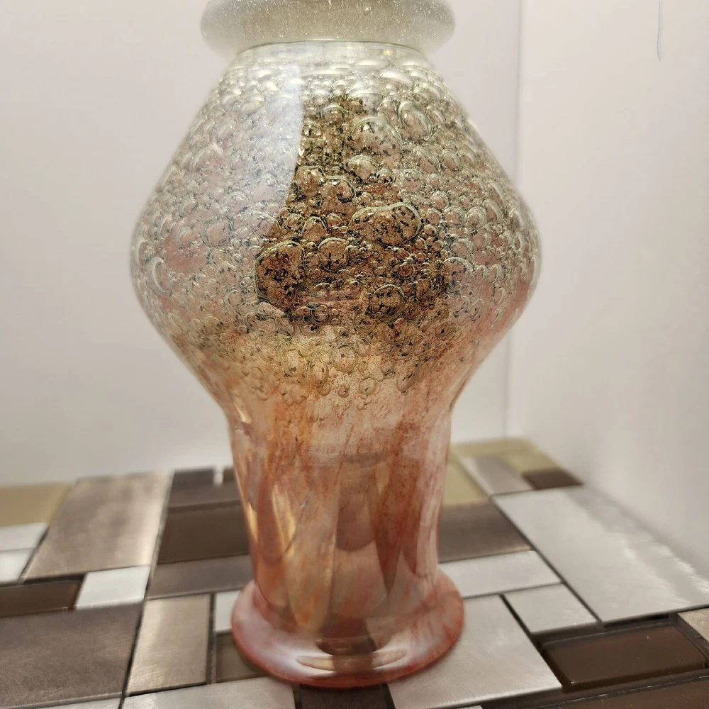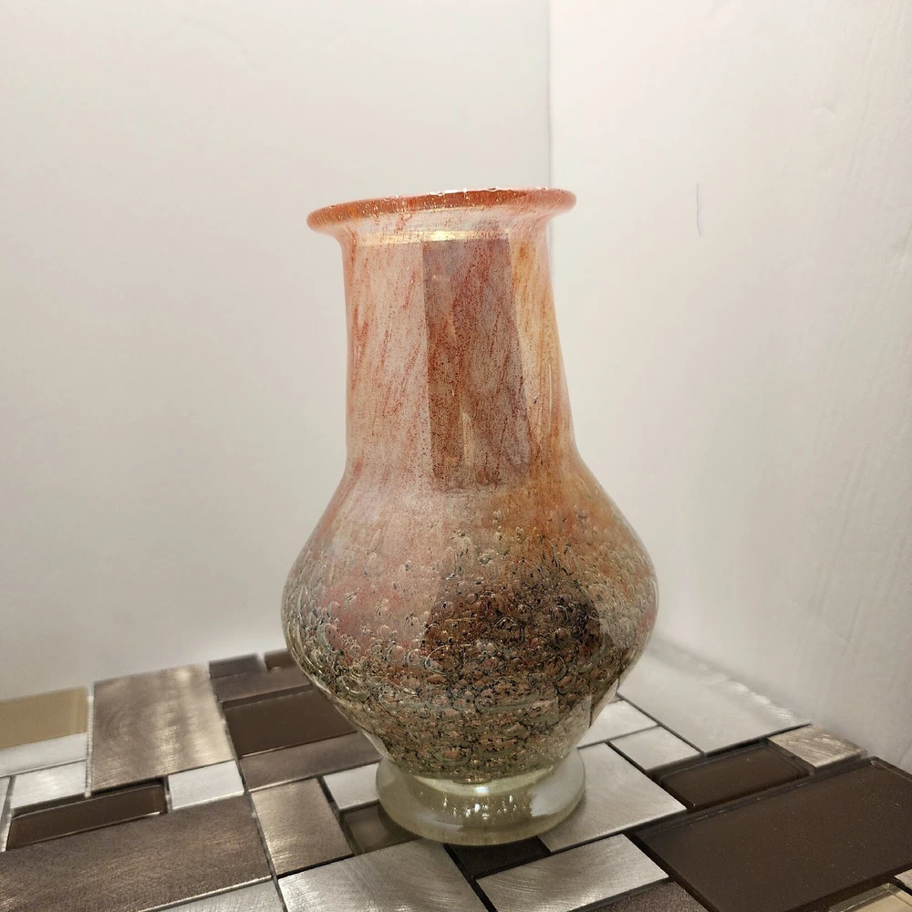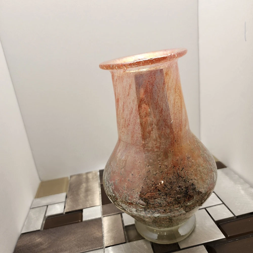 This vintage Luminarc vase is a beautiful addition to any collection. The swirl pattern and iridescent pink/peach color make it a unique and eye-catching piece. Measuring at 7 inches in height and 8 inches in length, it's the perfect size for displaying flowers or other decorative items. Made of high-quality crystal, this vase is both delicate and durable. Its antique charm is sure to impress any guest. Whether you're a collector or just looking for a charming vase to add to your home decor, this piece is sure to delight.