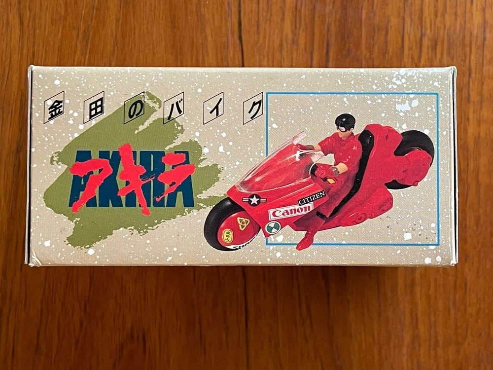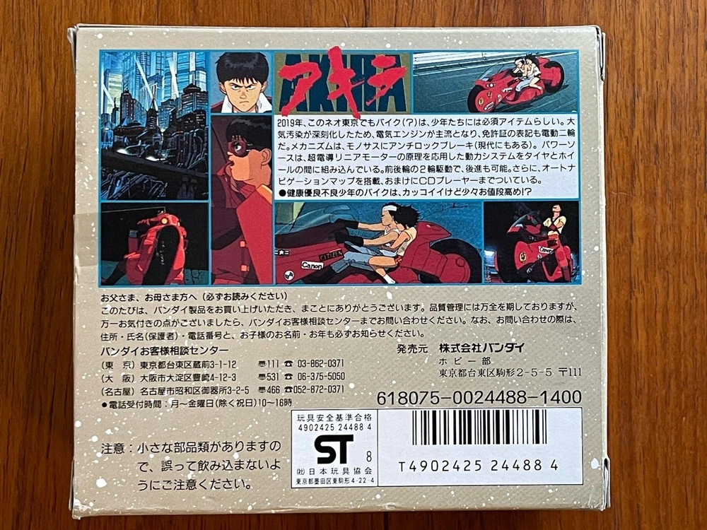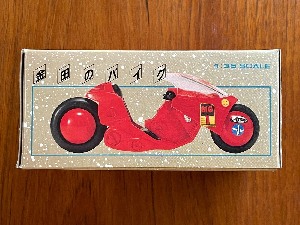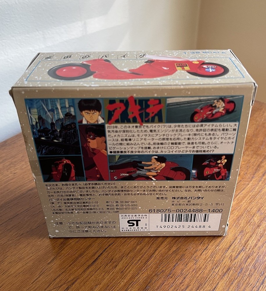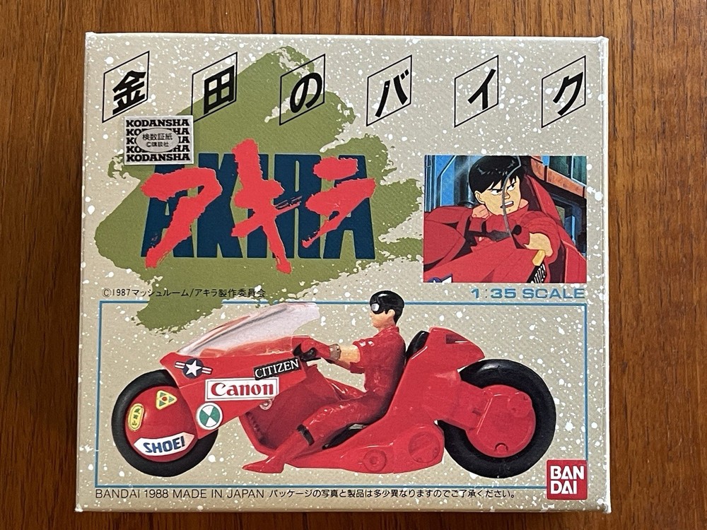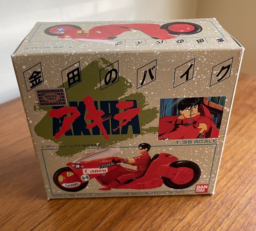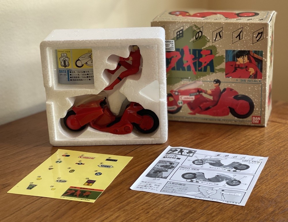 Vintage 1988 Bandai die-cast toy. AKIRA Kaneda's Motorcycle 1-35 Scale Toy in Excellent condition from Japan In original Box with original foam inserts which are also in Very Excellent Condition. All original packaging & inserts are included. *Stickers unused and in excellent condition. Which is quite rare to see! Insanely good original Bandai boxed toy for Katsuhiro Otomo's anime cult classic 'Akira' (1988), featuring biker gang leader Shōtarō Kaneda with his beloved & Iconic custom red motorcycle. Made in Japan by Bandai. Comes complete in the original box, original protective foam inserts with tri-fold info card, instructions and unused sticker sheet (pictured). The box alone is a thing of beauty and all pieces are in excellent condition for their age. Essential shelf material for any Akira Fan. I am the original owner of this toy. It was barely used and was stored very well in non- smoking environment. *There is a light spot of what looks like wear from being in foam inside box. Please see all photos to confirm quality & condition. I welcome any questions. Thanks for looking!