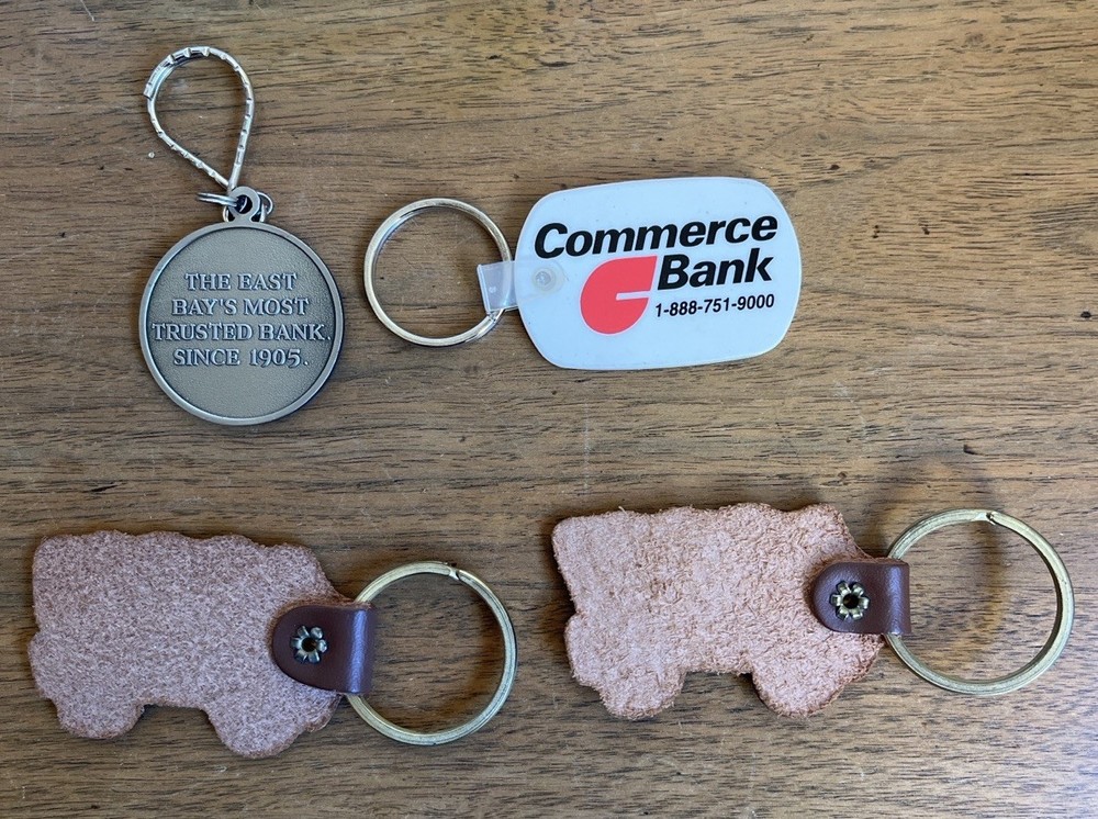 Vintage Bank Keychains Lot Mechanics Bank 90th Anniversary Western Federal Commerce Nice mixed lot of vintage bank advertising keychains and commemorative fobs, including Mechanics Bank, Western Federal, and Commerce Bank. Vintage lot of bank memorabilia keychains and promotional fobs including Mechanics Bank, Western Federal, and Commerce Bank. This mixed group includes: • The Mechanics Bank commemorative metal key fob / medallion • Front reads: “The Mechanics Bank 90th Anniversary” • Reverse reads: “The East Bay’s Most Trusted Bank Since 1905” • Two Western Federal genuine leather keychains • Brown leather with suede backs • Brass-tone split rings • Matching pair • One Commerce Bank plastic key tag • White/gray with red and black logo and phone number A nice small group of vintage and older promotional banking items with good display appeal and collectible crossover in advertising, banking, ephemera, and keychain memorabilia. Overall good vintage condition with age/use consistent with promotional items of this type. • Mechanics Bank metal fob shows light surface wear / minor patina • Western Federal leather keychains show light handling wear; leather remains intact with suede backs visible • Commerce Bank plastic tag shows light scuffing / normal wear • Rings and attachment hardware are present Please review all photos carefully for exact cosmetic condition and details. These older bank advertising pieces were everyday promotional giveaways and are getting harder to find in groups, especially with different materials and styles represented in one lot. A fun lot for collectors of: • Bank memorabilia • Advertising collectibles • Vintage keychains / key fobs • Financial institution ephemera • Americana desk / office display items Sold as shown. Ships carefully packed. Nice find!