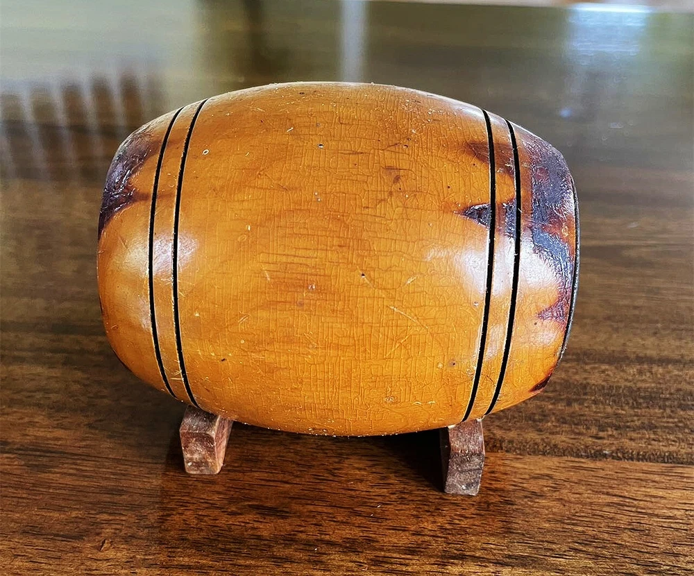 This vintage bank is a must-have for any collector of unique items. Made of wood and designed in the shape of a whiskey barrel, it is the perfect addition to any man's collection. Measuring 6 inches in length, it comes with a stand and key included. The bank is perfect for storing coins and is sure to impress anyone who sees it. The whiskey barrel theme adds a touch of nostalgia and makes it a great conversation piece. Made in an unknown country/region of manufacture, this bank is a rare find and a great treasure for any collector.