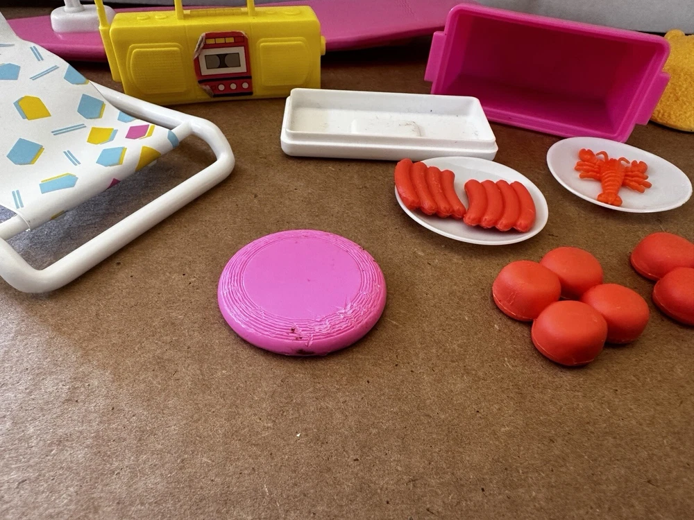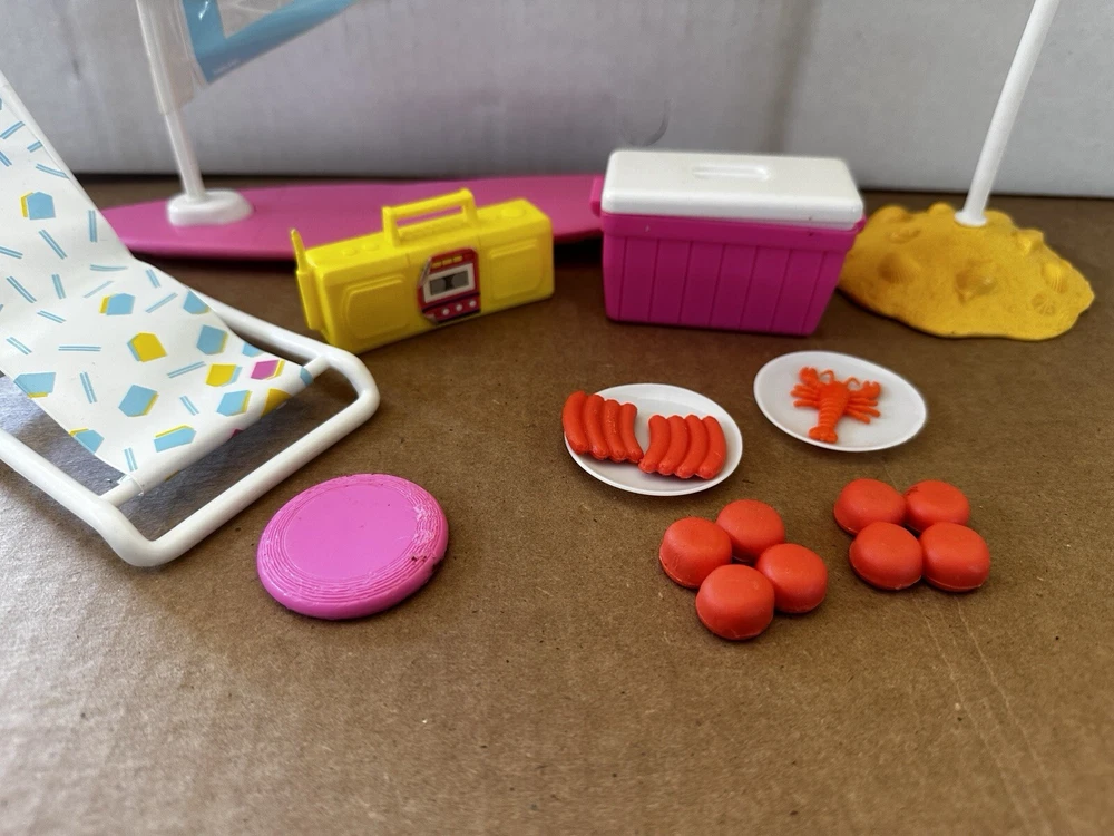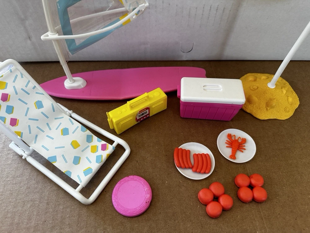 Some minor wear, see photos Frisbee has some wear and marks This vintage Barbie and Skipper Beach Party Playset #7332 by Mattel, manufactured in 1987, is a collector's dream. With several pieces, including both dolls, this original set is perfect for any occasion, especially parties. The set features outdoor adventure and requires adult assembly. The dolls are 11 inches in size and are gender-neutral. The packaging is not included, but the set is in great condition. This Barbie and Skipper set is perfect for anyone who loves Barbie and Skipper and wants to add to their collection.