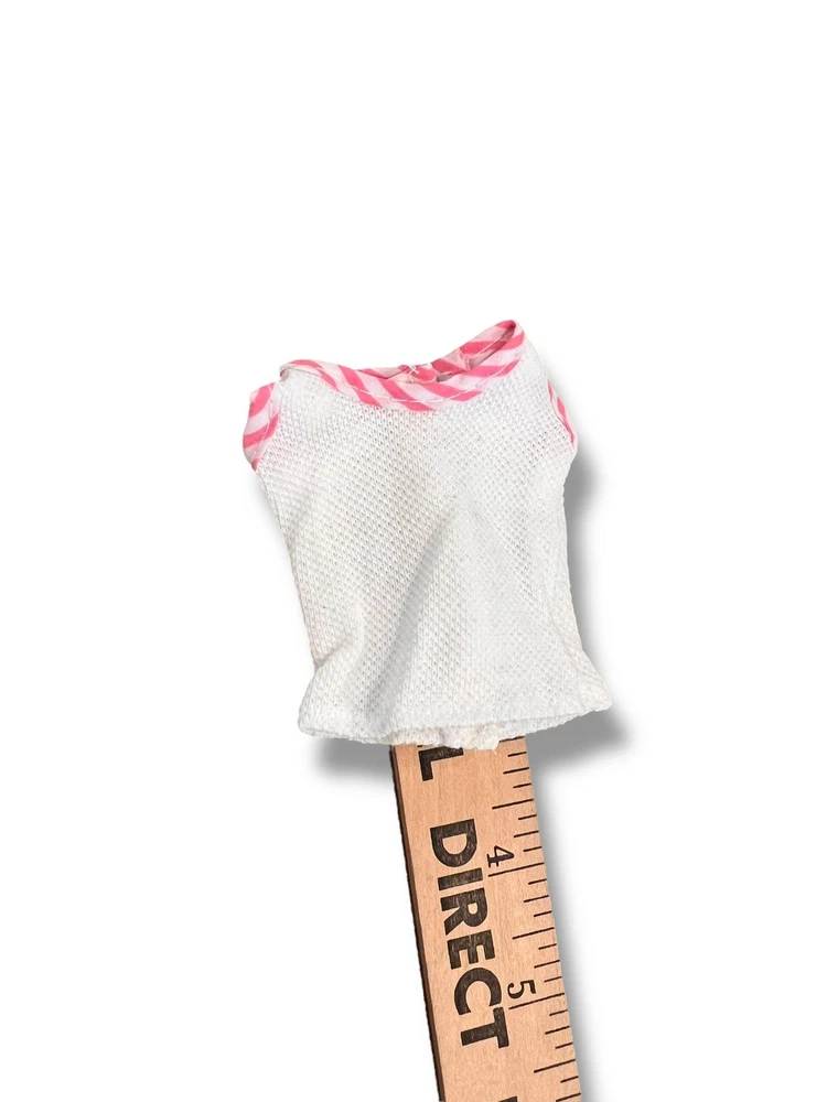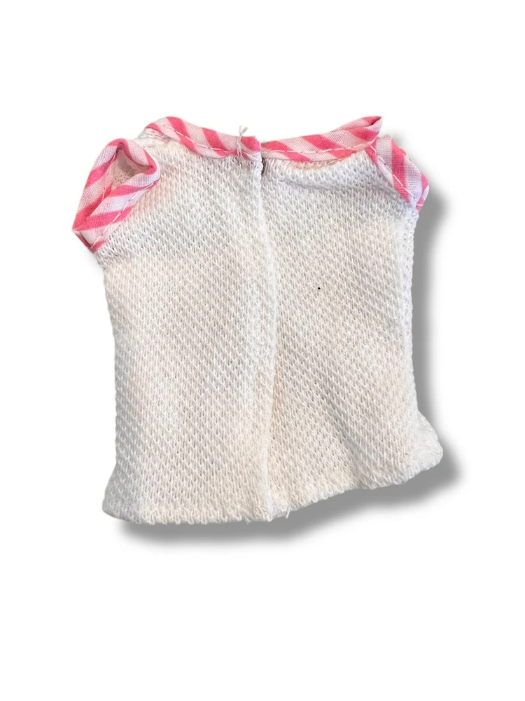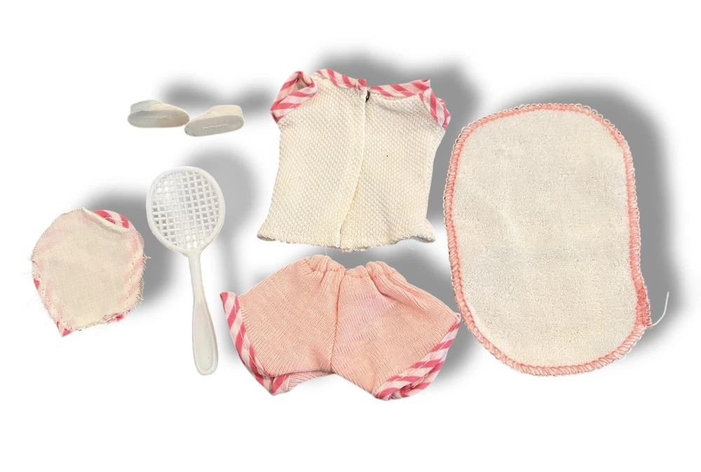 Skipper- Pink tennis outfit w/accessories plastic tennis rackets with cover, shirt, shorts, towel and tennis shoes. All in good vintage condition. *shirt has tiny spot on the back that doesn’t show when the top is snapped closed. * one shoe has a faint blue stain Let us know if you have any questions or need additional photos. Check out our other listings for even more vintage, Barbie and friends, clothing, and accessories!