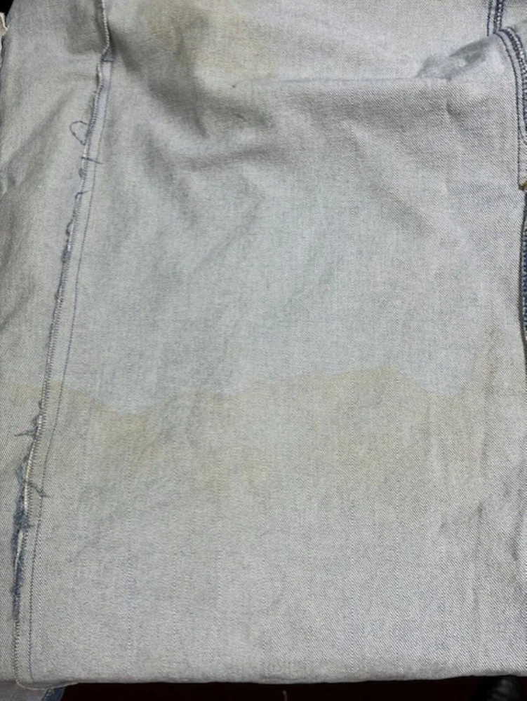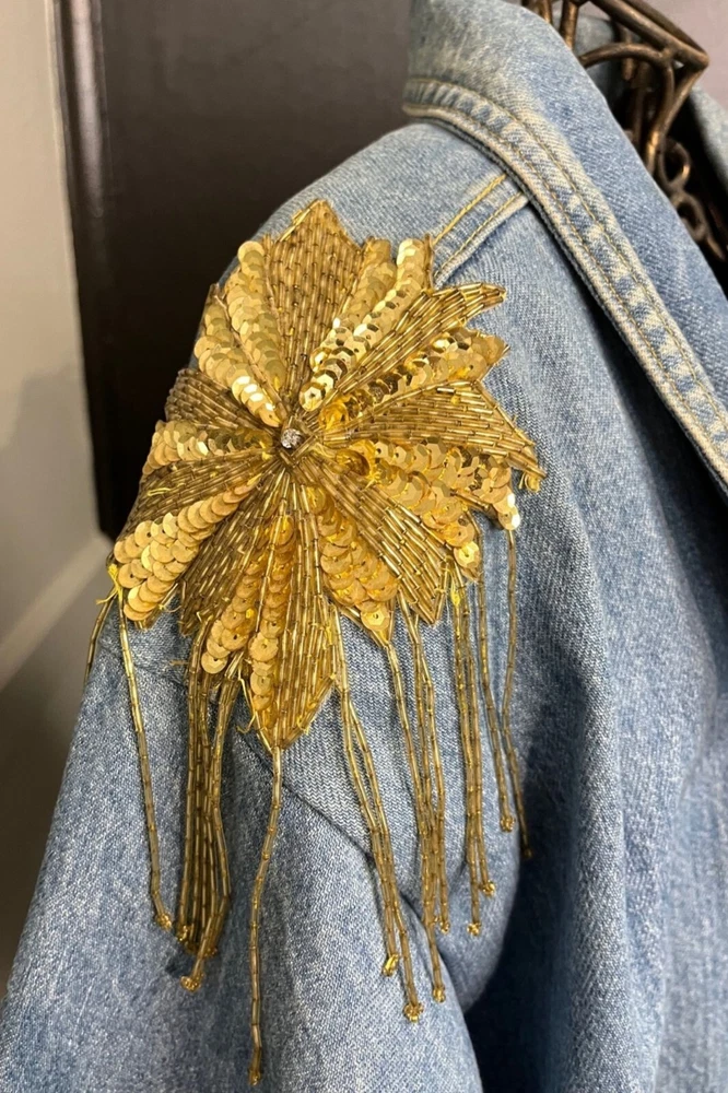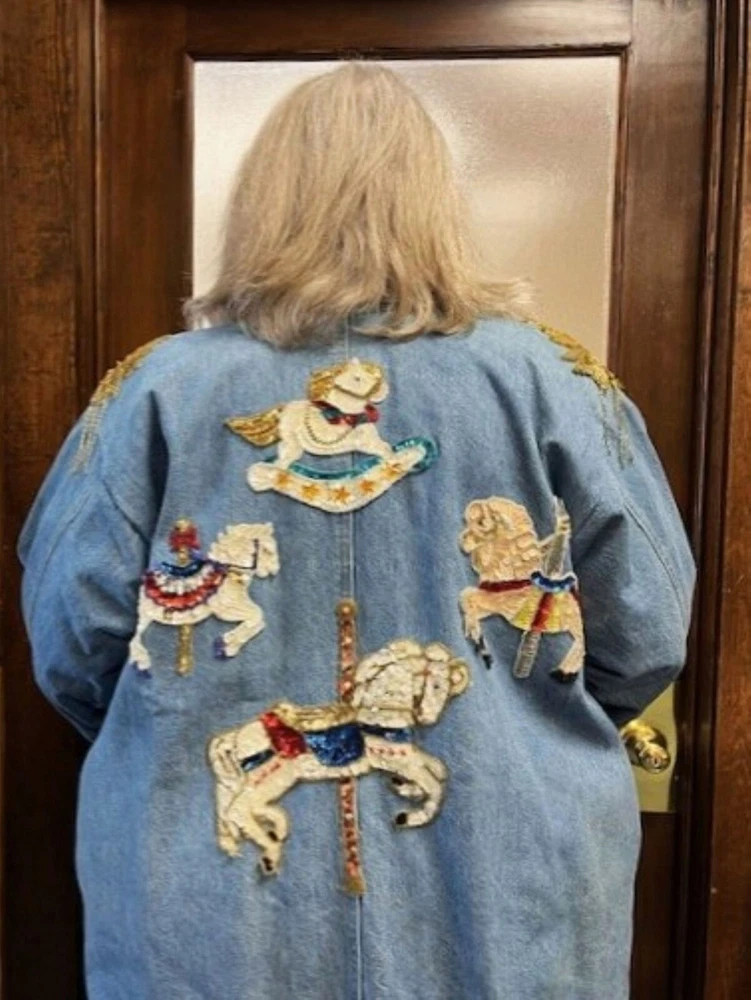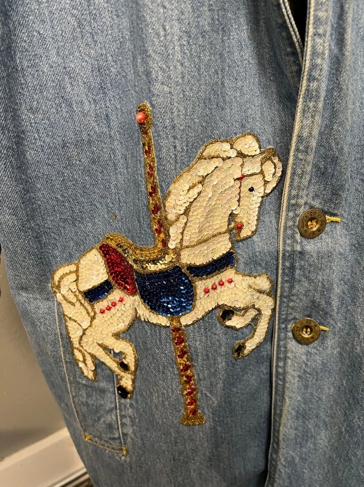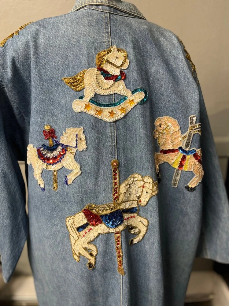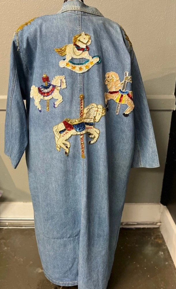This vintage barn coat/duster is a must-have for those who like the unusual or a statement piece. The blue denim material is accented with 8 large carousel horse sequin patches and shoulder epaulets, making it a unique addition to your wardrobe. The coat is designed with a long length and XL size, providing a comfortable and relaxed fit. There are 2 side pockets and 2 gold buttons. Sequin colors include red, blue, gold and white. Measurements: shoulder to sleeve tip is 21", shoulder seam to hem is 51", armpits across the back is 25.5", neck is 23", and a back slit is 19". The garment has been washed, but there are still traces of stains. See photos. The inside appears to have gotten wet across the lower part, but it does not show at all on the front. Perhaps the barn chores account for this before it was converted to a fancier garment! The estate always had show horses.