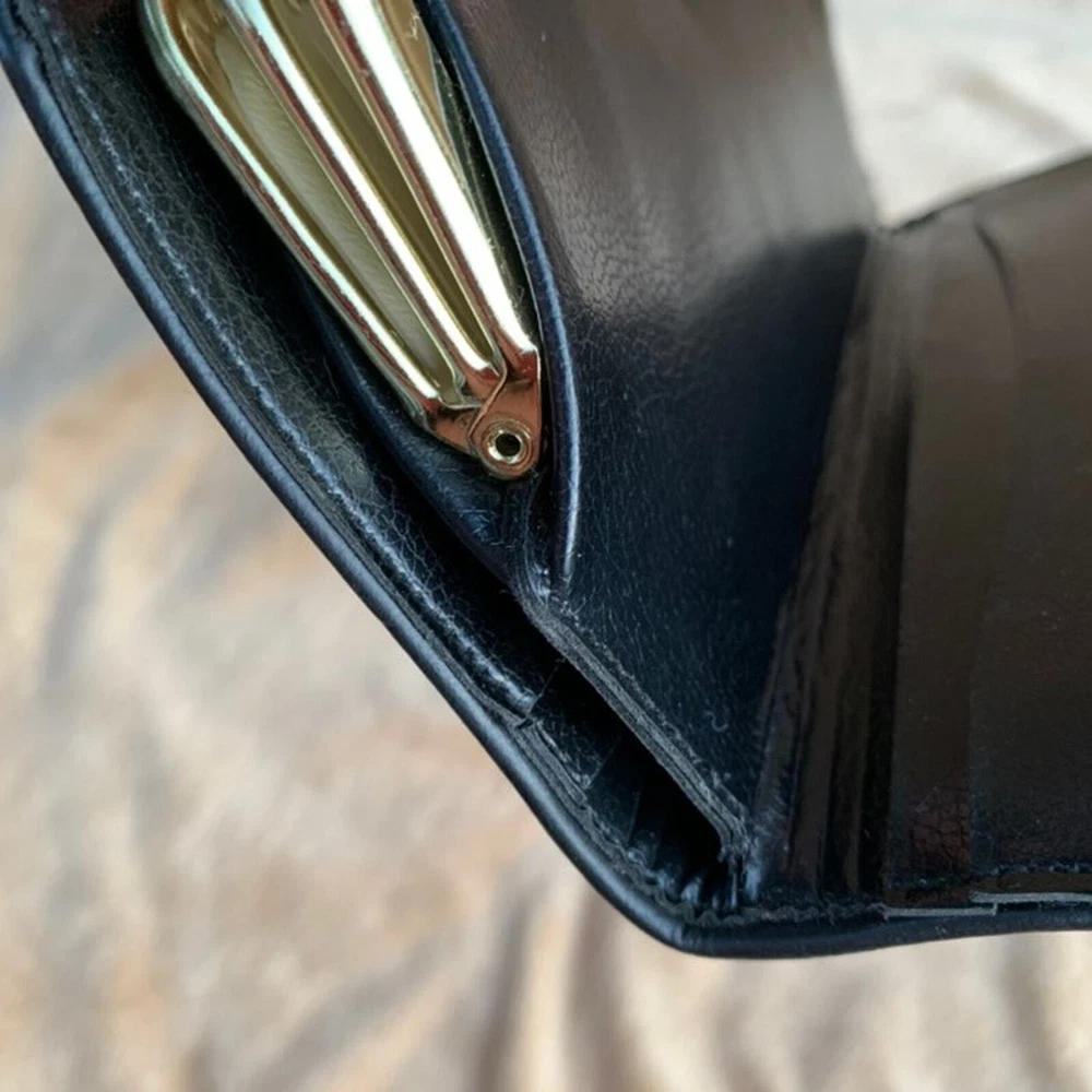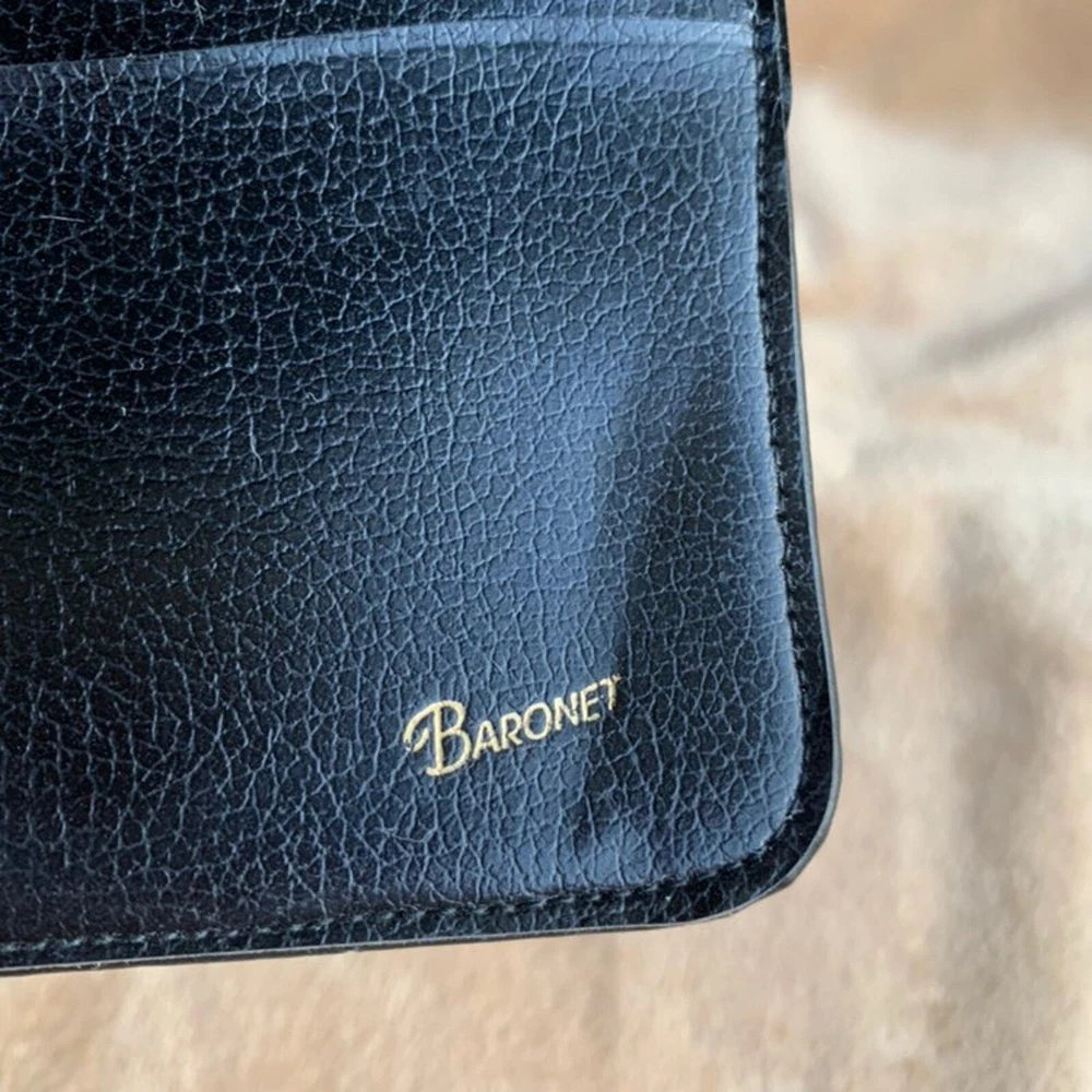This vintage Baronet wallet is a stylish gem! The navy blue leather with brass clasps and diamond studs gives it a classic, elegant look. The double clasp and clear divider keep everything secure, while the interior wear adds character. Perfect for those who love retro charm with practical storage. A unique find that stands out!
