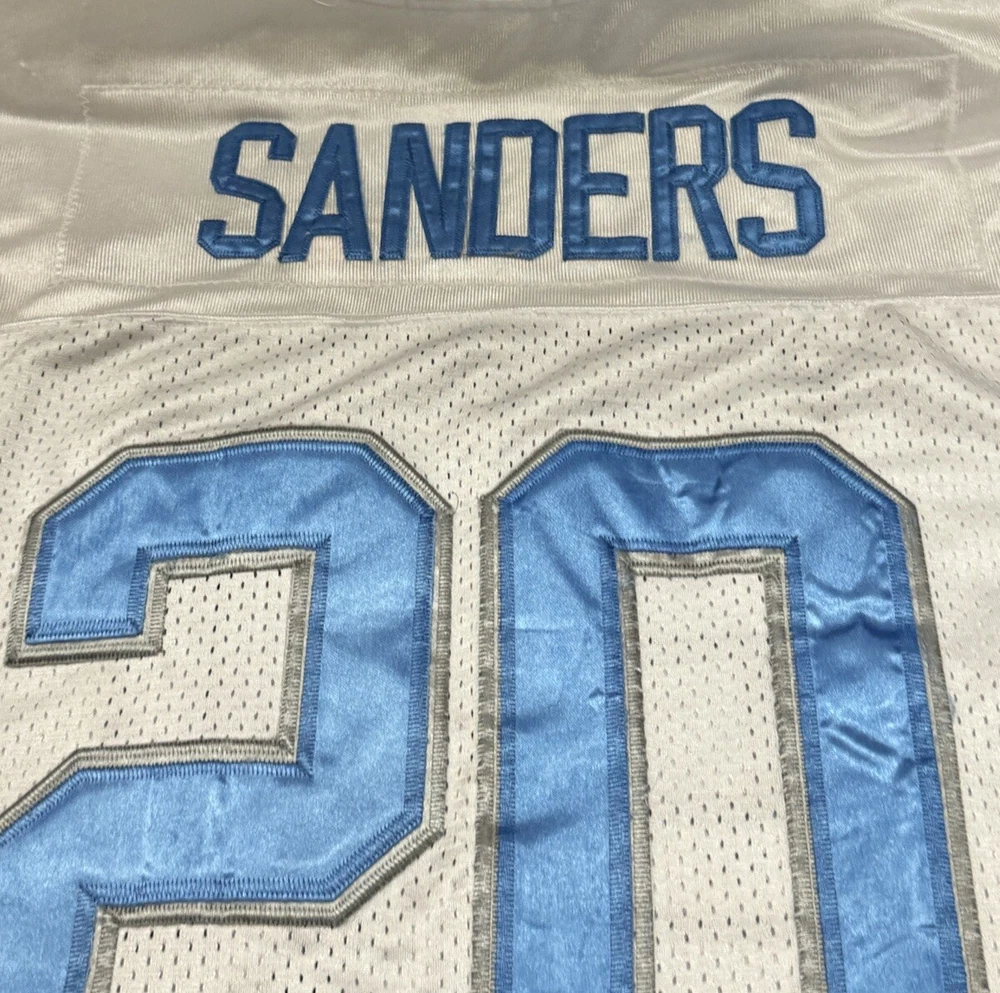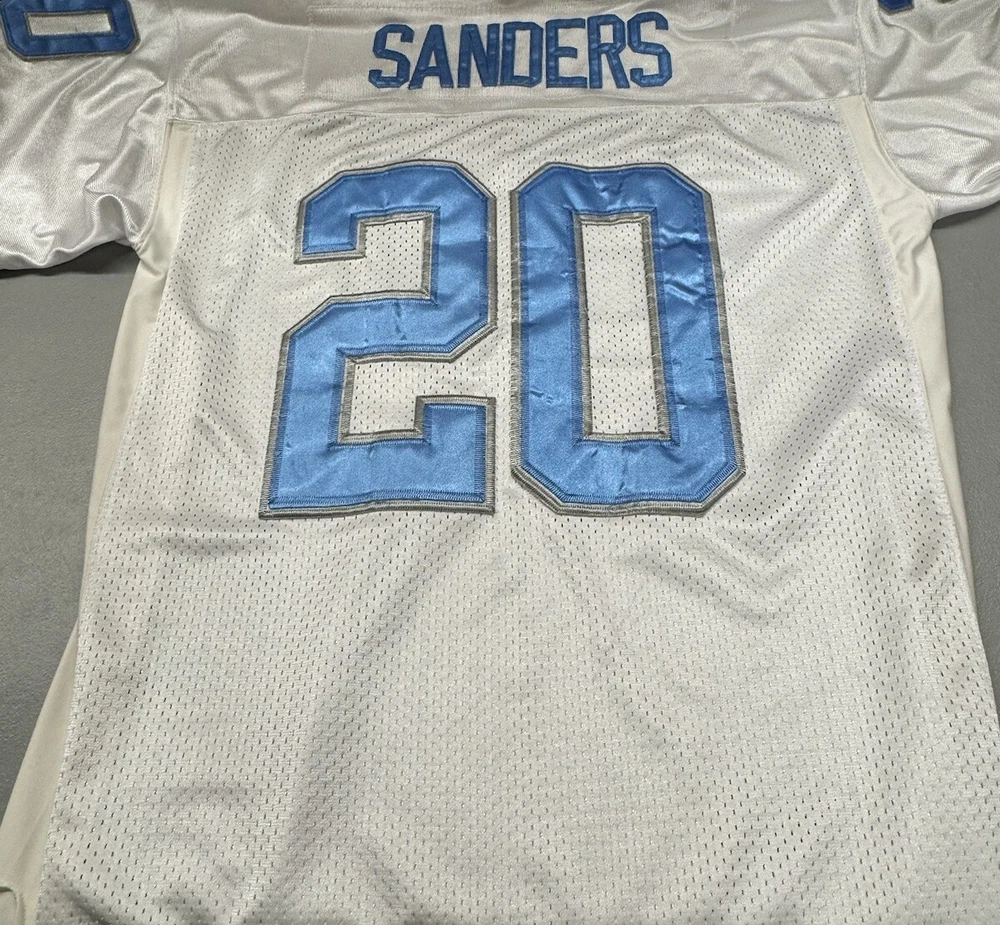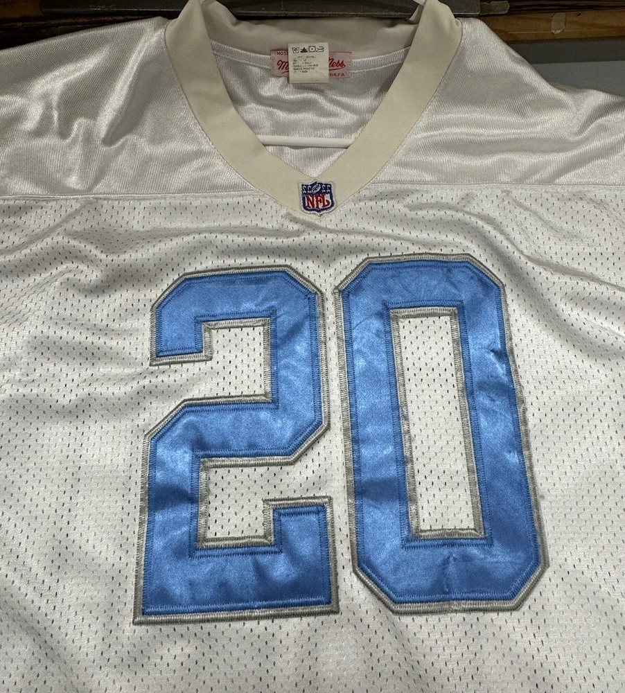 Show your love for the Detroit Lions and one of their greatest players of all time, Barry Sanders, with this vintage Mitchell & Ness throwback jersey. Featuring the iconic number 25 and the team's colors of white and blue, this jersey is perfect for any fan of the National Football League during the regular season. It's officially licensed and made for men, with a one size fits all design. Perfect for game day or displaying in your collection, this jersey is a must-have for any true football fan.