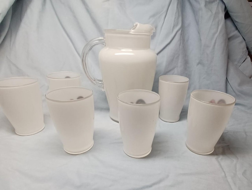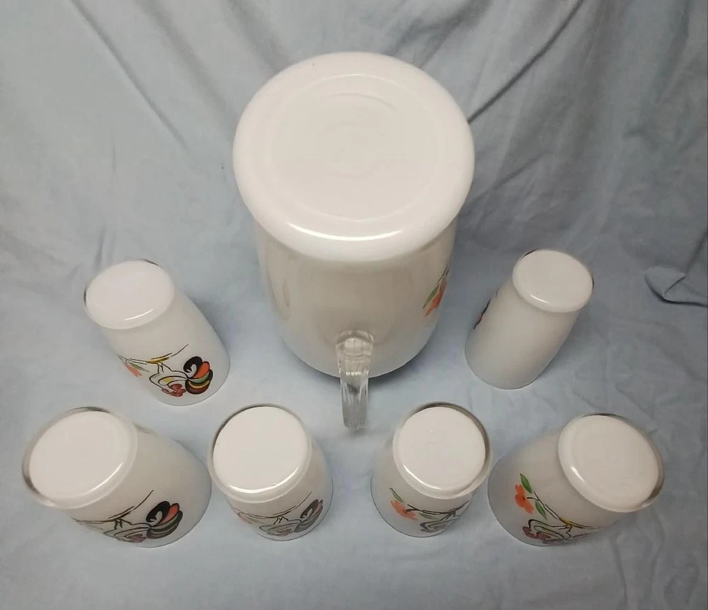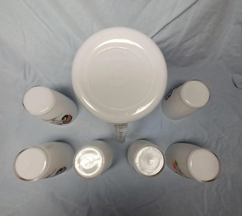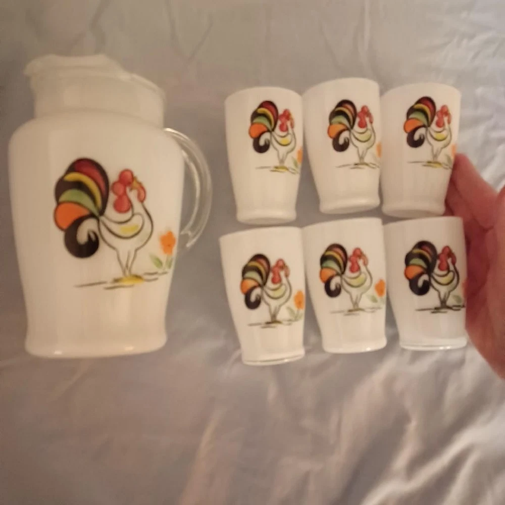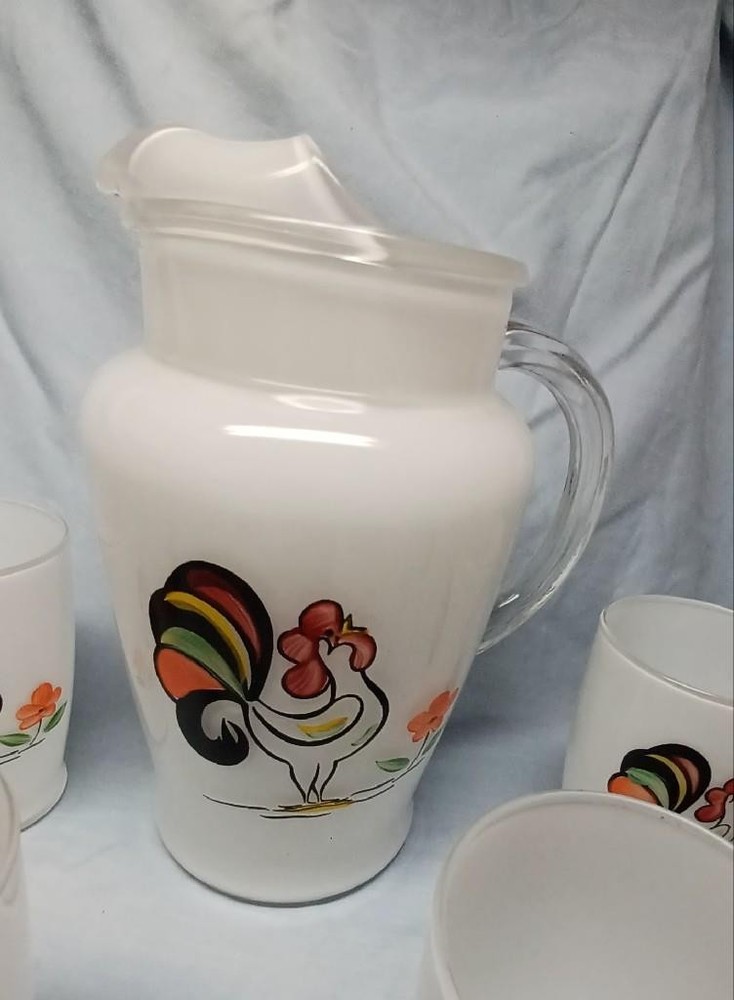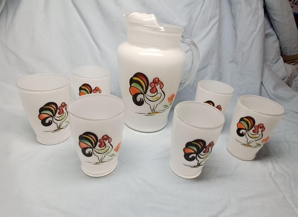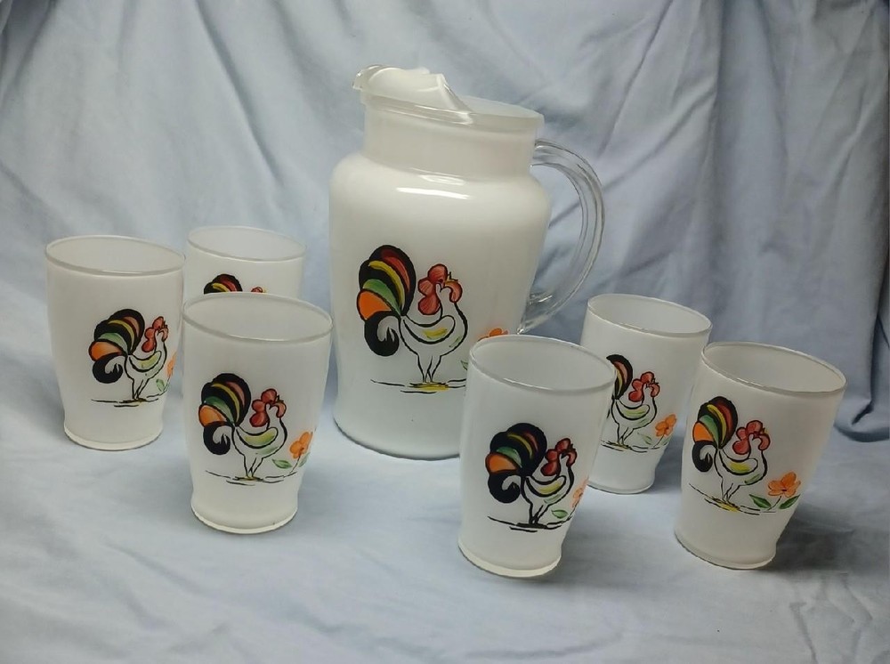 Bartlett Collins Proud Rooster Hand Painted Pitcher With 6 Glasses Vintage Bartlett Collins Proud Rooster Hand Painted Pitcher With 6 Glasses Vintage Click images to enlarge Description This listing is for one beautiful Bartlett Collins Proud Rooster 7 1/2" pitcher with six 3 5/8" juice glasses. I believe these are hand painted from the 1950s. All are in great condition with no chips or cracks. Great set for serving juice or cocktails. Great collectible set for rooster and chicken lovers. Please view images for condition. No returns. View My Feedback View My Other Items For Sale Payment Hello, my name is Alton Hargrave. All my products are guaranteed be as described or your money will be refunded. Terms of Sale Unless otherwise noted, I offer a money back guarantee after item is returned at buyer's expense in the same condition as received. Unpaid items will be reported to Ebay. Get images that make Supersized seem small. Showcase your items with Auctiva's Listing Templates! THE simple solution for eBay sellers. Track Page Views With Auctiva's Counter