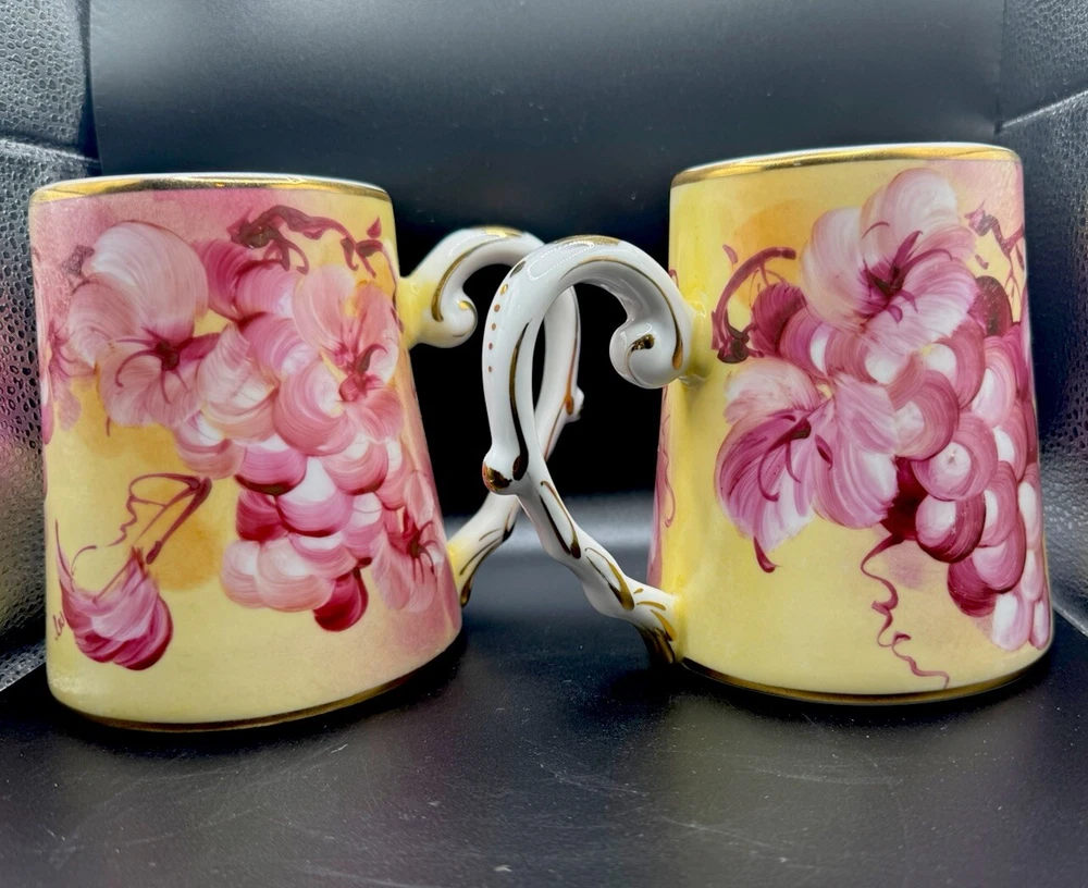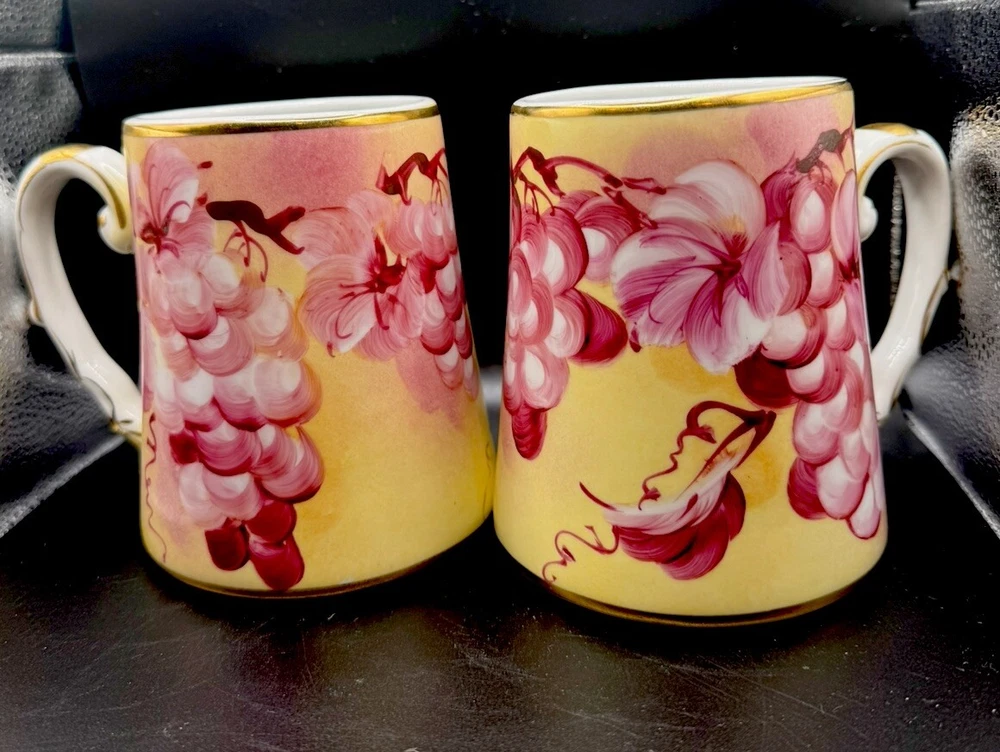 This vintage Limoges China mug set features a beautiful hand-painted design of yellow and pink grapes with gold accents. The two-piece set is made of porcelain in a matte finish, showcasing a capacity of 20 oz and an item height of 5 inches. The mugs are artfully crafted with a production style of art pottery, dating back to the 1980s. These mugs are a charming addition to any collection of decorative dinnerware. Perfect for a lovely Galentine’s or Valentine’s Day fun event!