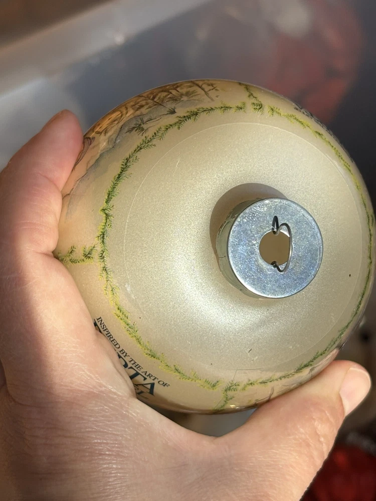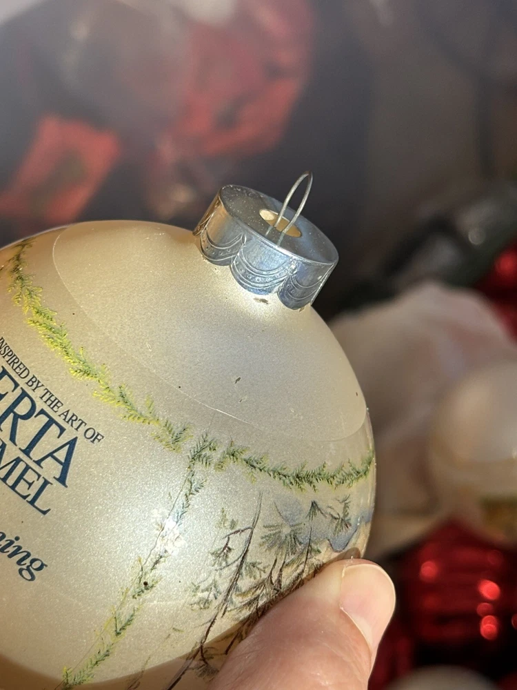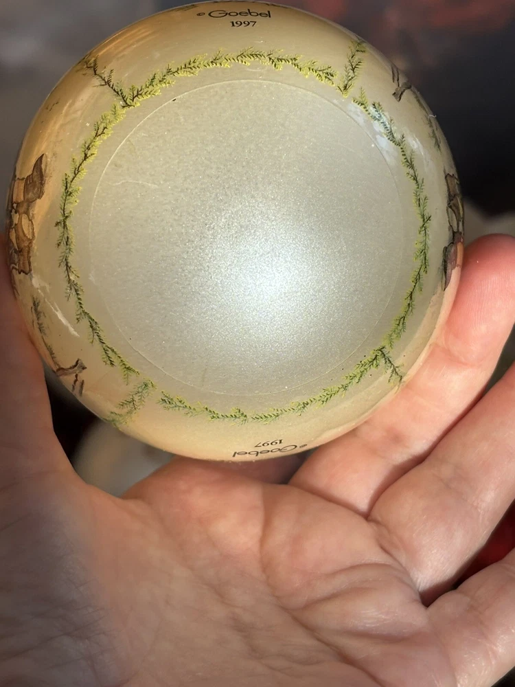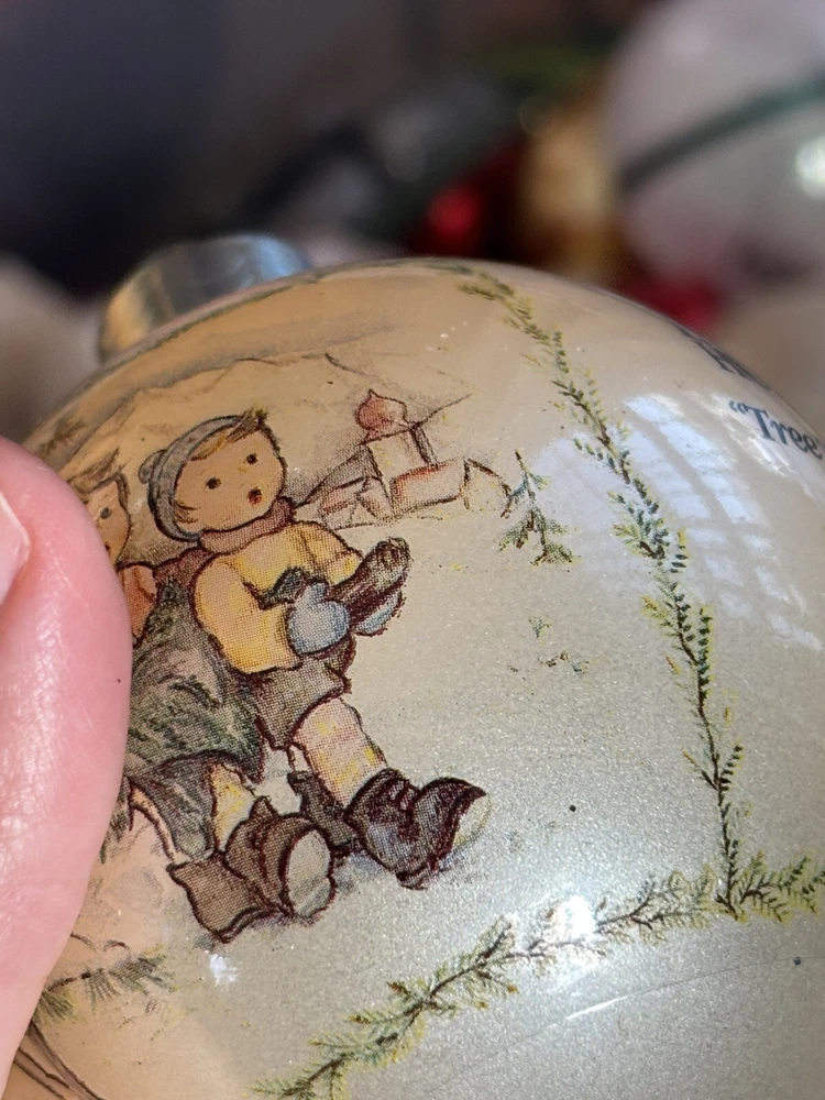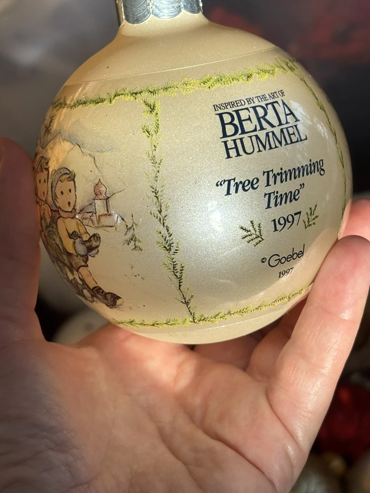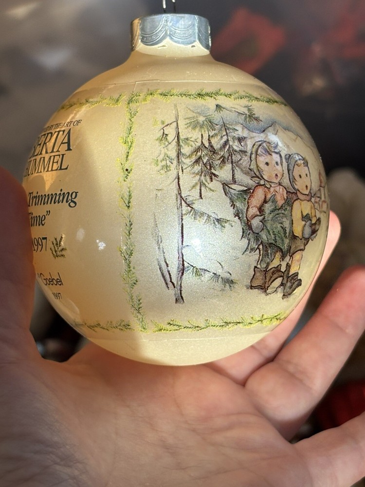 The product is a vintage Berta Hummel Christmas ball from 1997, featuring a tree shape and depicting "Tree Trimming Time." It is part of the collectibles category and would be a charming addition to any holiday ornament collection. The ball is designed with a nostalgic feel and is perfect for decorating a Christmas tree. Vintage ball, normal scuffs
