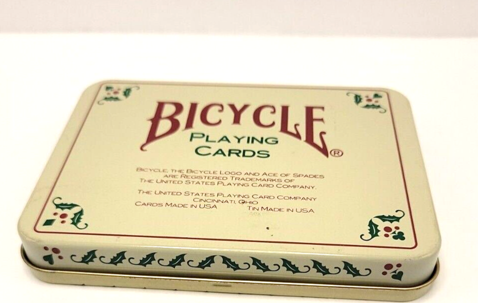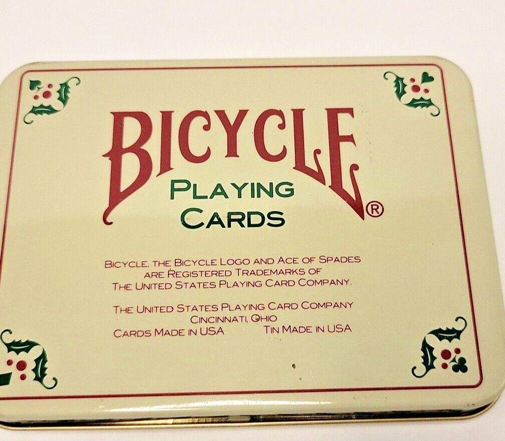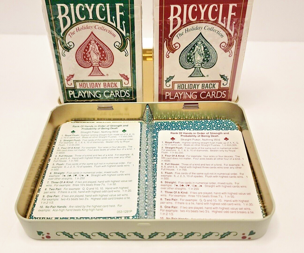 Vintage Two Pack Bicycle Playing Cards THE HOLIDAY COLLECTION in the Original Tin - Both packs have a new look in plastic. I counted all cards. Each deck has all cards + 2 jokers. They have no bent edges or stains. Look unused. The container they are in looks fine and measures 4 1/4" x 5 3/4" Shipped USPS Ground Advantage.
