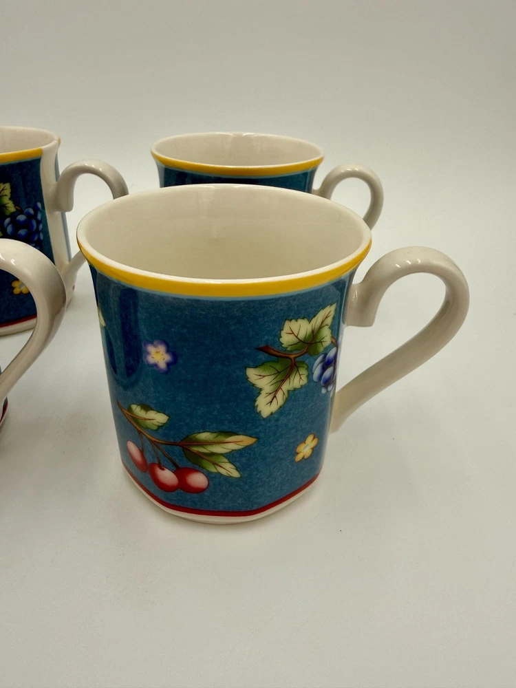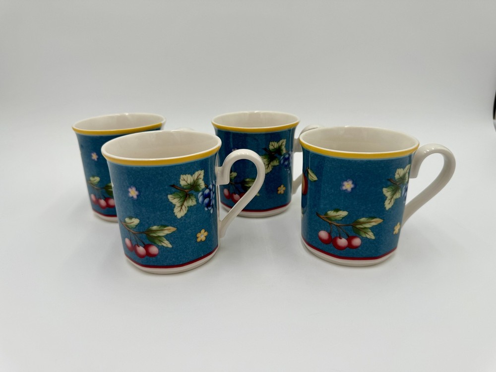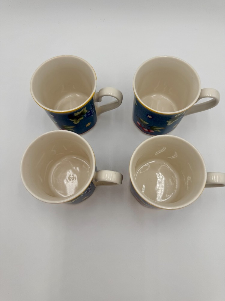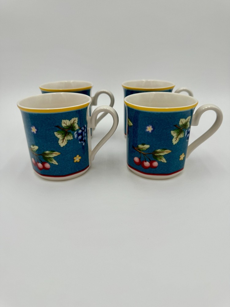 This is a lovely set of Villeroy and Boch mugs with the pattern Biella from the 1990's. There are four mugs in the set. Perfect for entertaining! The details: 3.5" tall x 3.5" diamater Makers mark on the bottom In excellent vintage condition. Minor wear consistent with use and age. No chips or cracks.