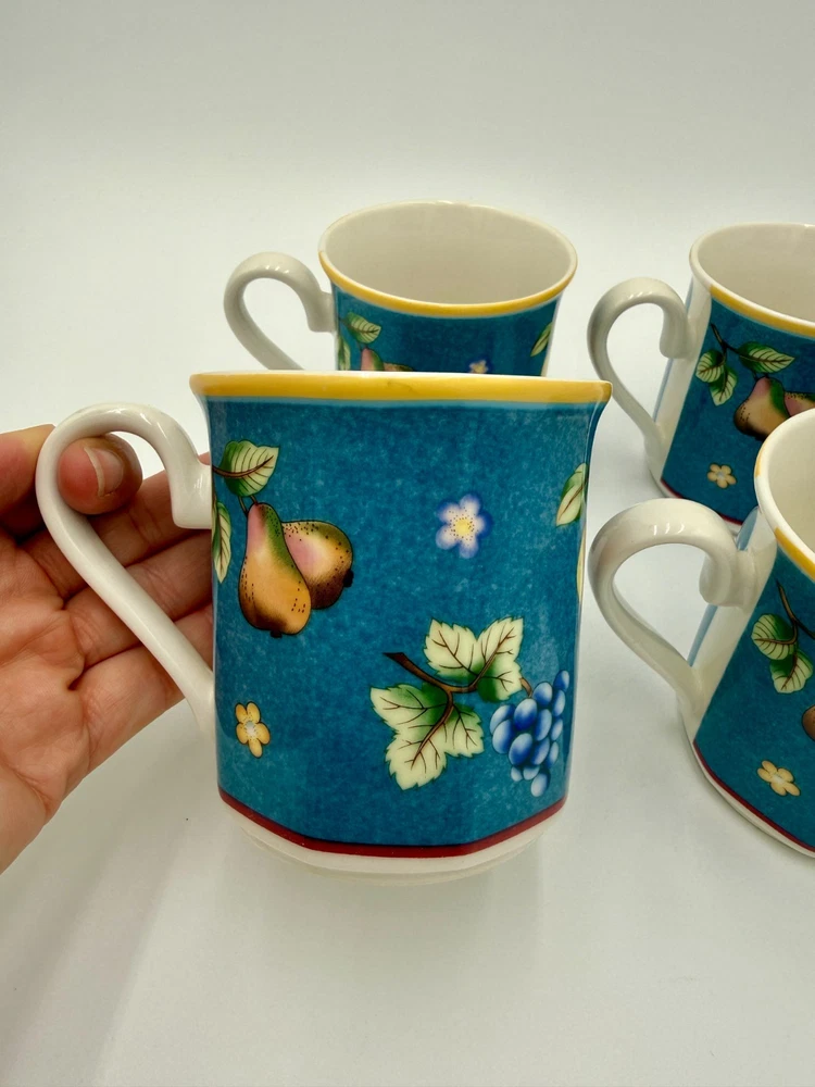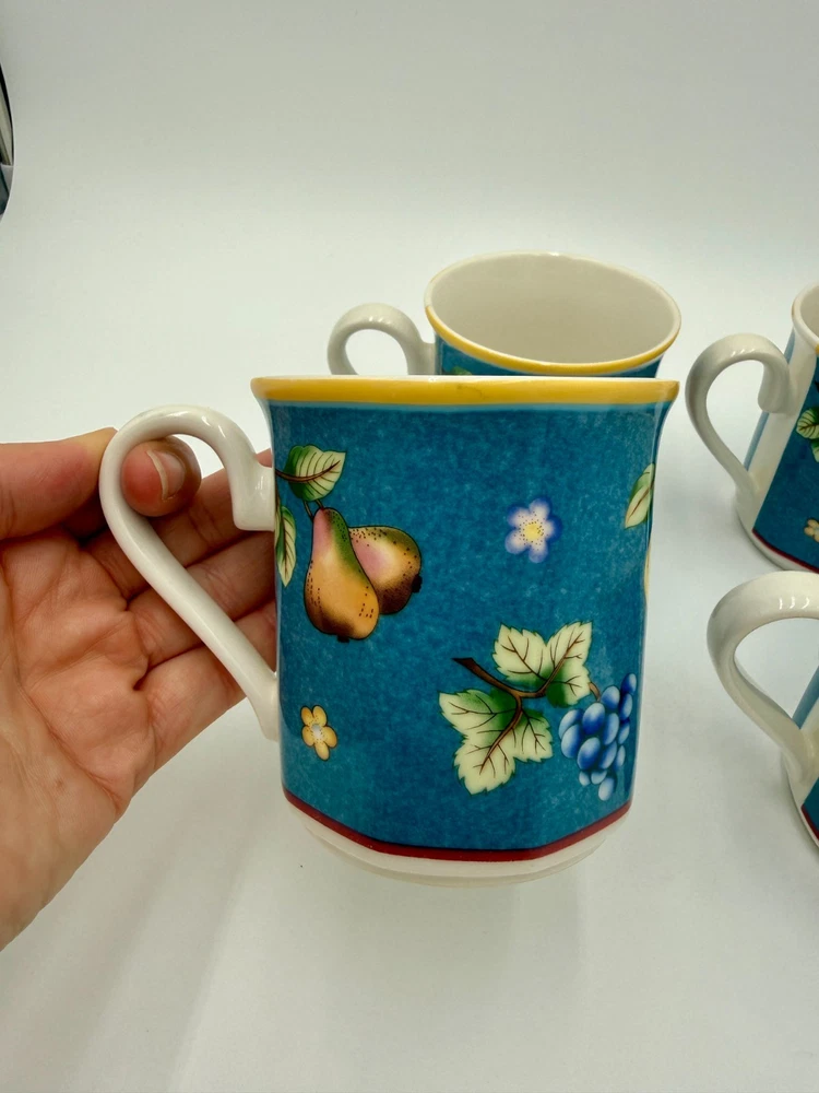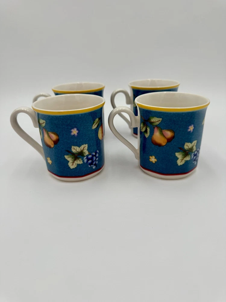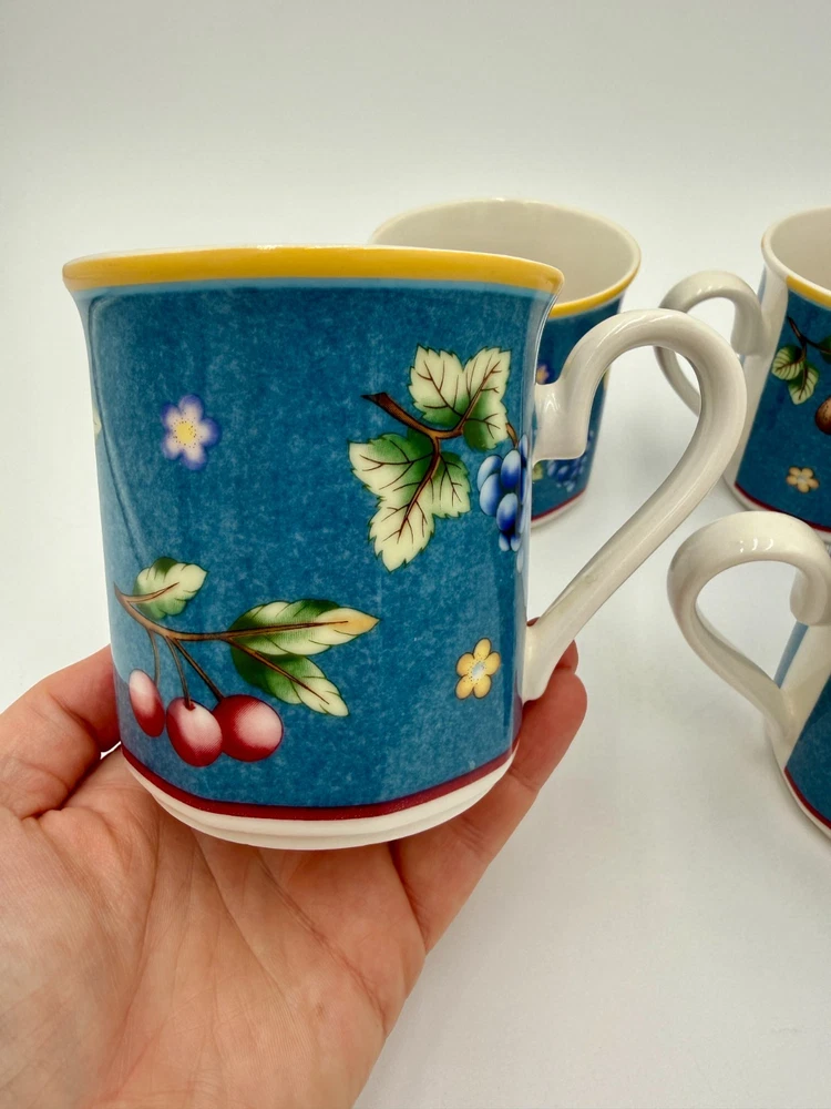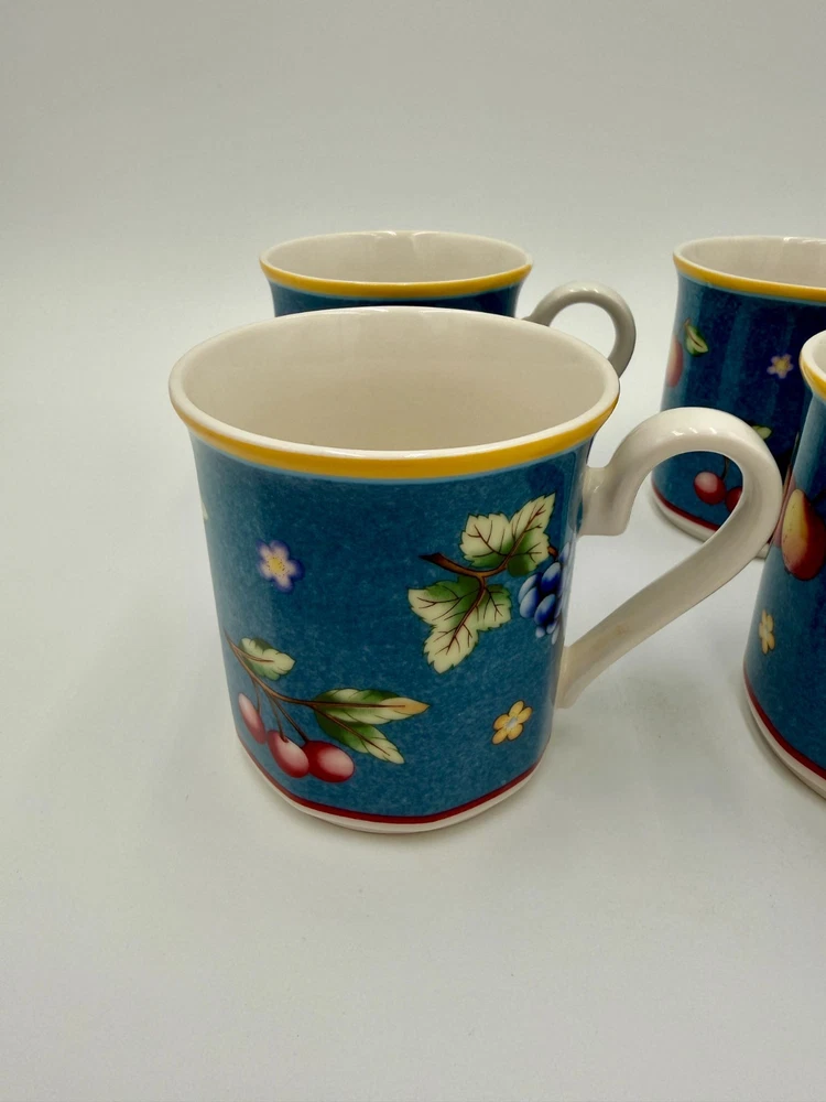 This is a lovely set of Villeroy and Boch mugs with the pattern Biella from the 1990's. There are four mugs in the set. Perfect for entertaining! The details: 3.5" tall x 3.5" diamater Makers mark on the bottom In excellent vintage condition. Minor wear consistent with use and age. No chips or cracks.