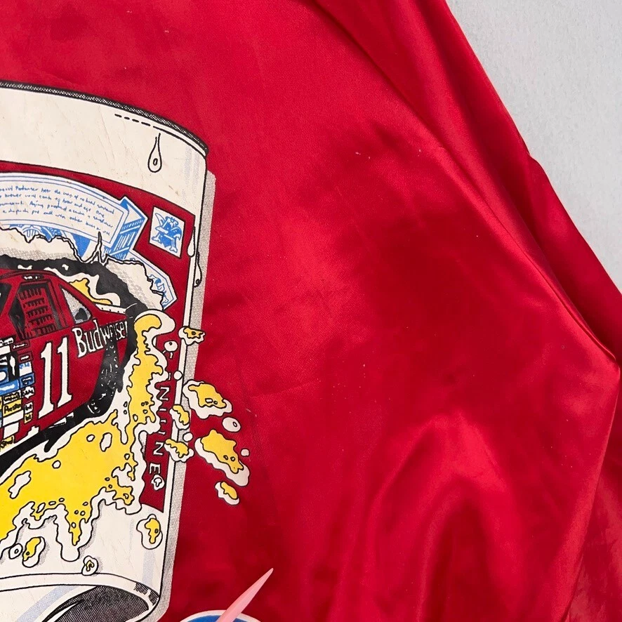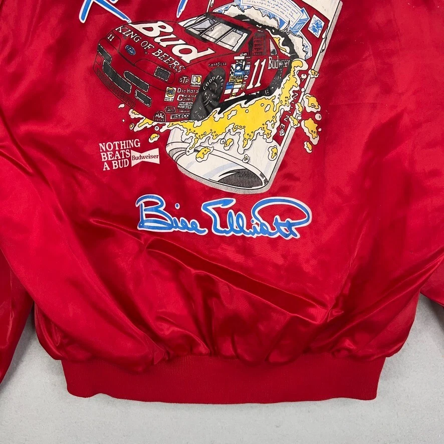 This vintage Bill Elliott jacket is a must-have for NASCAR fans! The bold red satin bomber features awesome double-sided Budweiser racing graphics and still holds up well despite some minor wear and spots. No rips or holes—just classic racing vibes in a solid XL fit. Made in the USA with that retro charm, it’s perfect for collectors or anyone who loves throwback racing gear. Check the measurements to ensure the best fit, but this piece is a total score for fans of Elliott’s legacy!