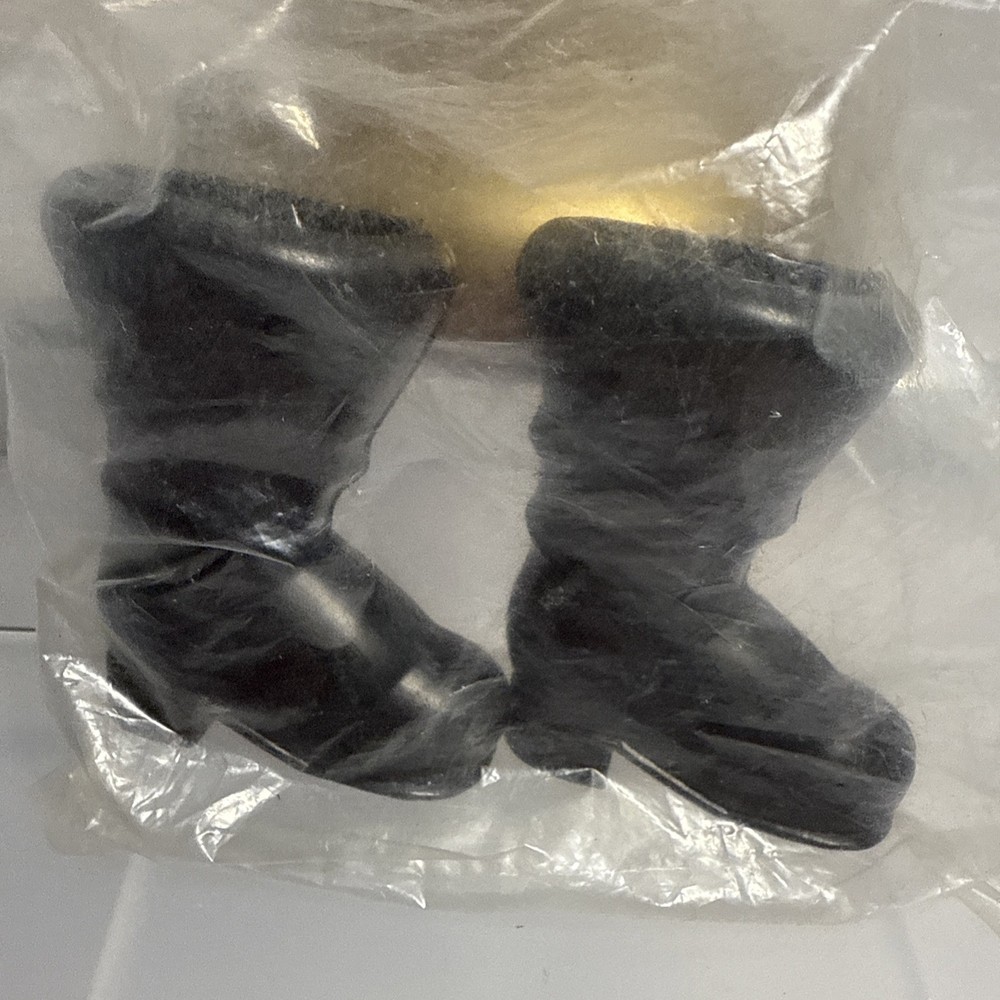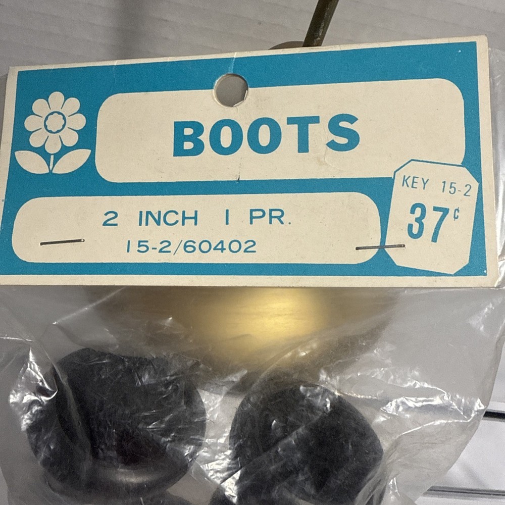 This product is a pair of vintage black blow mold plastic Santa boots, featuring a small size and classic Santa boot design. Made in Japan during the 1950s, these boots are new in their original packaging and are perfect for adding a touch of nostalgia to your Christmas decor or replacing boots on your favorite Santa. With a seasonal theme and durable plastic material, these boots are a charming and unique addition to any collection of holiday figurines.
