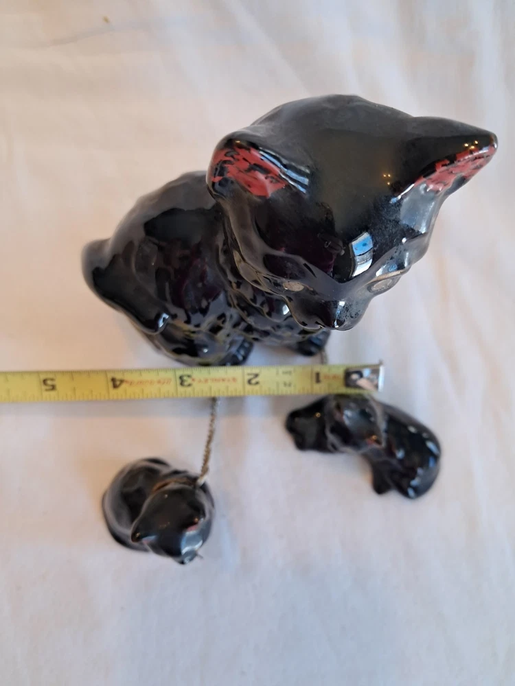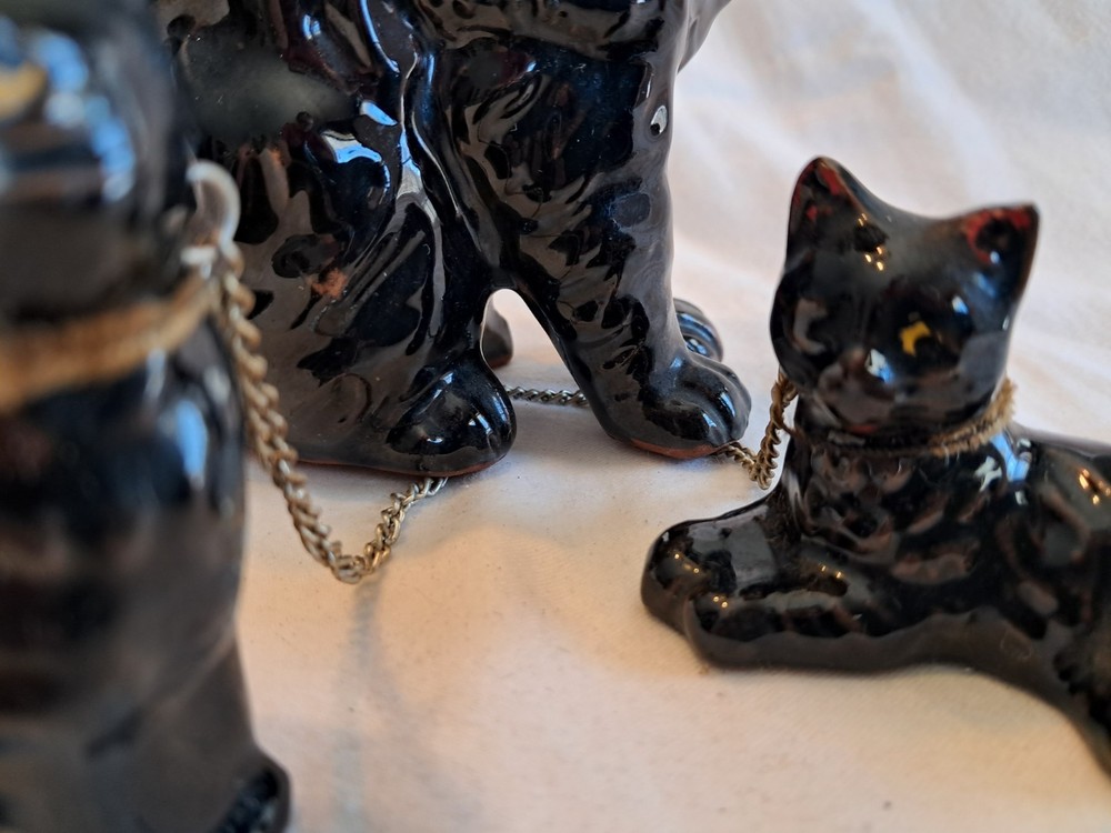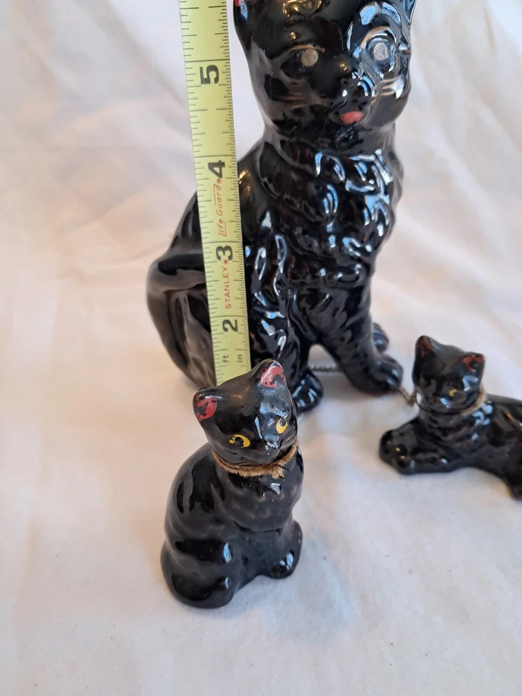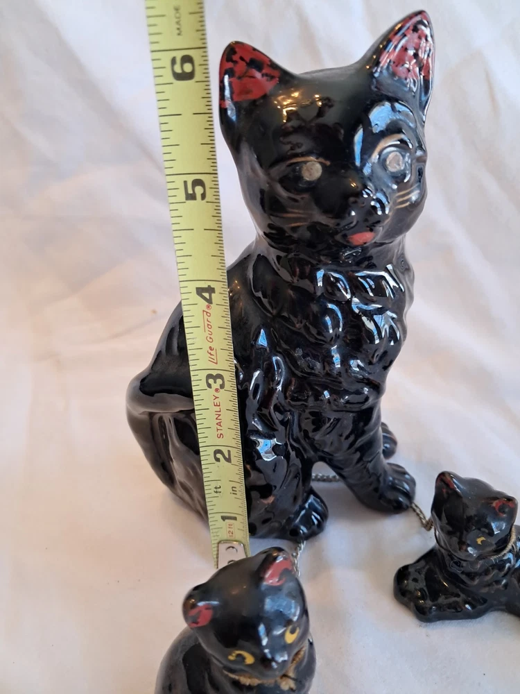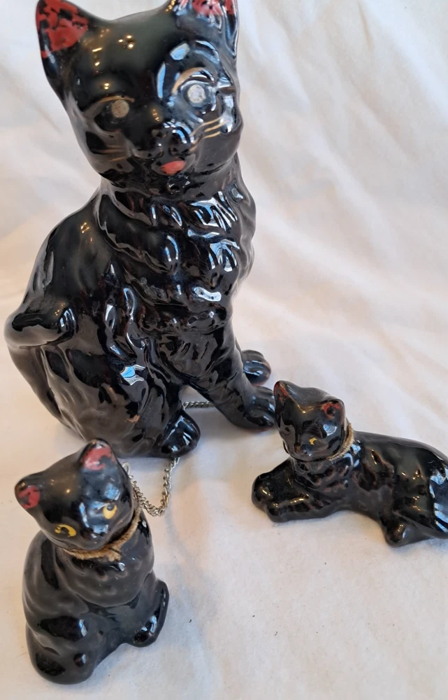 Vintage ARTMARK Black Ceramic Cat Family Figurine Set A wonderful, collectible mid-century black ceramic cat family imported by Artmark. This listing includes three pieces —one large 6-inch adult cat and two smaller kittens connected by a chain. Configuration Note: The chain is currently only attached to the two kittens. It is highly probable that the chain originally connected to a collar on the main cat, which has since deteriorated a common occurrence for these vintage sets. The three cats are meant to be displayed together as a family group. Key Details: Brand: Artmark (Artmark Chicago) Pieces: Set of 3 figurines (Large cat & 2 chained kittens). Era: Mid-Century Modern (MCM), likely 1950s-1960s. Markings: Original red and gold diamond-shaped Artmark sticker on the base of the large cat. Material: High-gloss black glazed ceramic over an unglazed reddish clay base ( terracotta/redware ). Condition: Excellent vintage condition. No chips, cracks, or repairs. The chain on the kittens is intact. The small collars on the kittens show minor deterioration consistent with age. Size: Large cat measures approximately 6 inches tall.